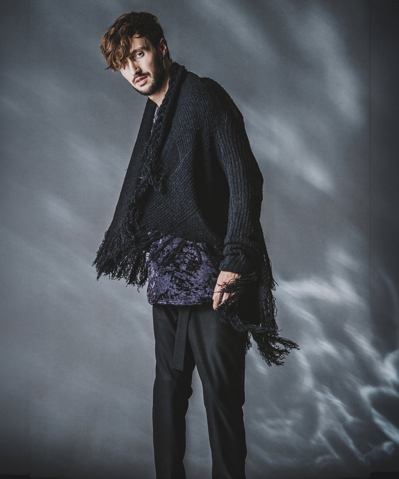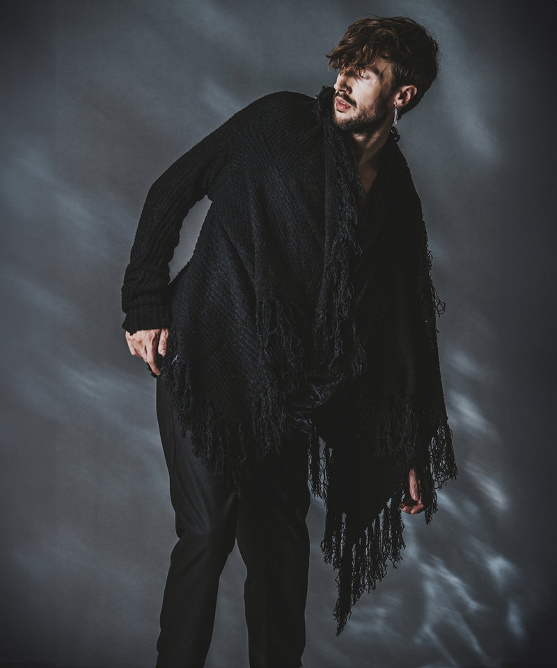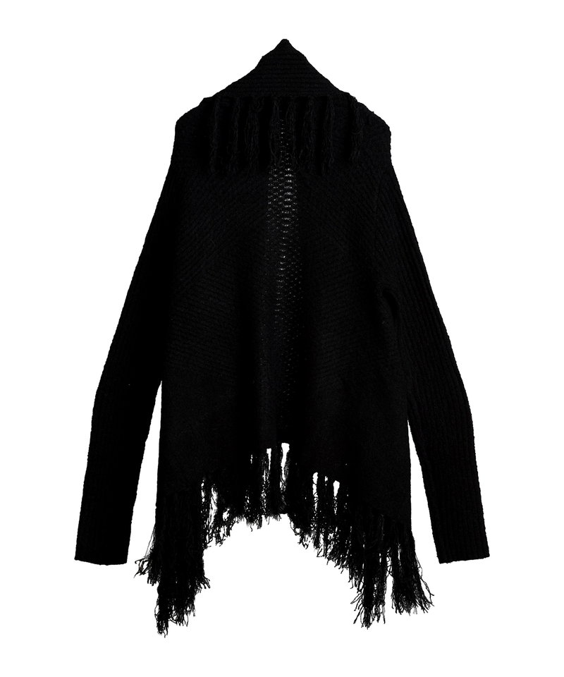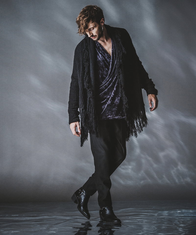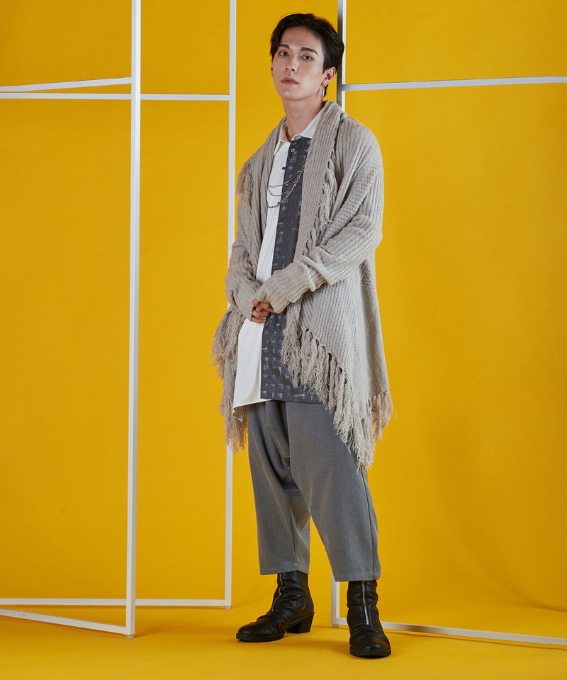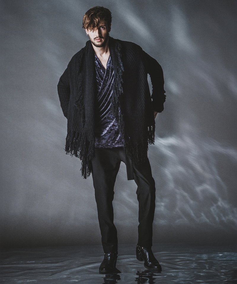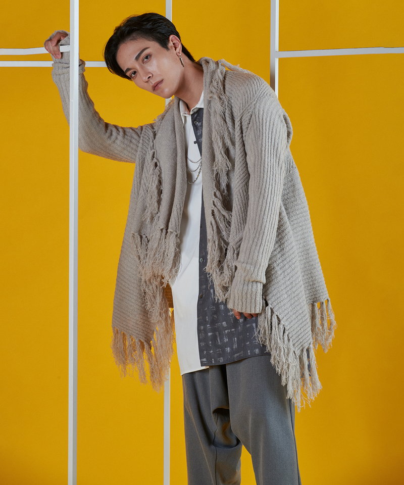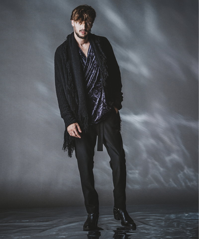 マフラーに多く見られるフリンジをガウンに落とし込み動きのあるデザインニットに仕上げた本作。ニットの伸縮性を活かした細身のシルエットはコートの中に着ても着膨れせずレイヤードスタイルを堪能でき生地のドレープ感が独創的なスタイルを演出してくれる。逆さまにして袖を通す事でドレープの雰囲気や着丈が変化して異なる表情に。またはストールとして使ってネックラインにボリュームを持たせたりとマルチな着こなしを楽しめるアイテム。