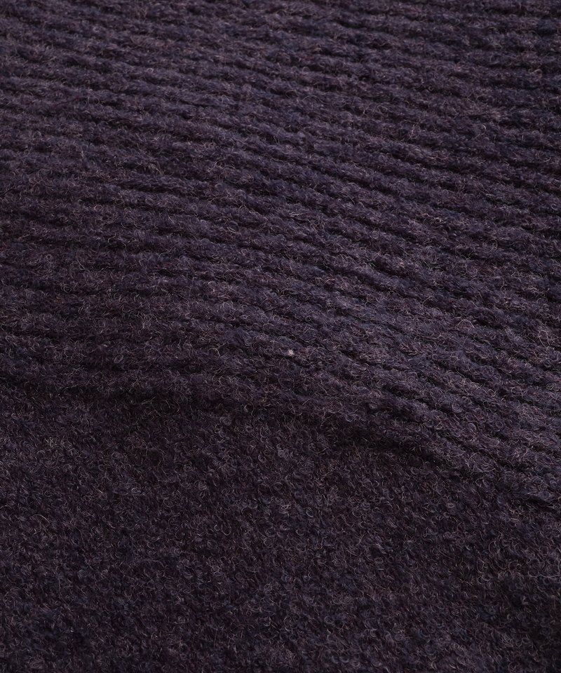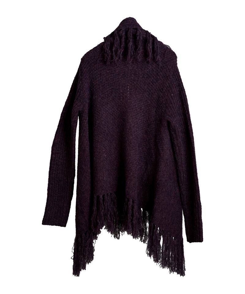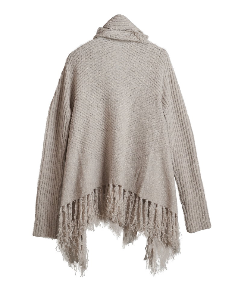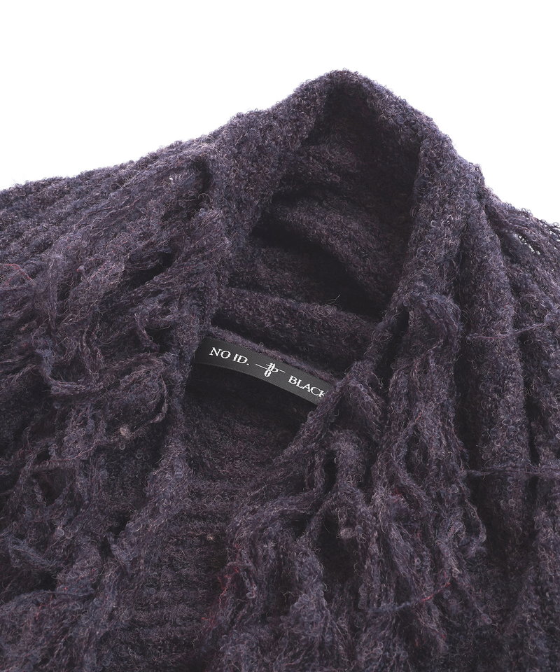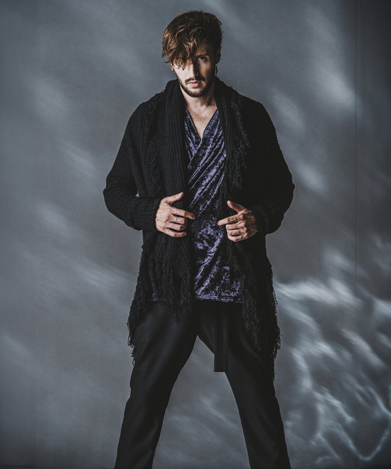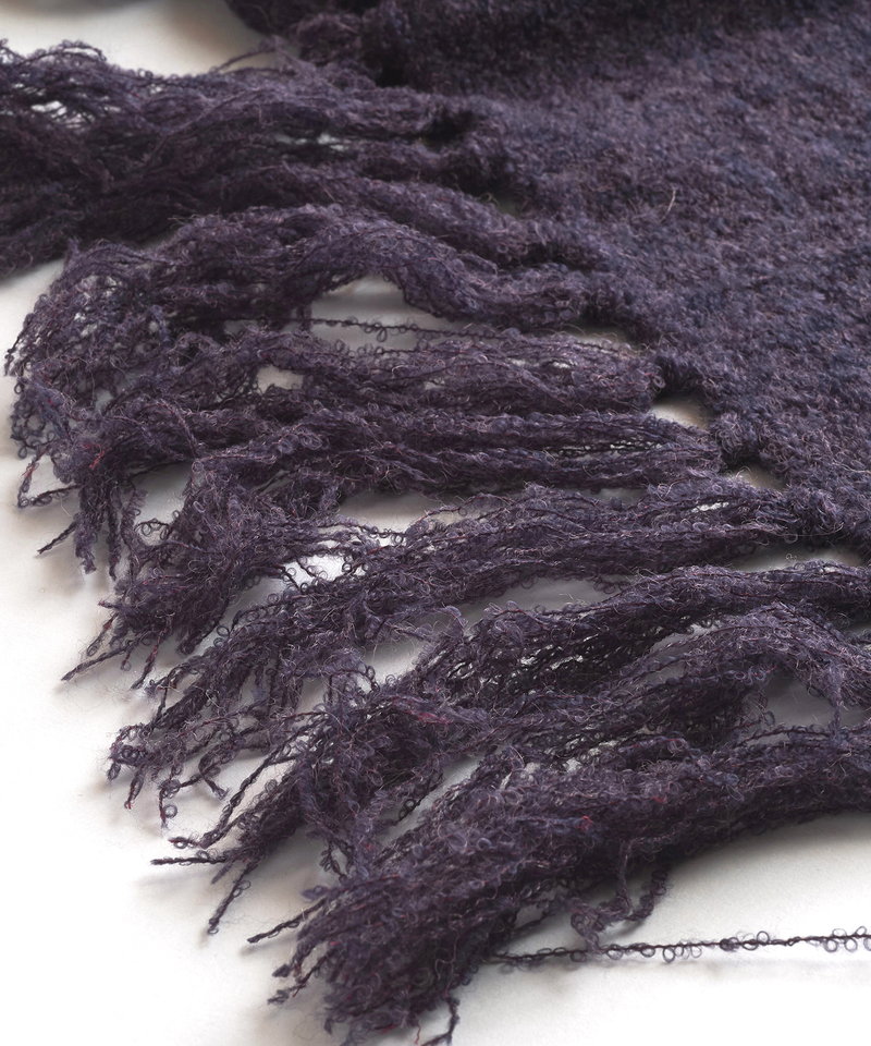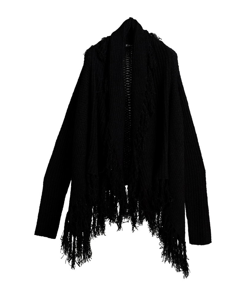 マフラーに多く見られるフリンジをガウンに落とし込み動きのあるデザインニットに仕上げた本作。ニットの伸縮性を活かした細身のシルエットはコートの中に着ても着膨れせずレイヤードスタイルを堪能でき生地のドレープ感が独創的なスタイルを演出してくれる。逆さまにして袖を通す事でドレープの雰囲気や着丈が変化して異なる表情に。またはストールとして使ってネックラインにボリュームを持たせたりとマルチな着こなしを楽しめるアイテム。