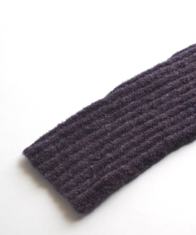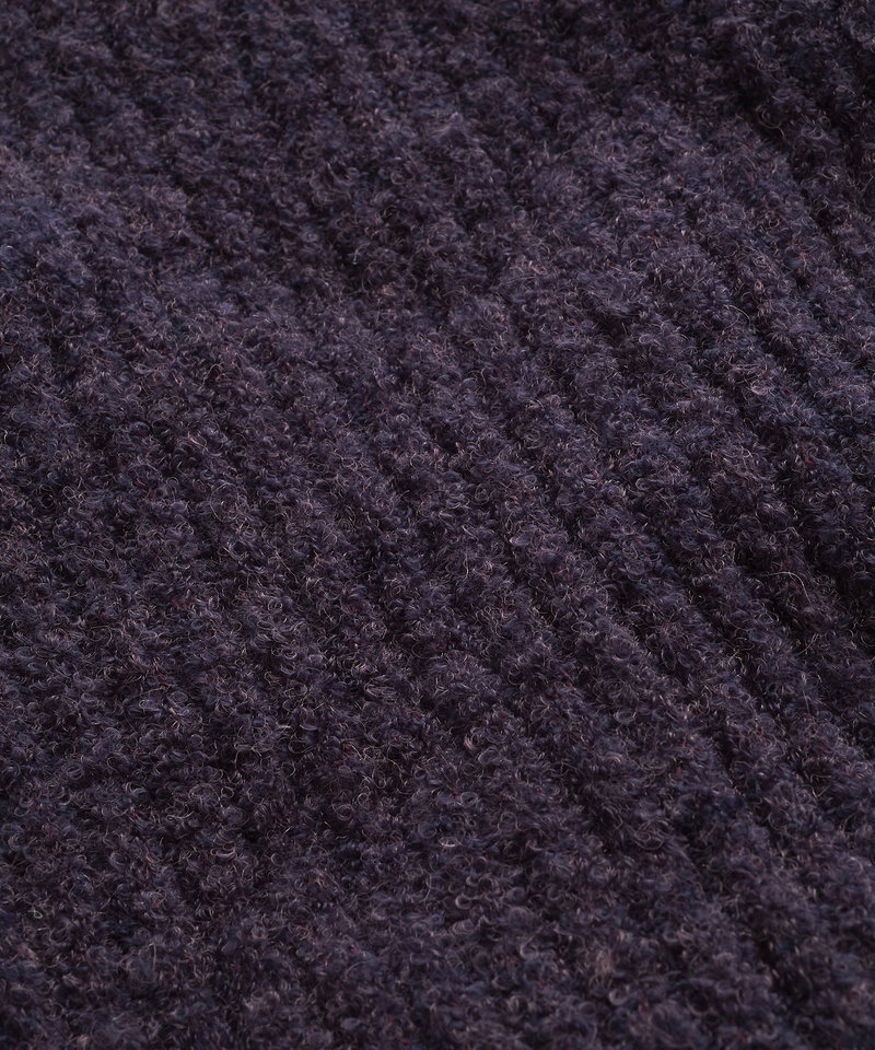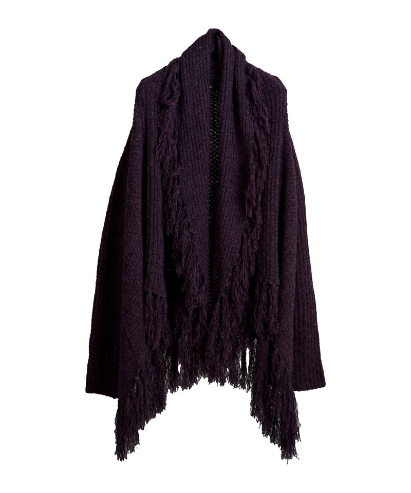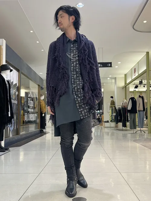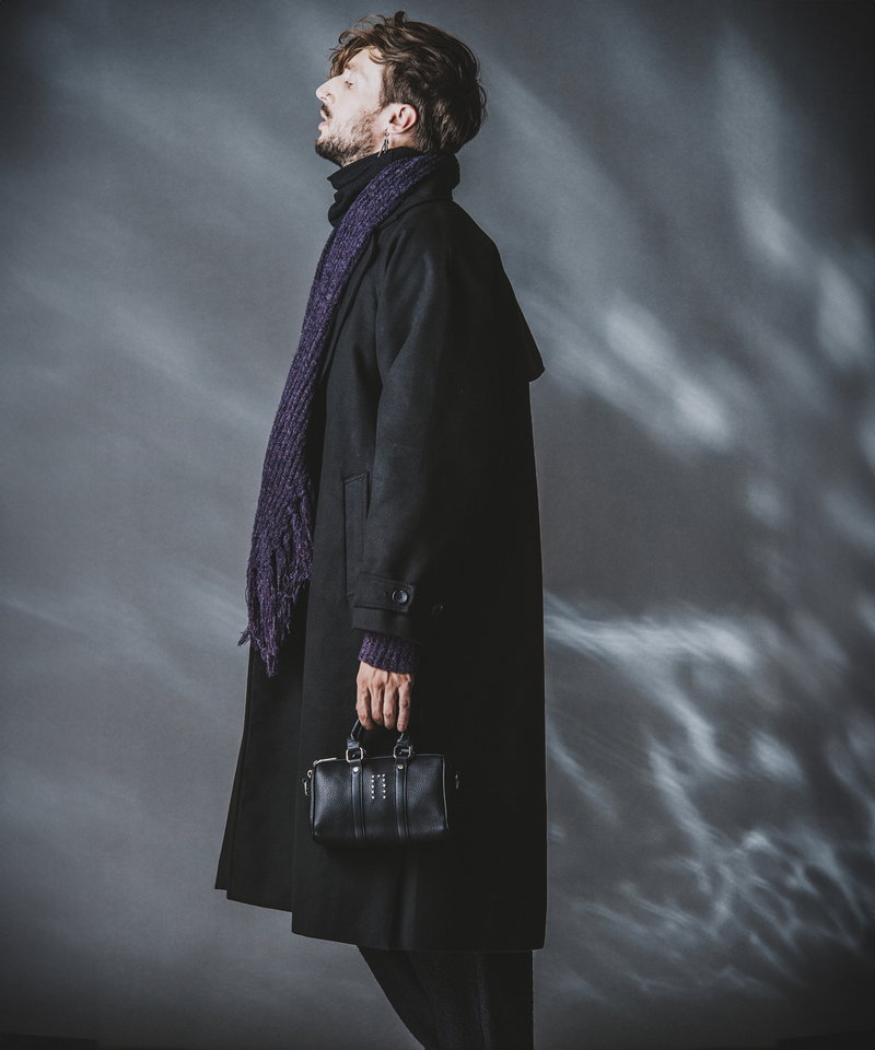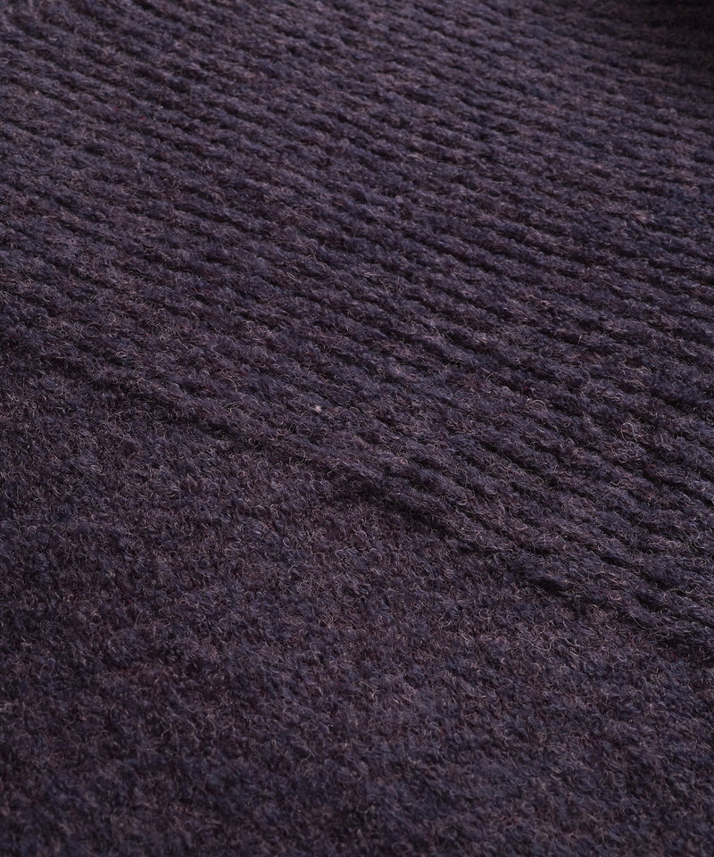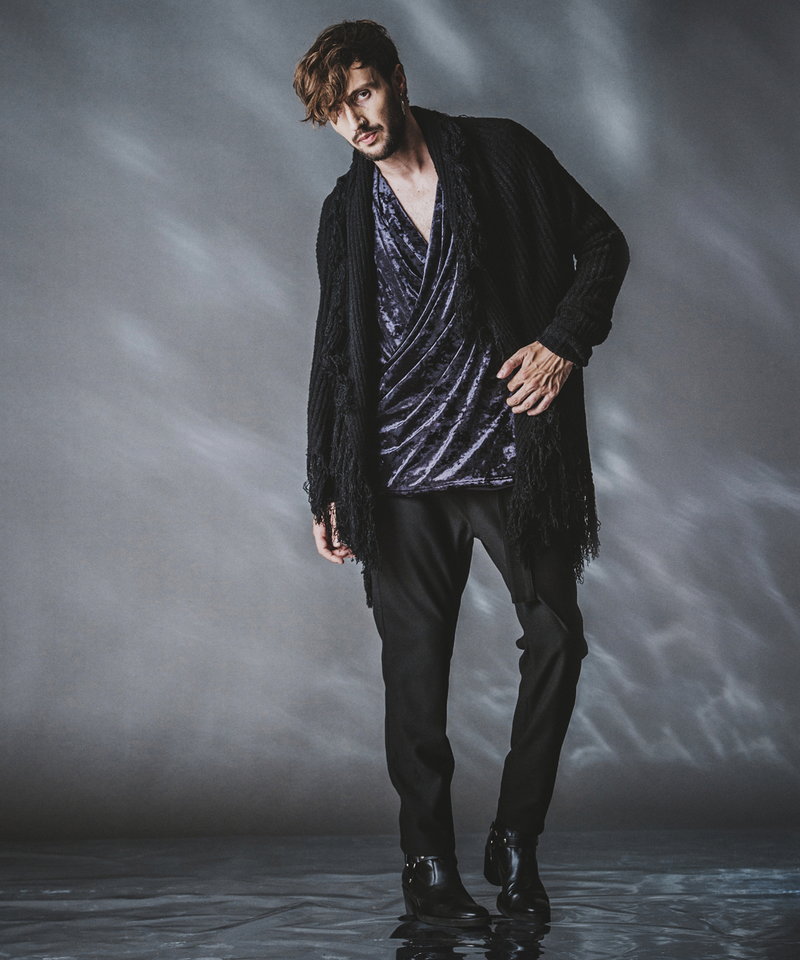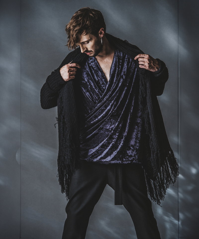 マフラーに多く見られるフリンジをガウンに落とし込み動きのあるデザインニットに仕上げた本作。ニットの伸縮性を活かした細身のシルエットはコートの中に着ても着膨れせずレイヤードスタイルを堪能でき生地のドレープ感が独創的なスタイルを演出してくれる。逆さまにして袖を通す事でドレープの雰囲気や着丈が変化して異なる表情に。またはストールとして使ってネックラインにボリュームを持たせたりとマルチな着こなしを楽しめるアイテム。