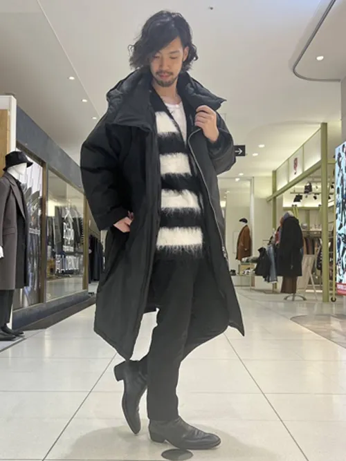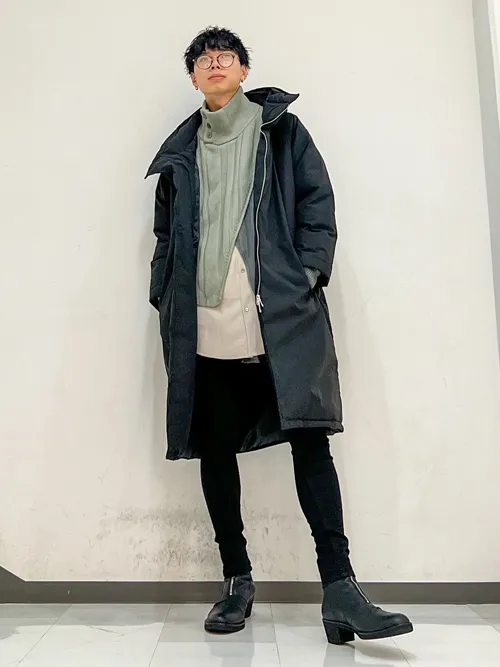 首を覆う様な高襟のフードライン、膝下まで隠れるロングシルエットによって隙間から風を防ぎ高い防寒性を発揮。