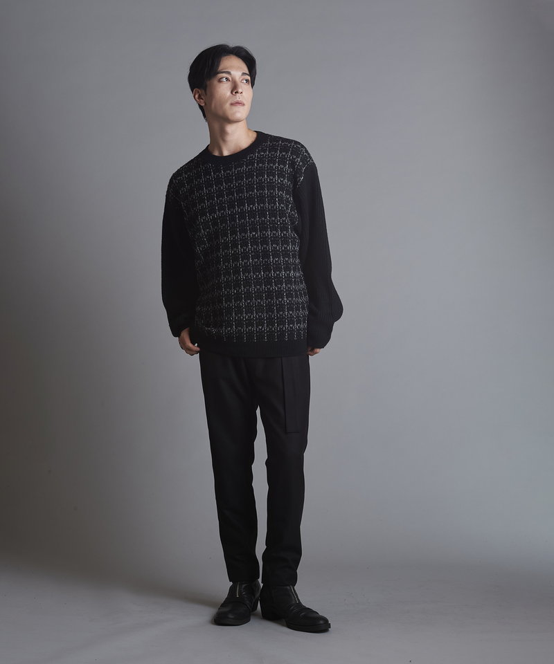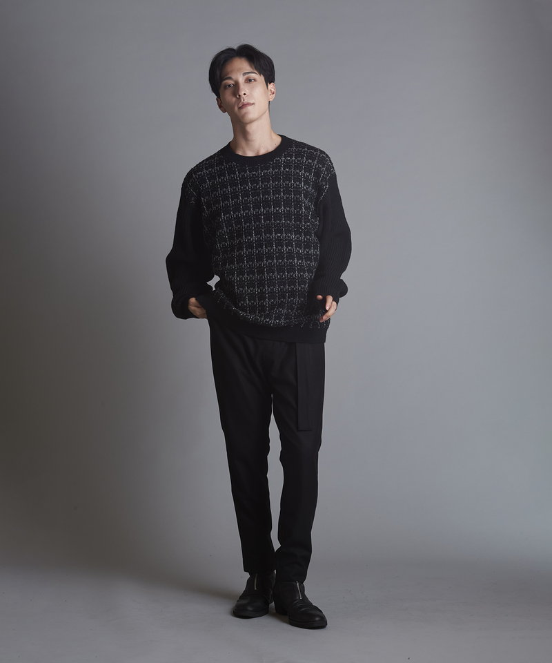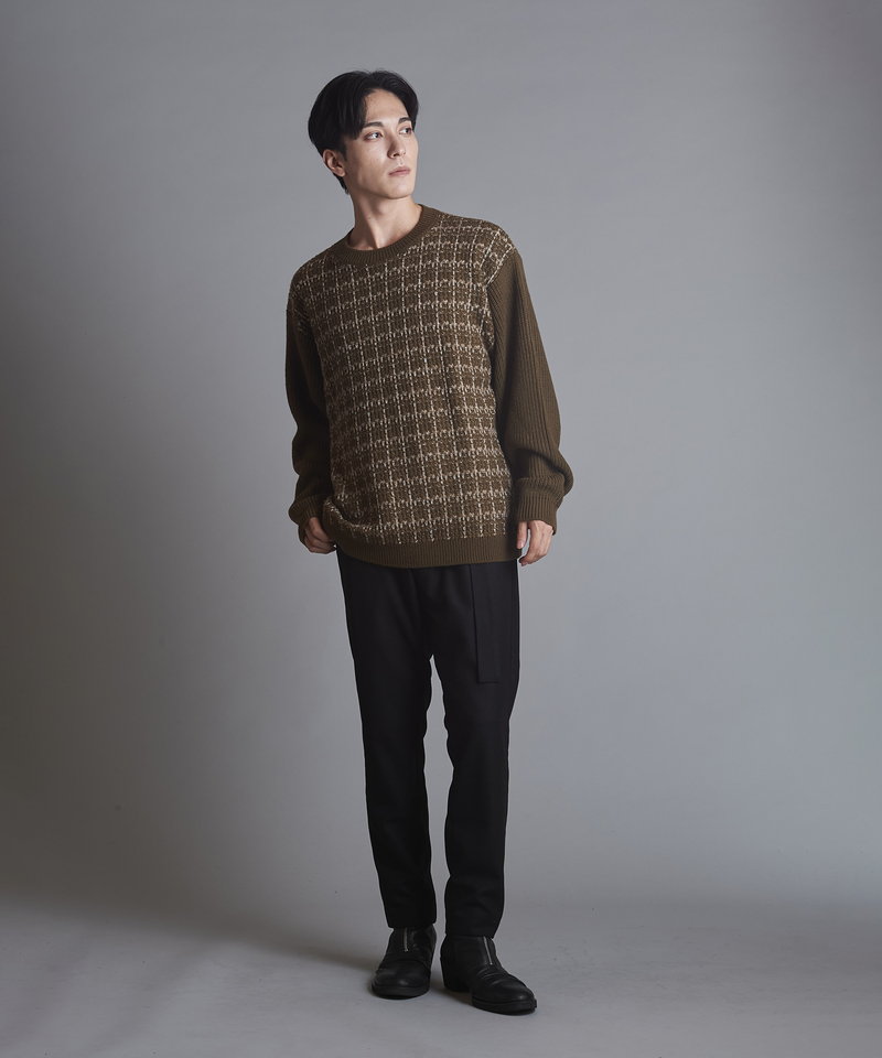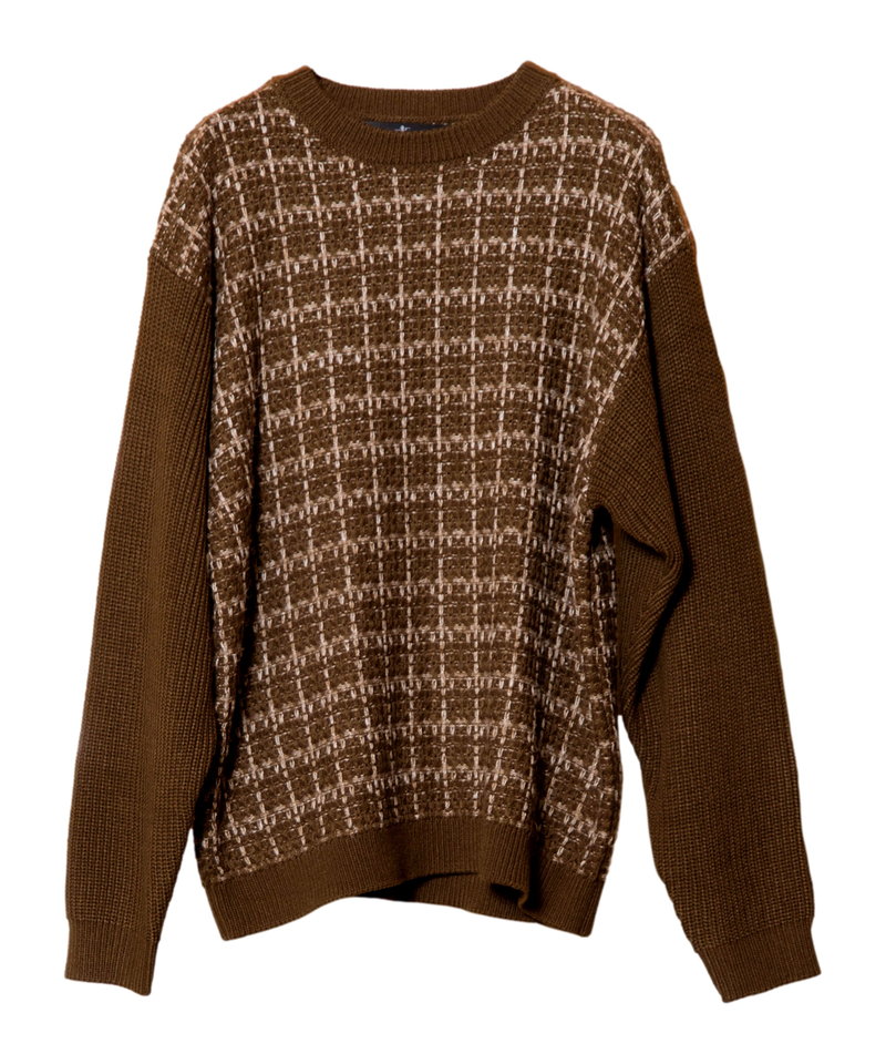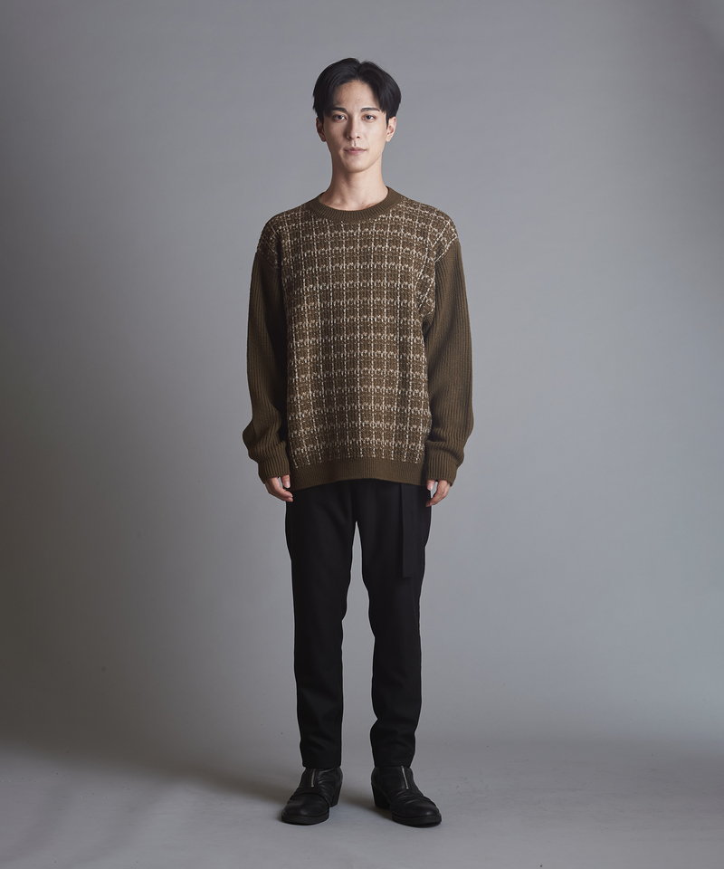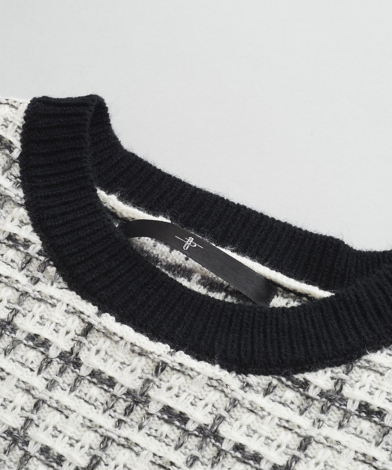 質感の異なる2種類の糸を組み合わせて、ツイード柄を表現したプルオーバーニット。