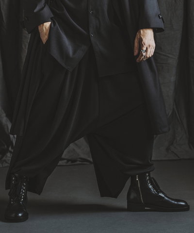 同じ生地で作られたラップスカートバギートラウザーズとのセットアップスタイルもお勧め。