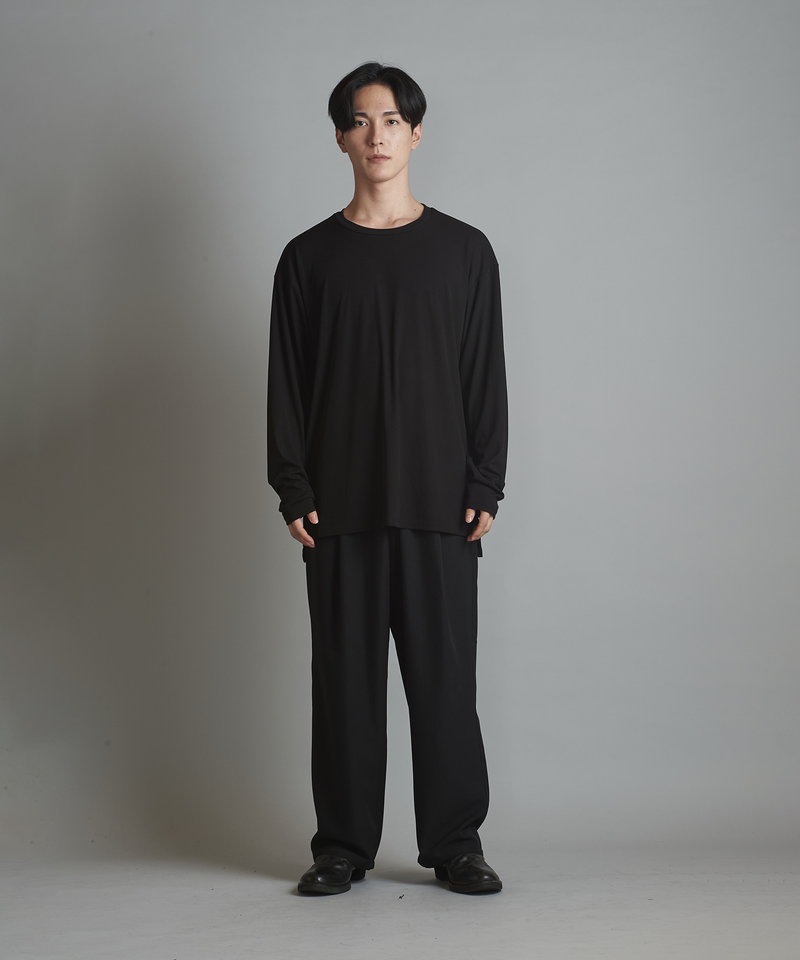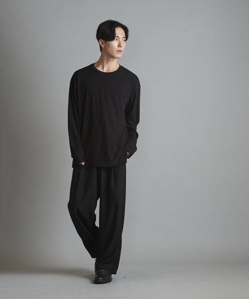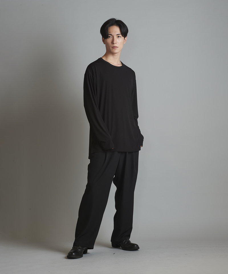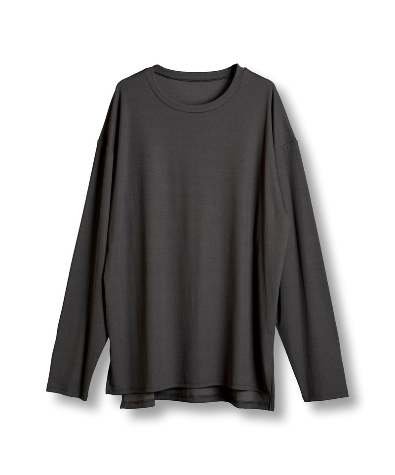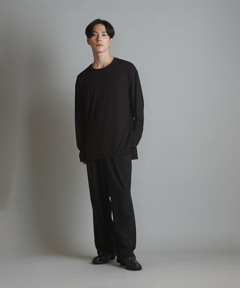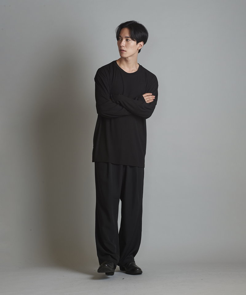 インナーには着丈の異なるロングカットソーをセットし、ニットとのレイヤードを考慮したやや長めの設定。