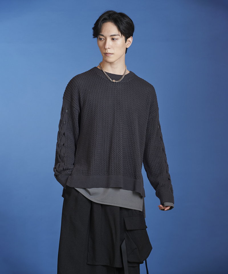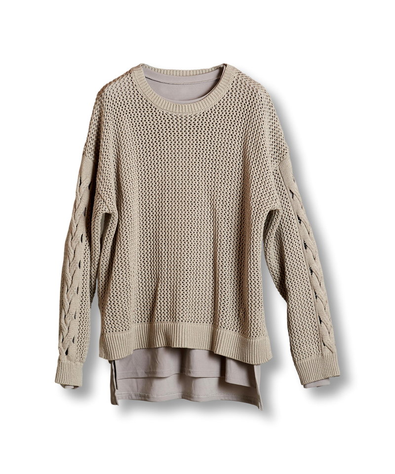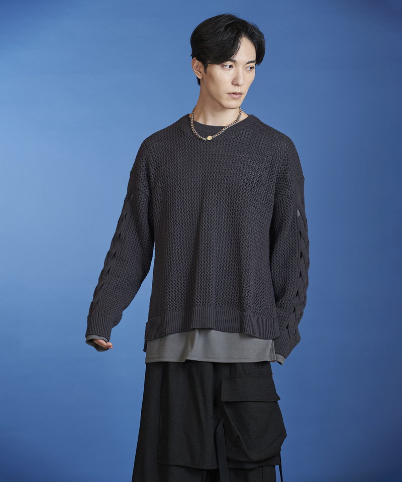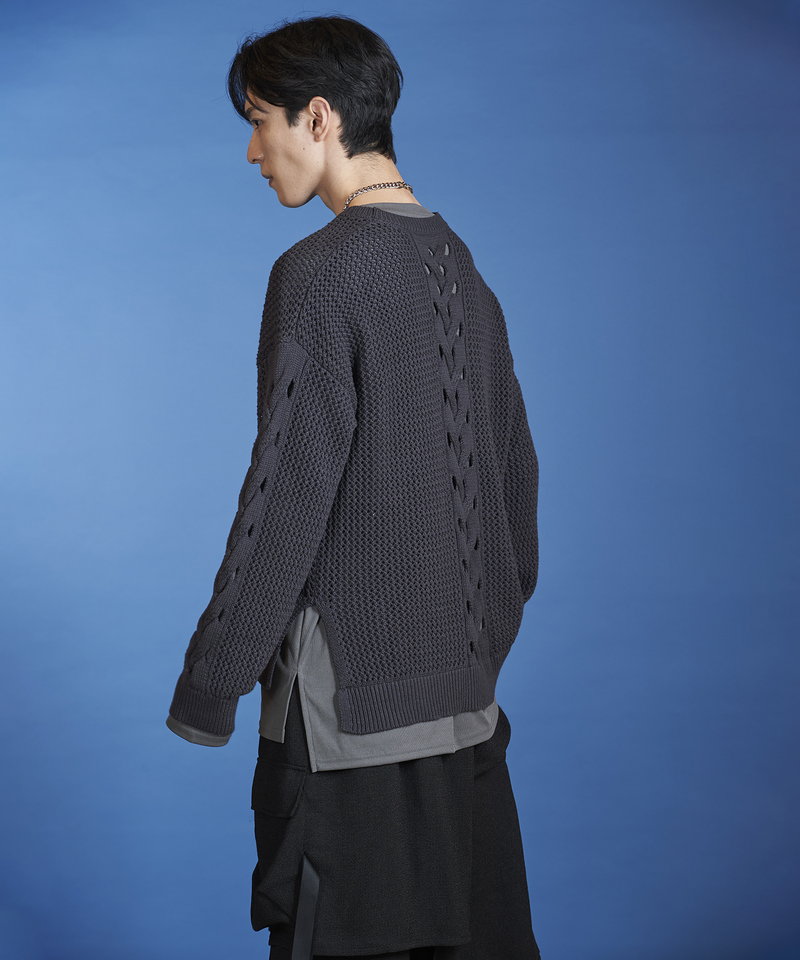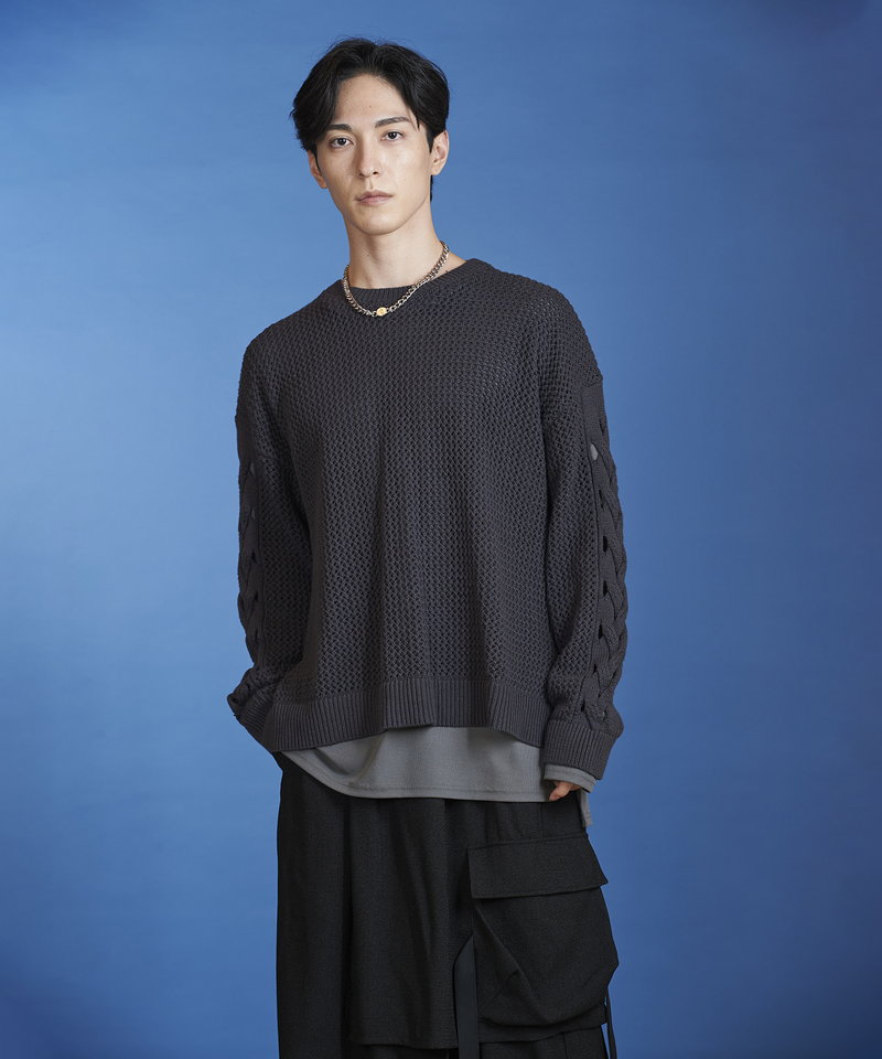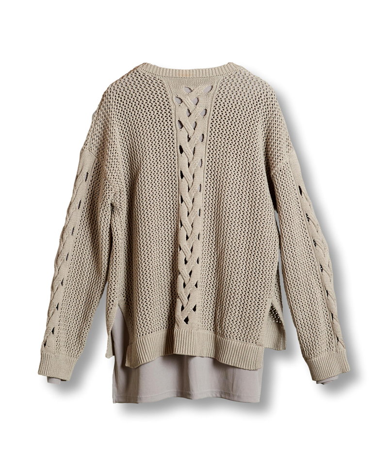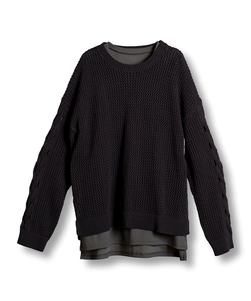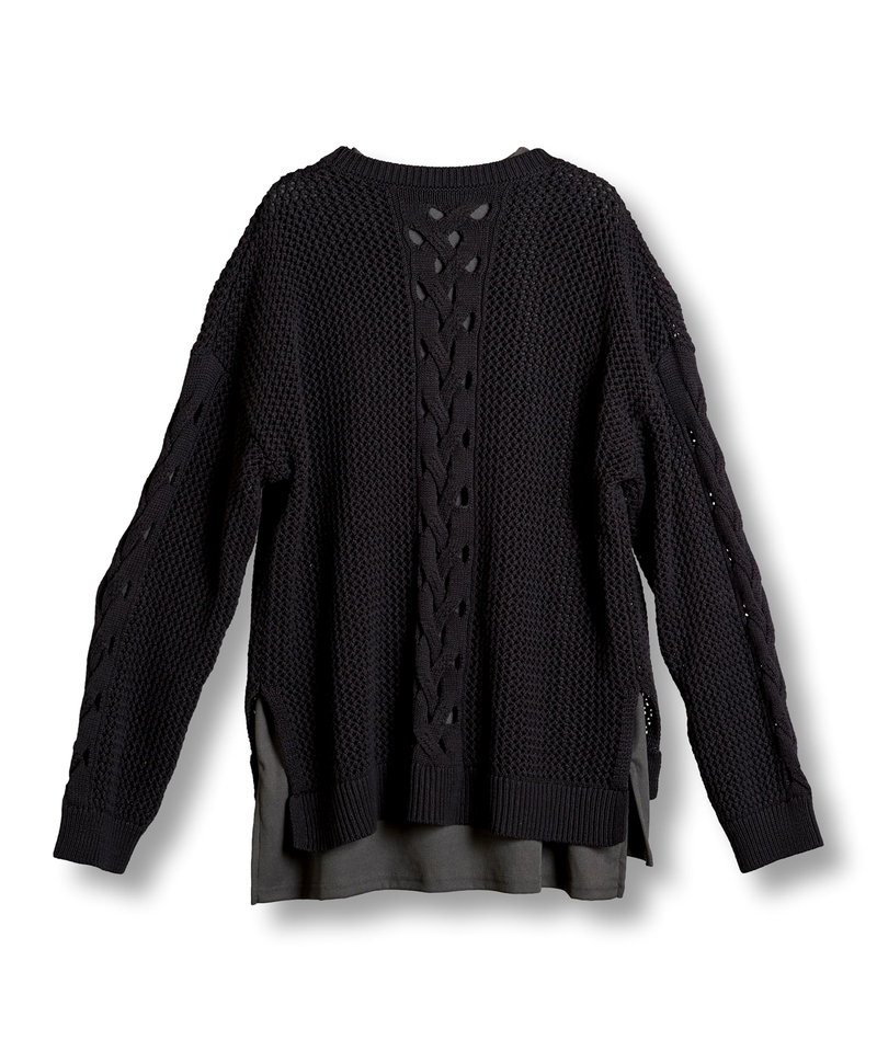 袖、背面にあしらったレースアップ仕様の透かし編みアクセントが目を引くレイヤードニットプルオーバー。