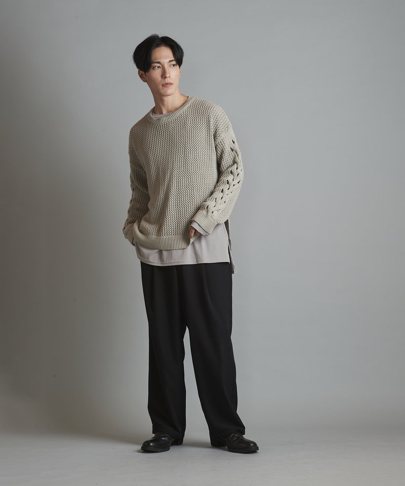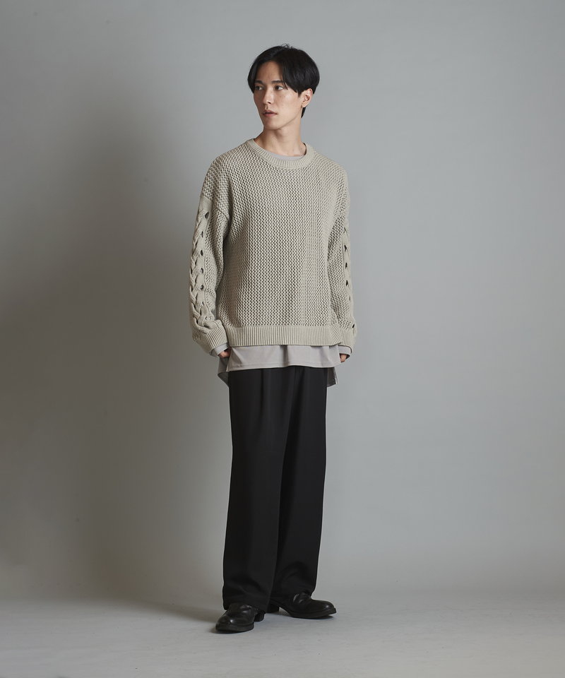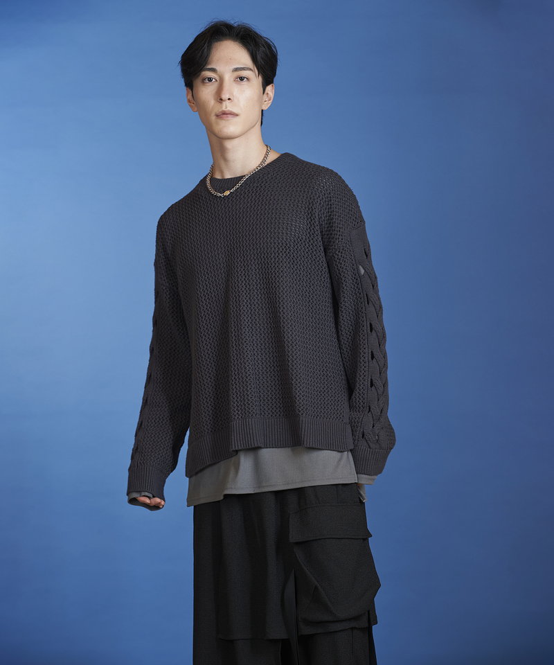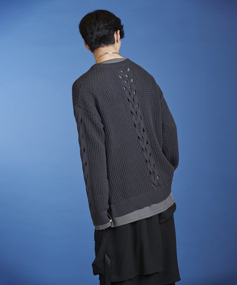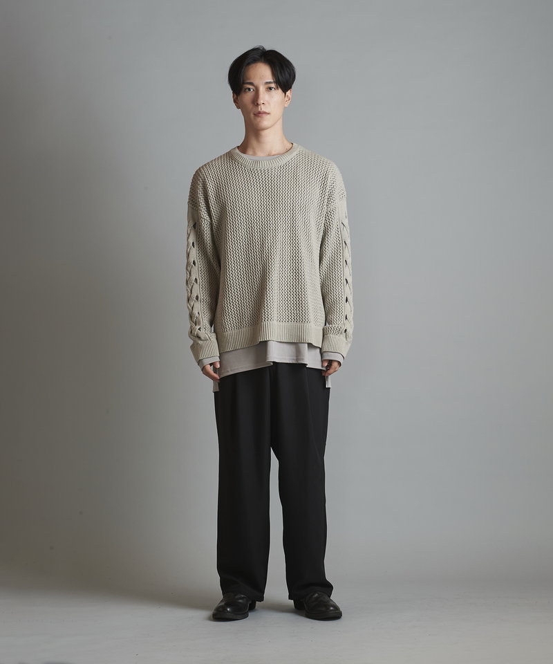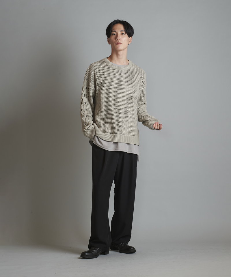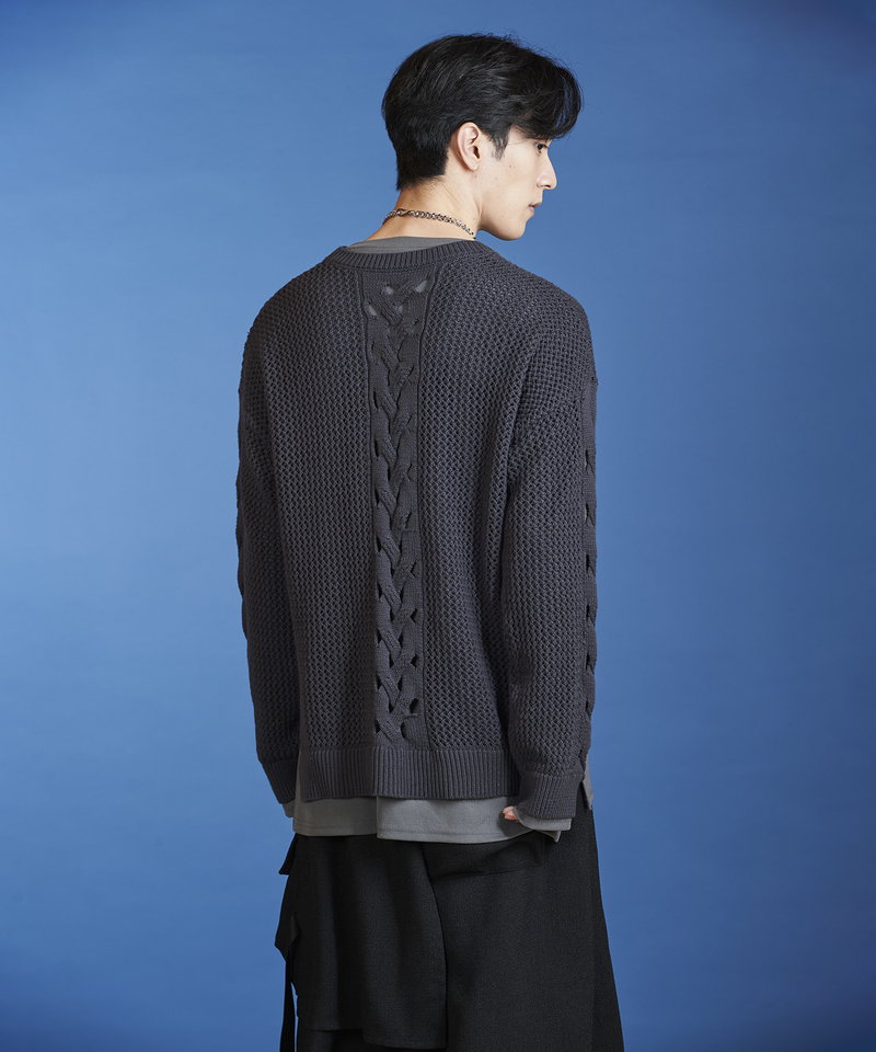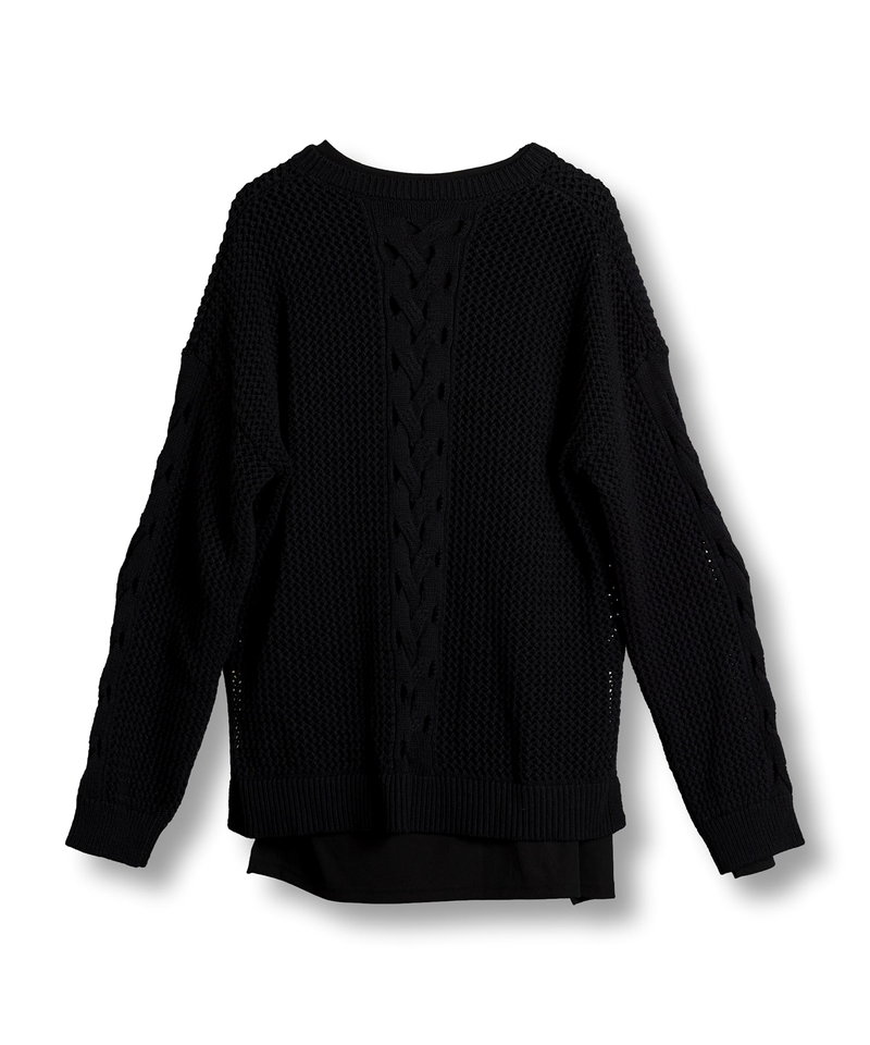 袖、背面にあしらったレースアップ仕様の透かし編みアクセントが目を引くレイヤードニットプルオーバー。
