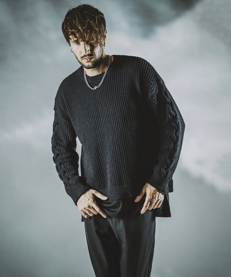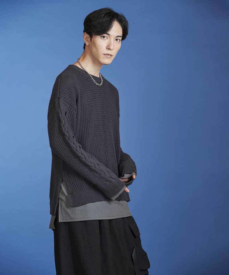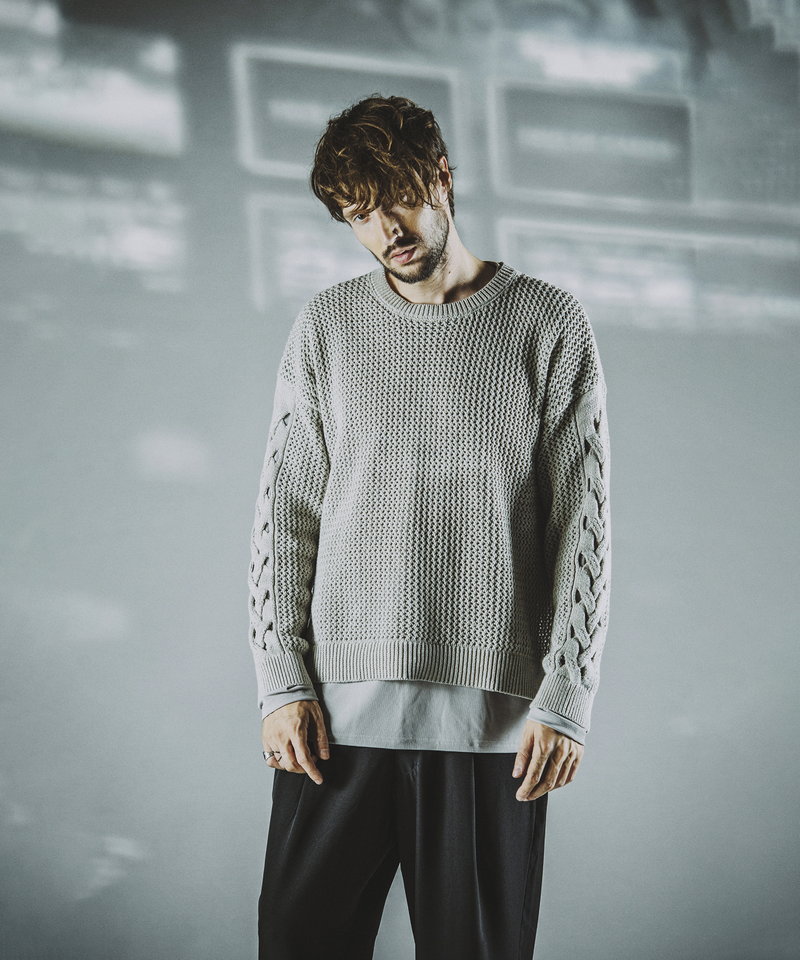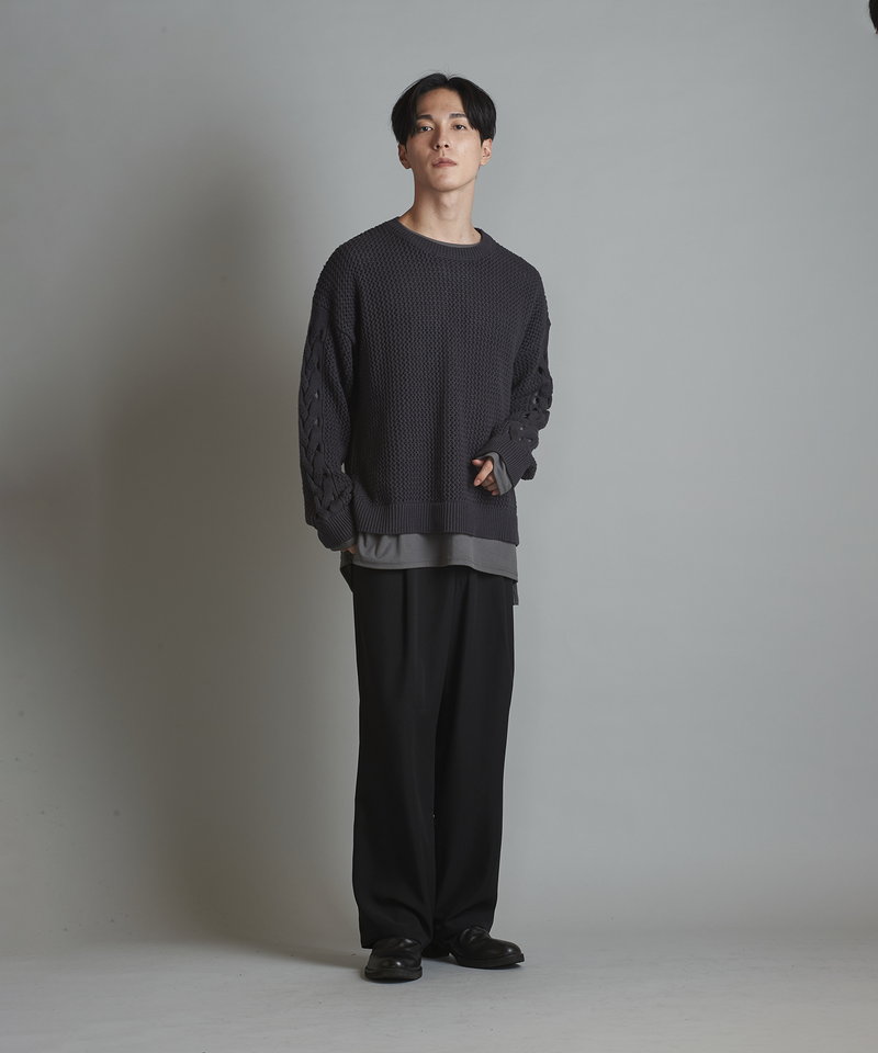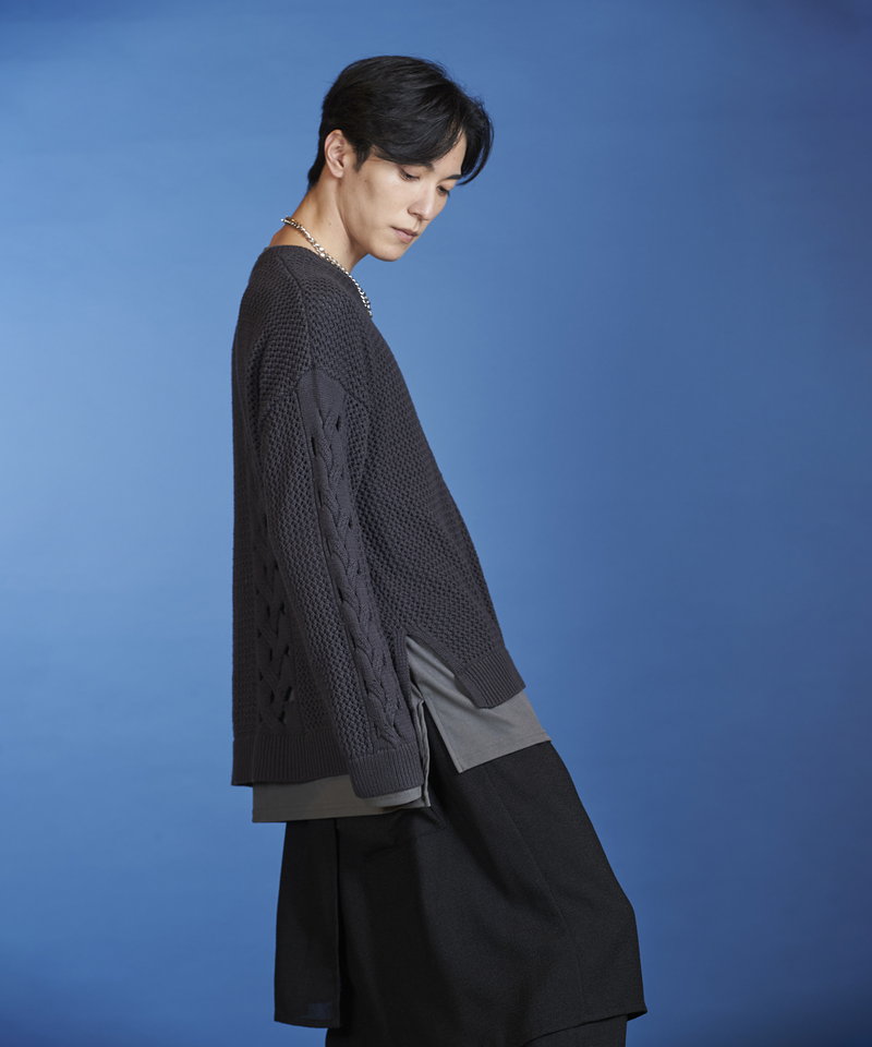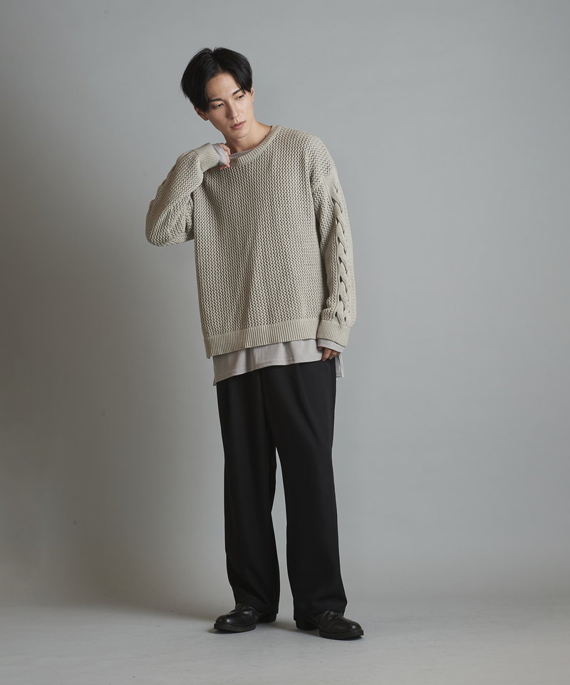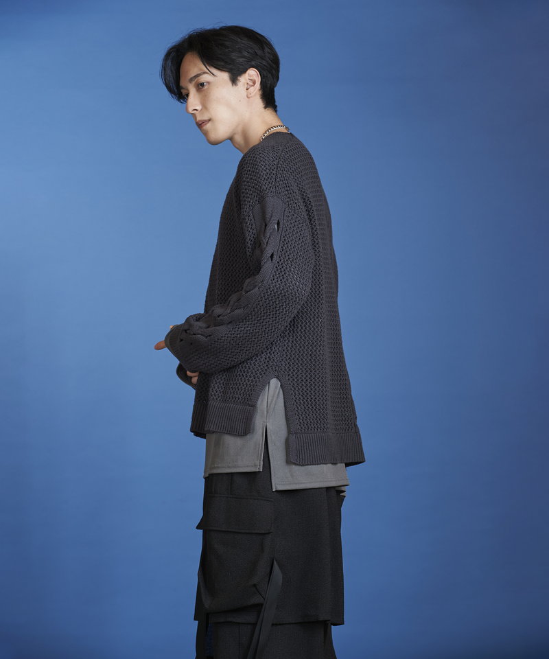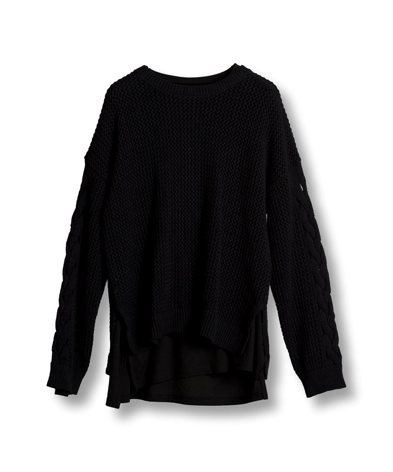 袖、背面にあしらったレースアップ仕様の透かし編みアクセントが目を引くレイヤードニットプルオーバー。