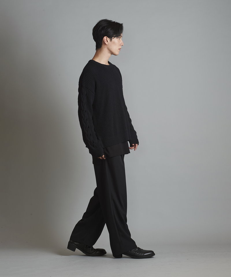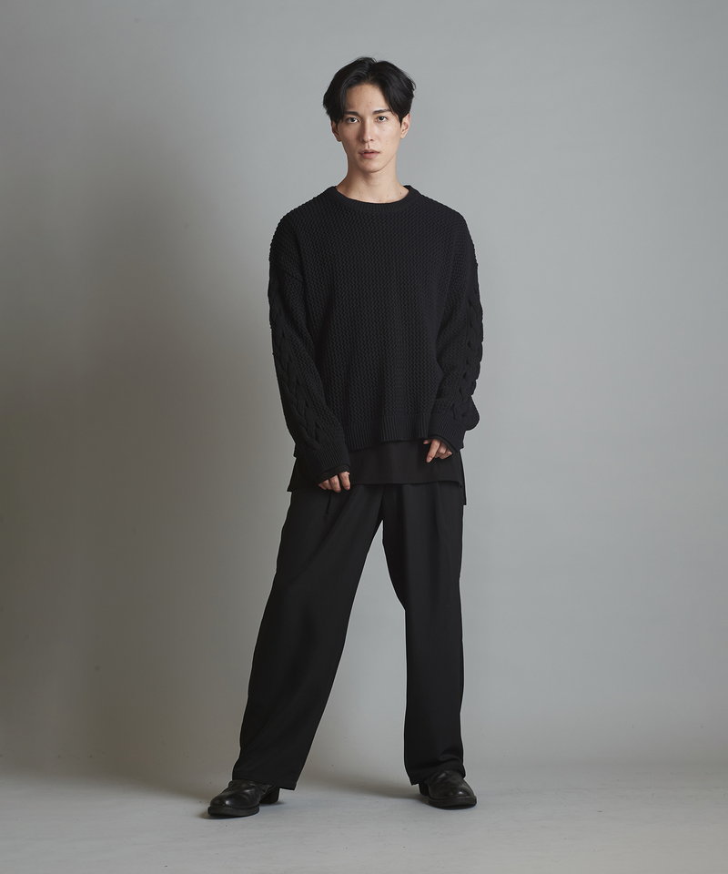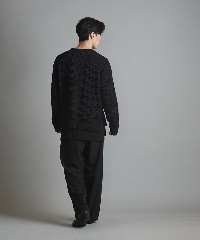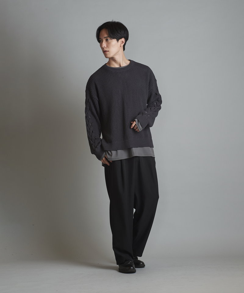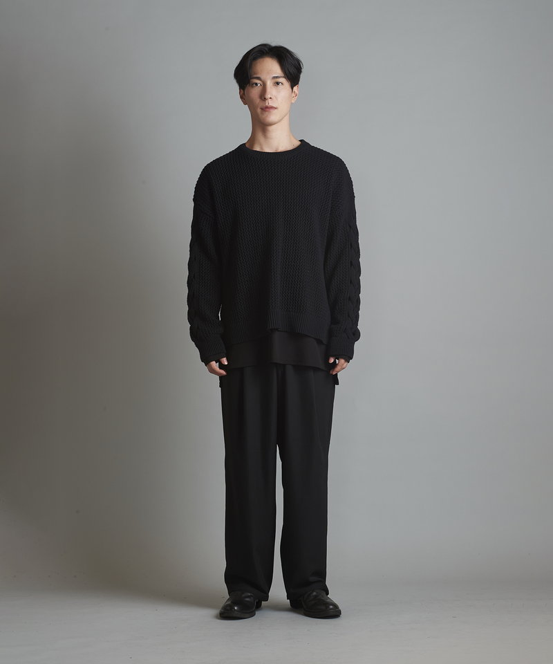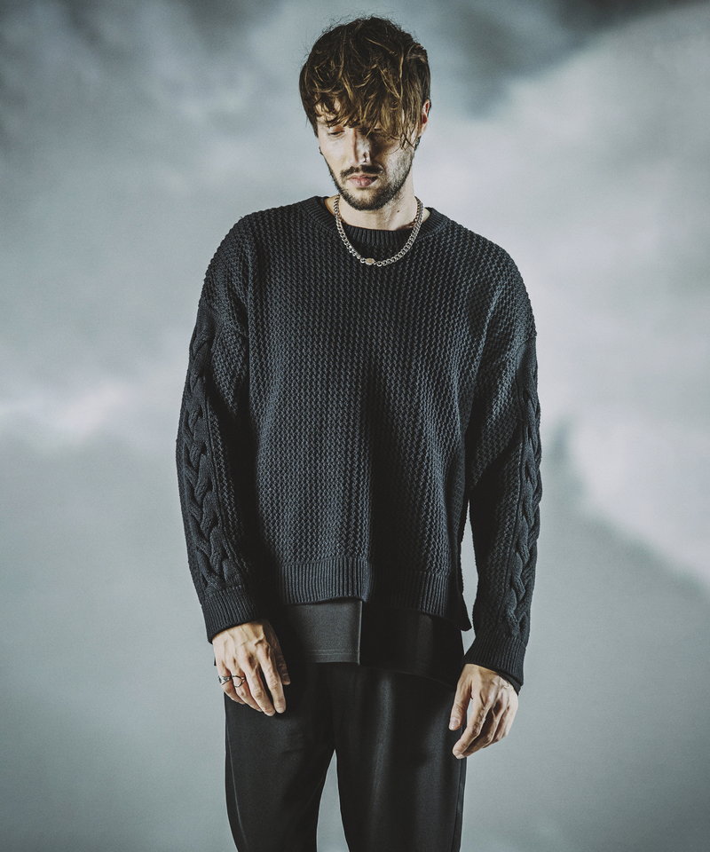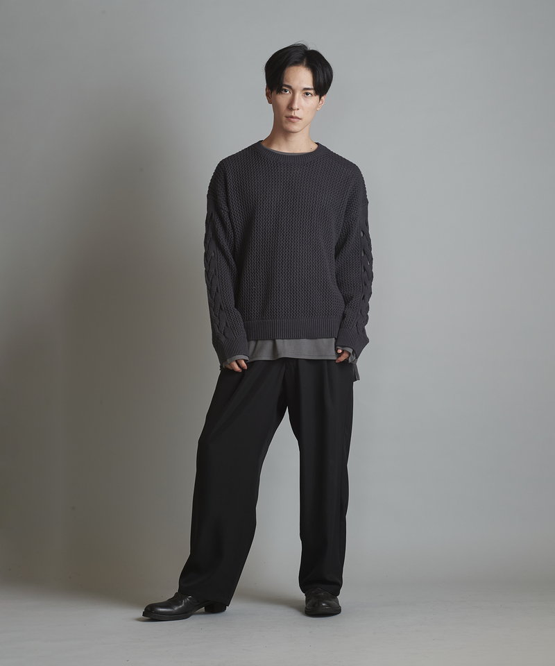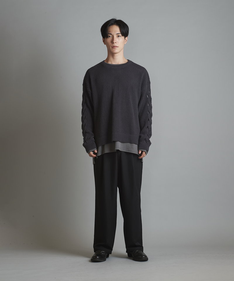 袖、背面にあしらったレースアップ仕様の透かし編みアクセントが目を引くレイヤードニットプルオーバー。