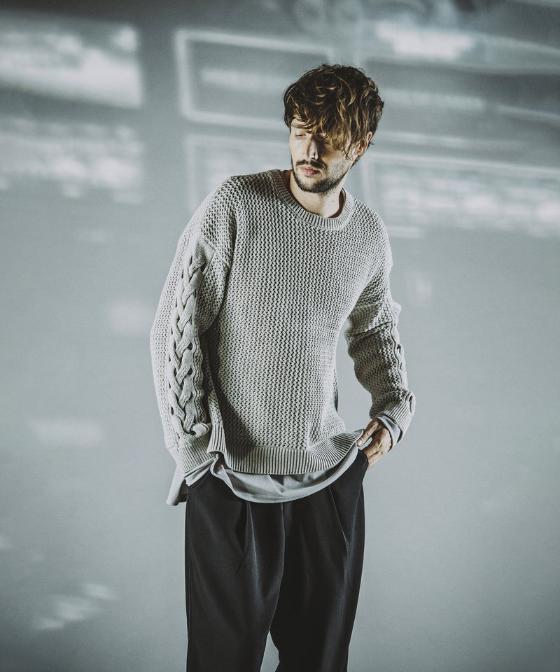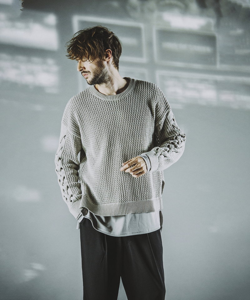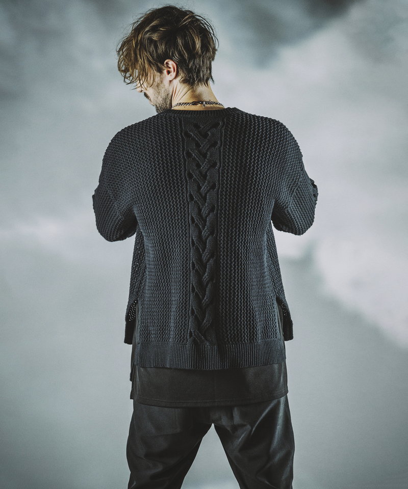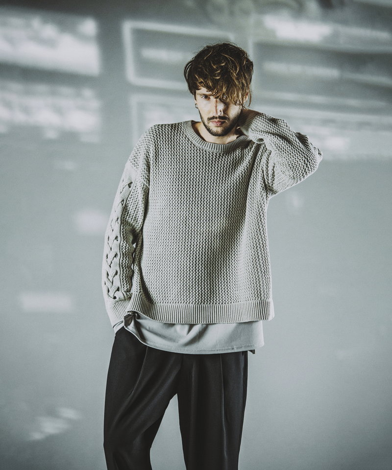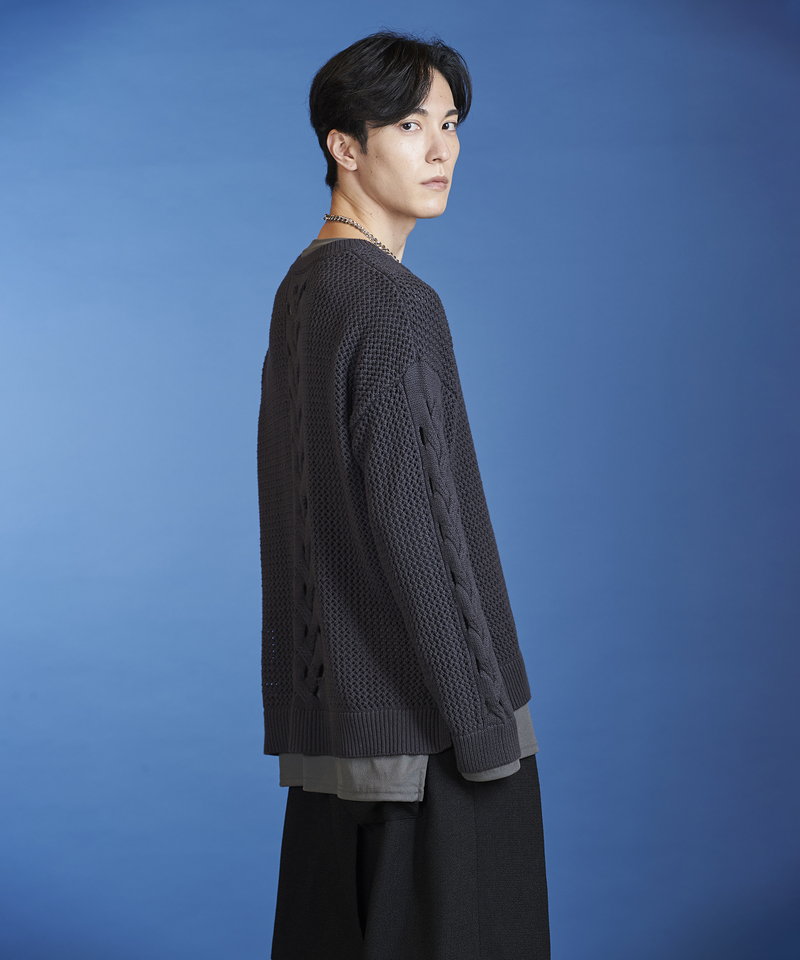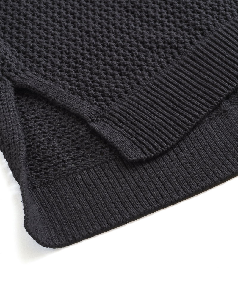 ローゲージのざっくりとしたメッシュ編みとの組み合わせで、奥行きのあるレイヤードスタイルが楽しめるアンサンブルアイテム。