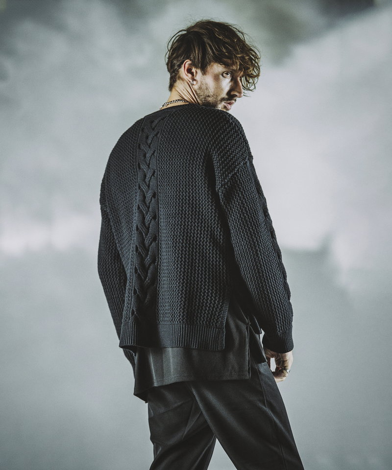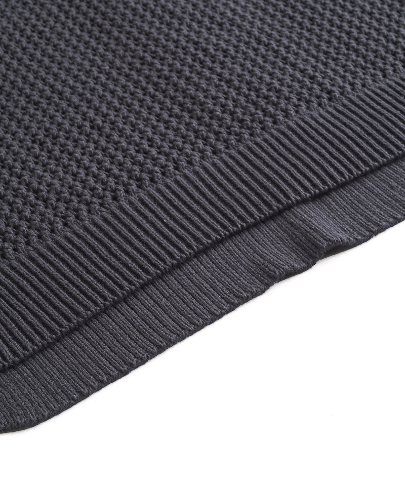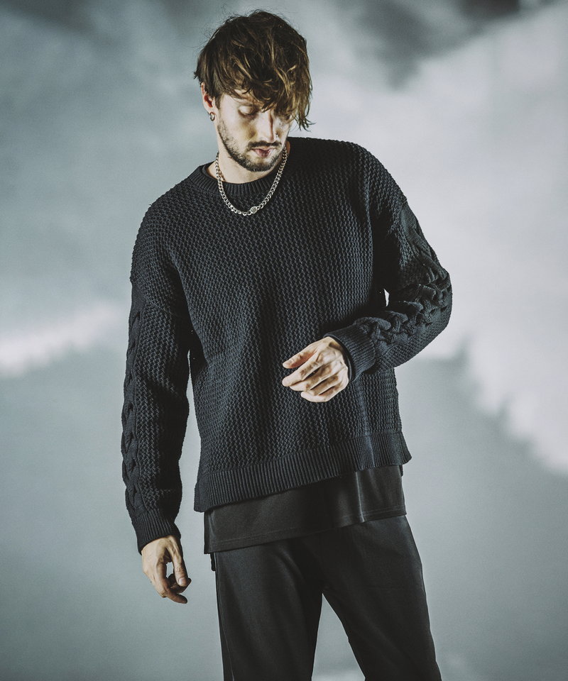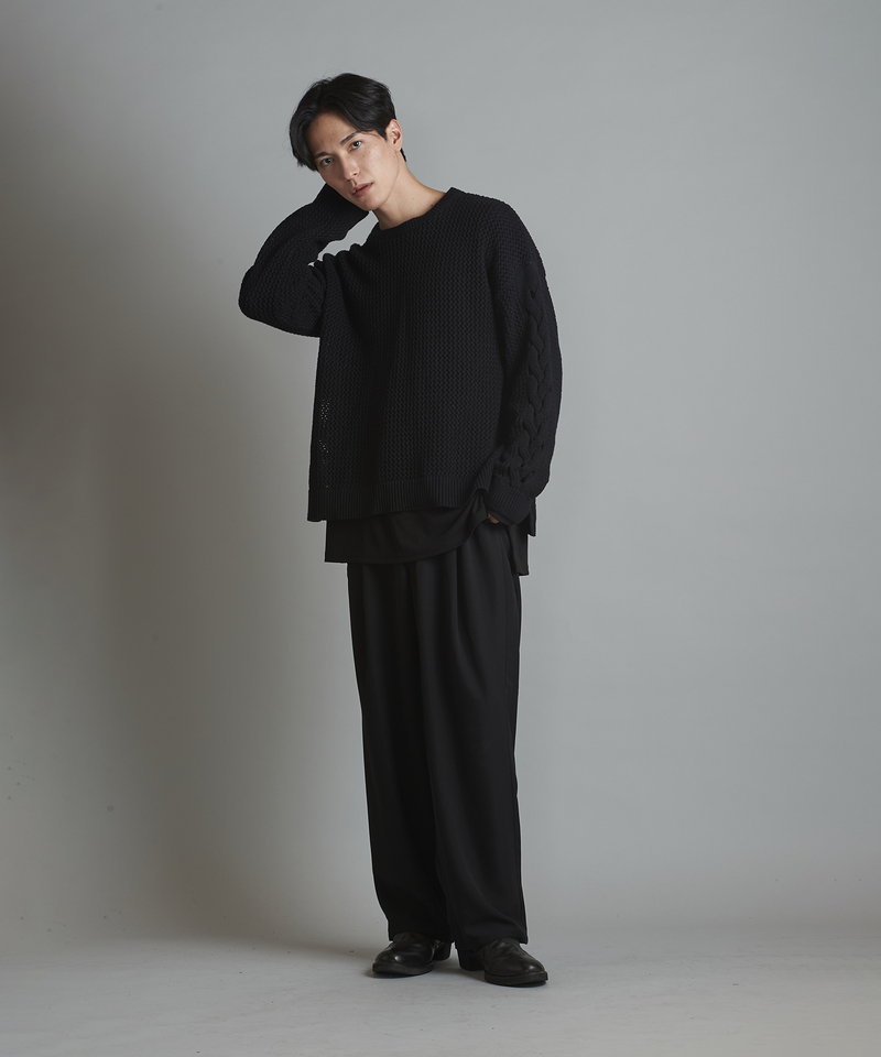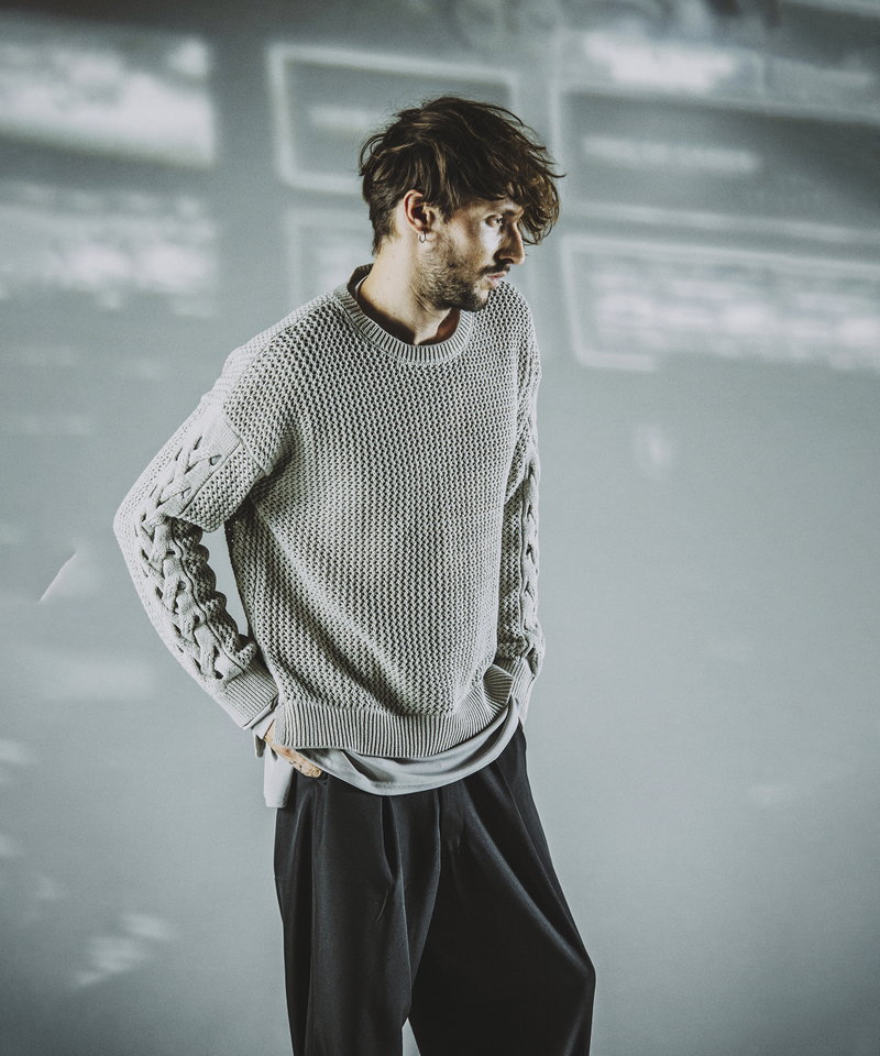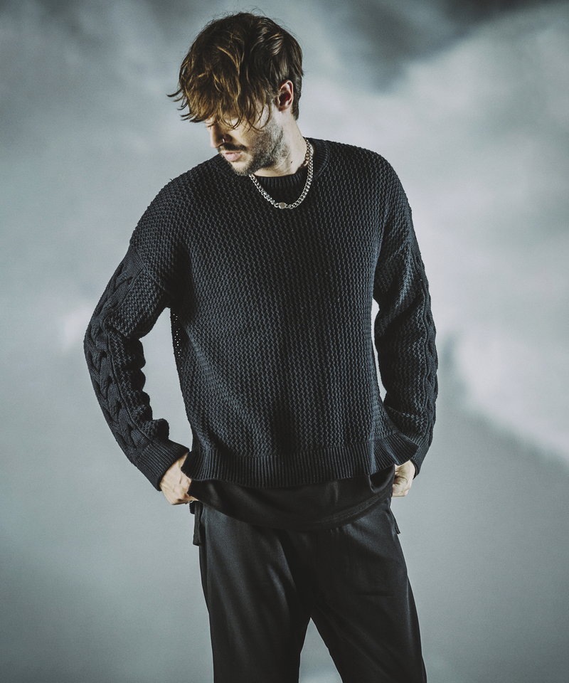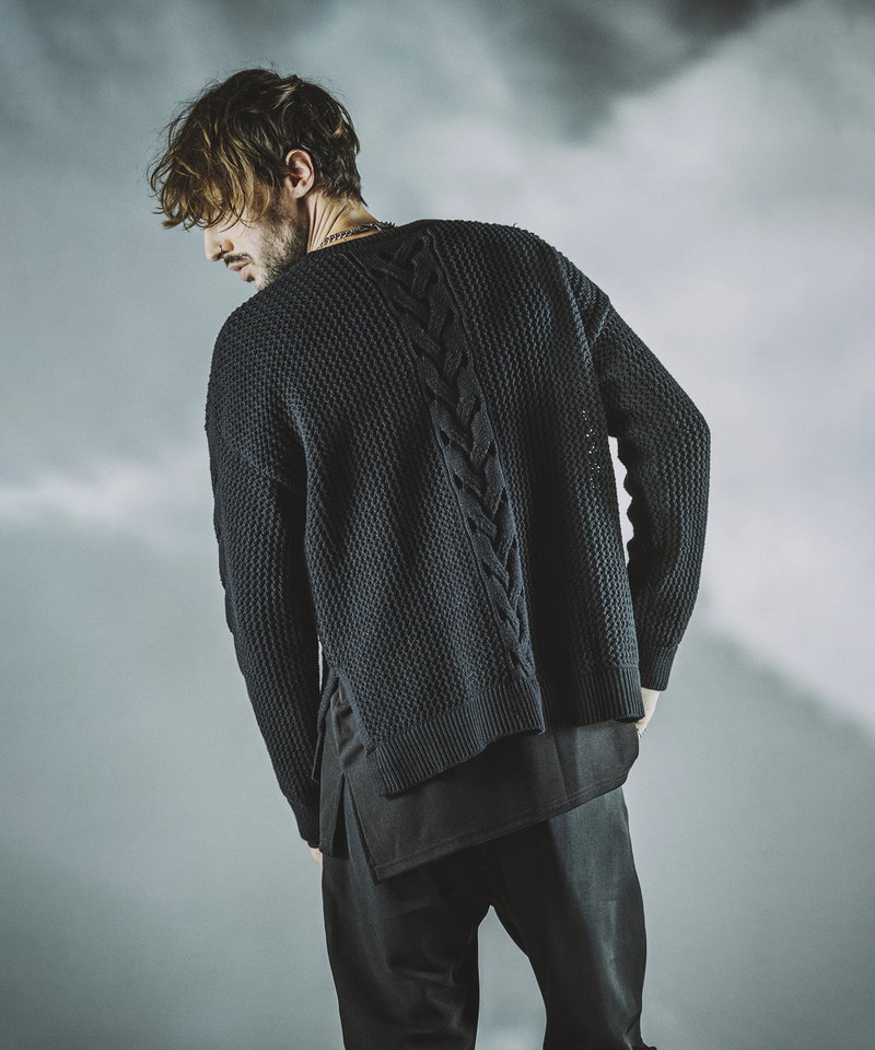 ローゲージのざっくりとしたメッシュ編みとの組み合わせで、奥行きのあるレイヤードスタイルが楽しめるアンサンブルアイテム。
