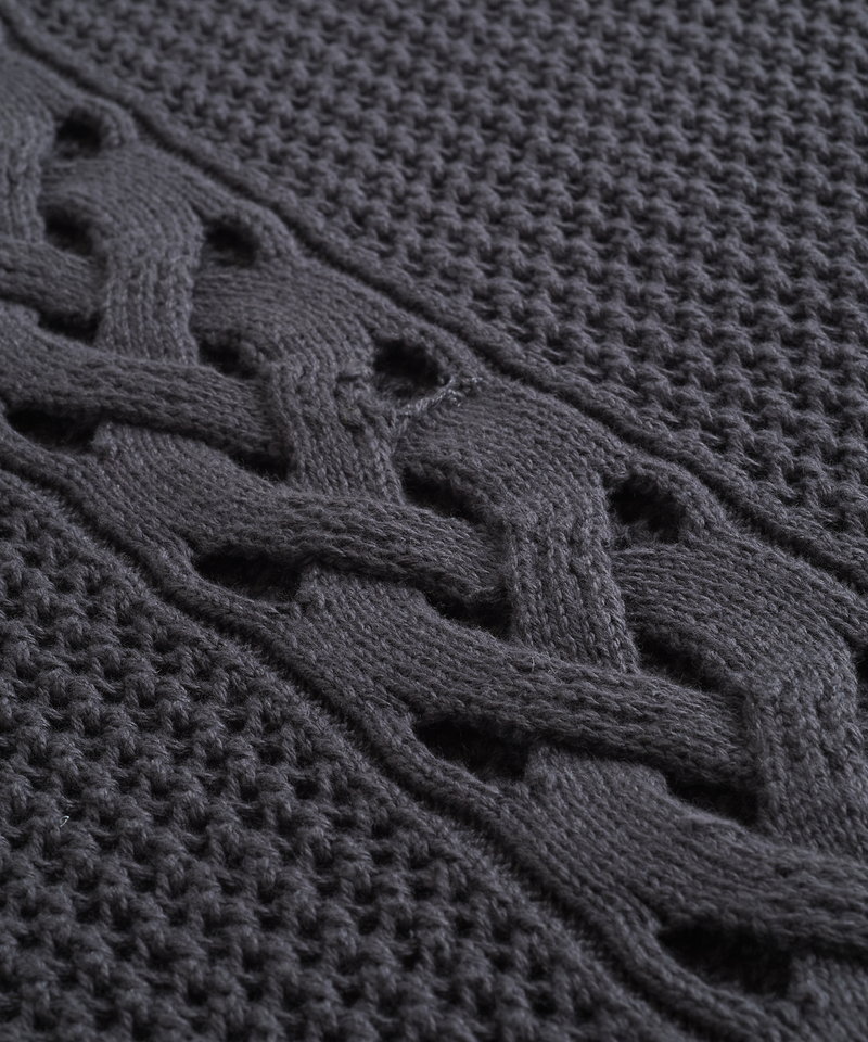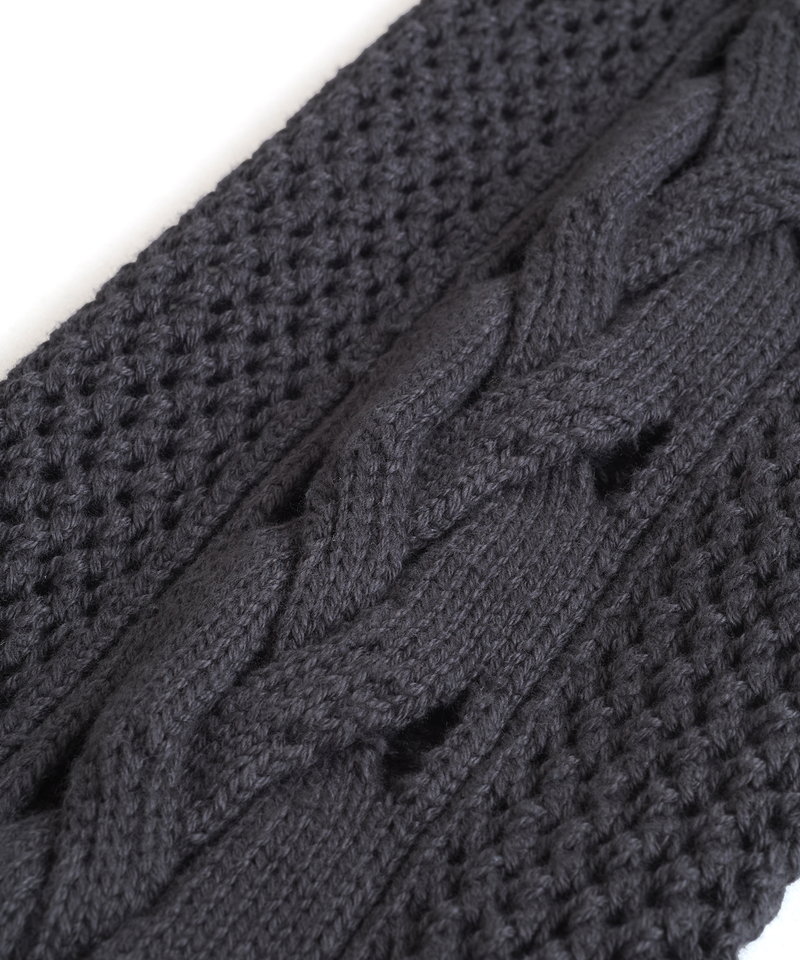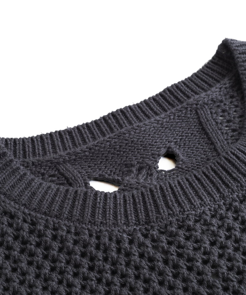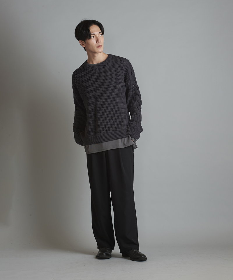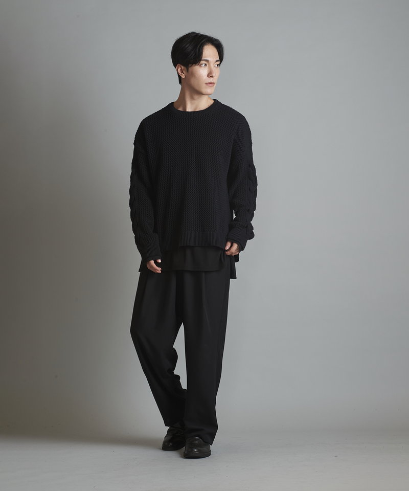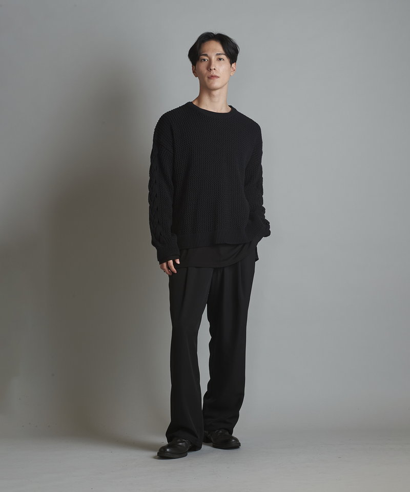 ローゲージのざっくりとしたメッシュ編みとの組み合わせで、奥行きのあるレイヤードスタイルが楽しめるアンサンブルアイテム。