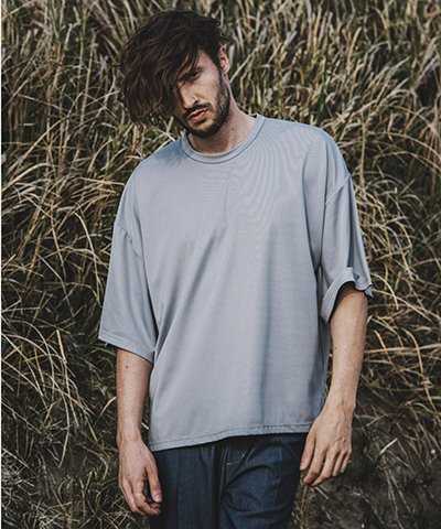 季節の変わり目に重宝する肘下辺りの半端丈と腕のラインに馴染みの良いドルマンスリーブを採用する事で服の切替線を減らしモードさをプラス。