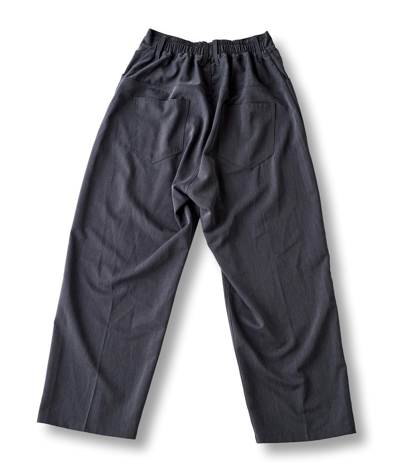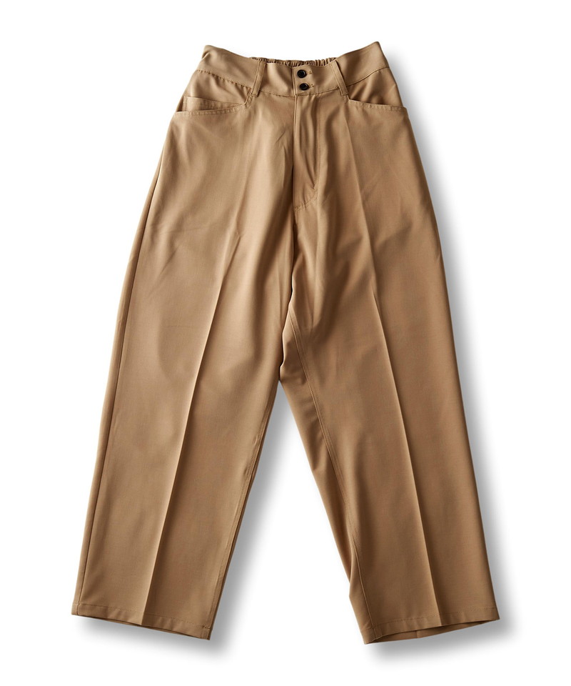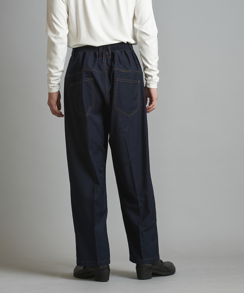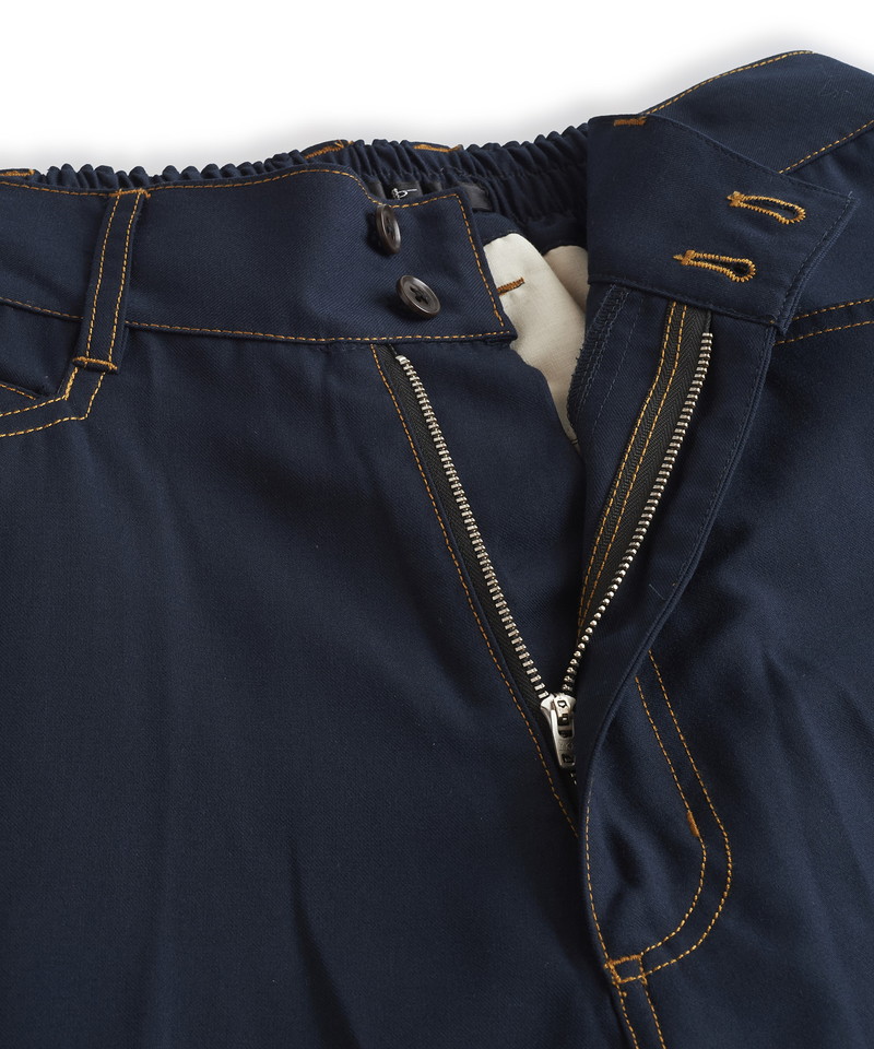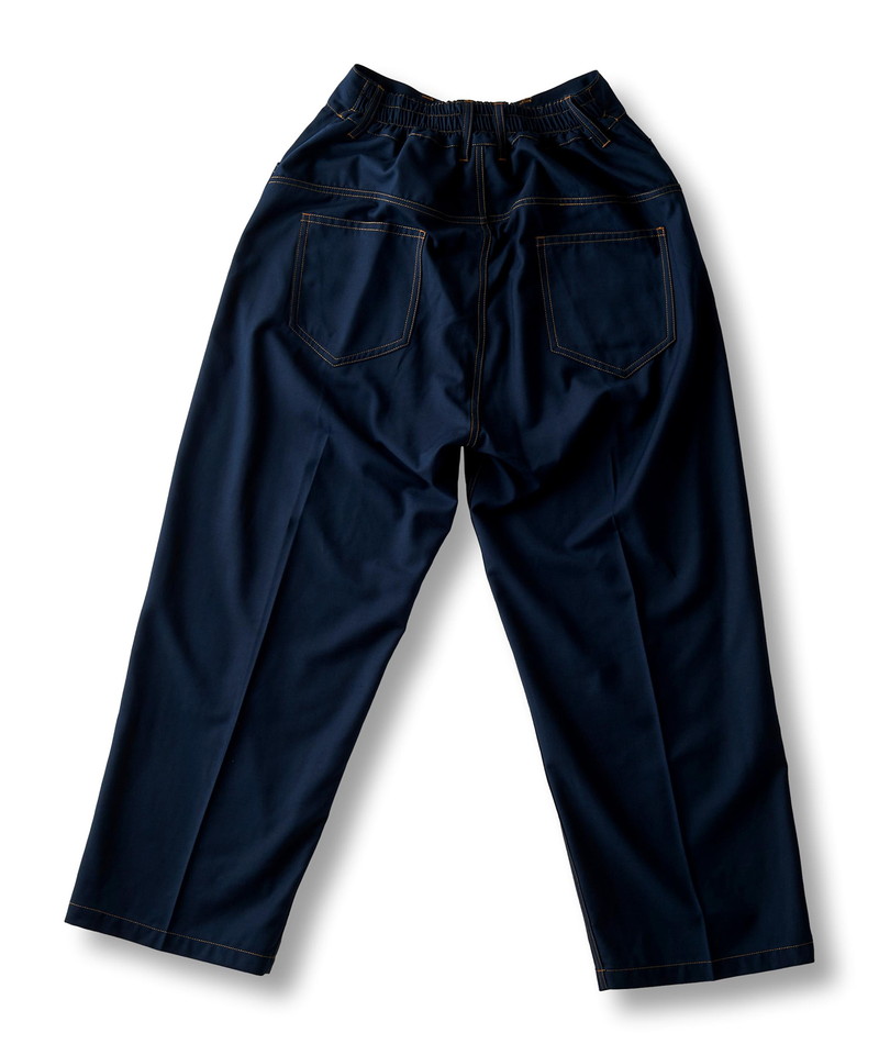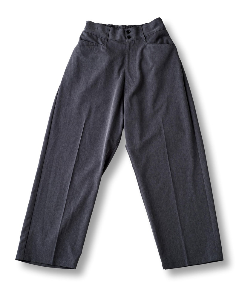 フロントウエストは通常のトラウザー仕様、バックをリブにすることで正面のヴィジュアルはそのままに快適な履き心地とタックインも可能な実用性を兼備した一本。
