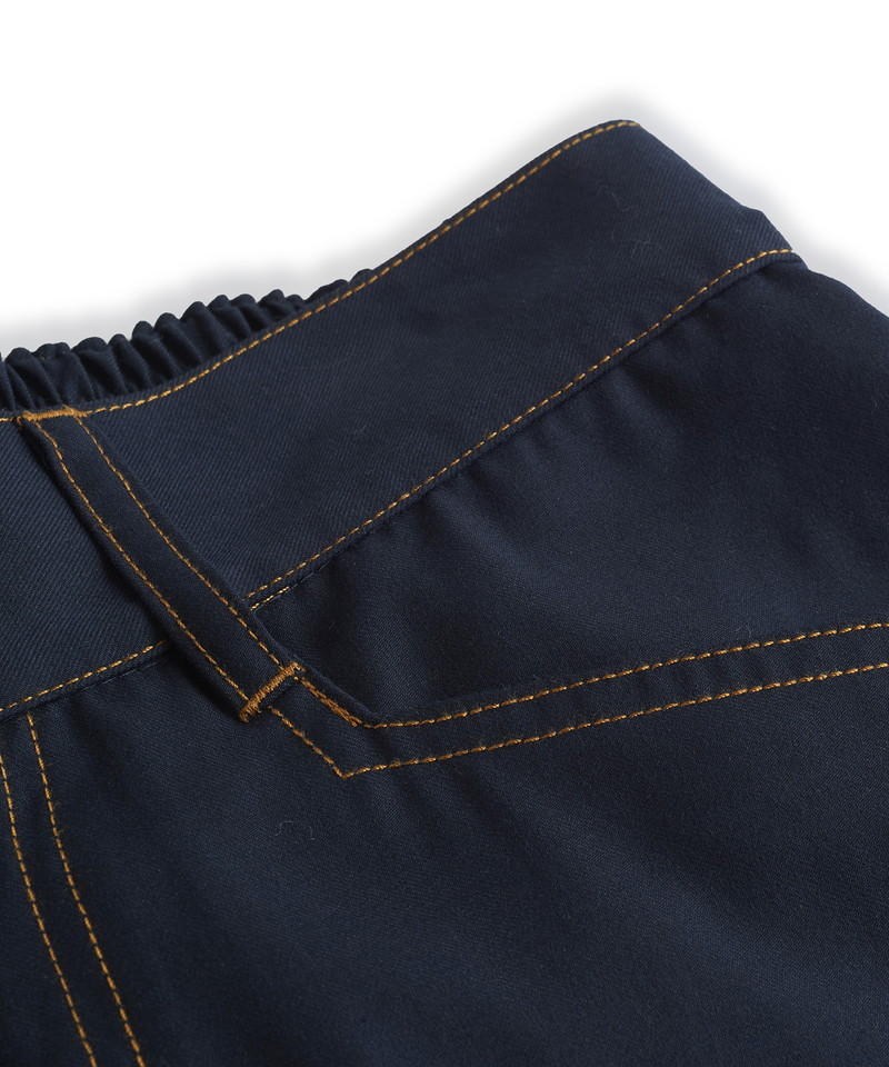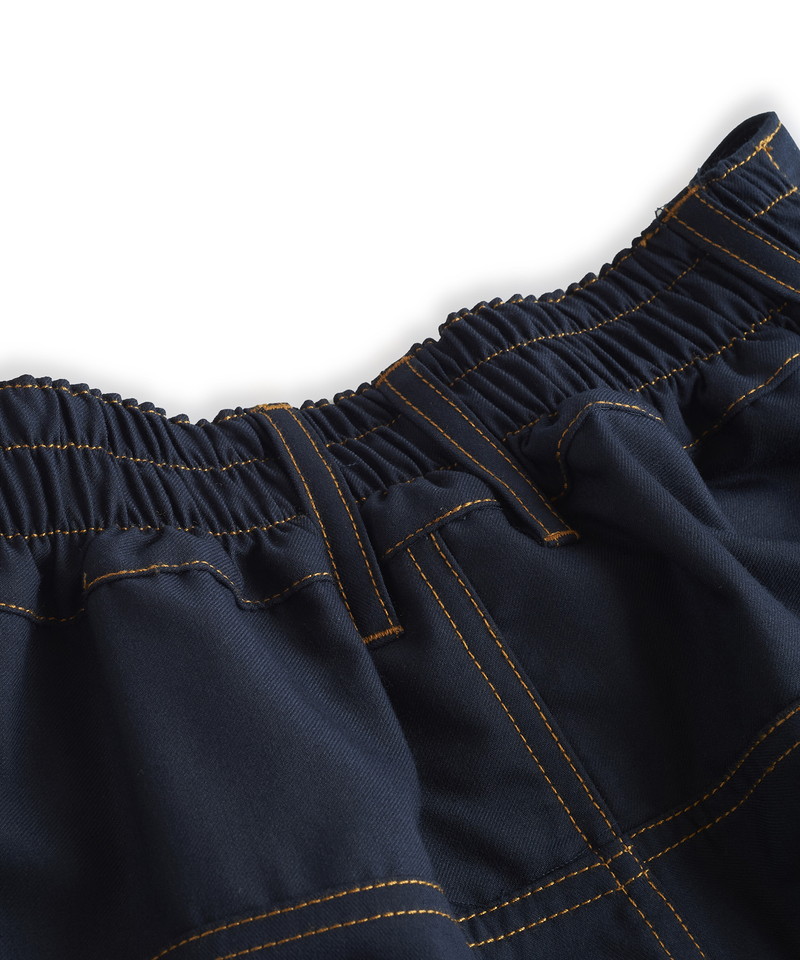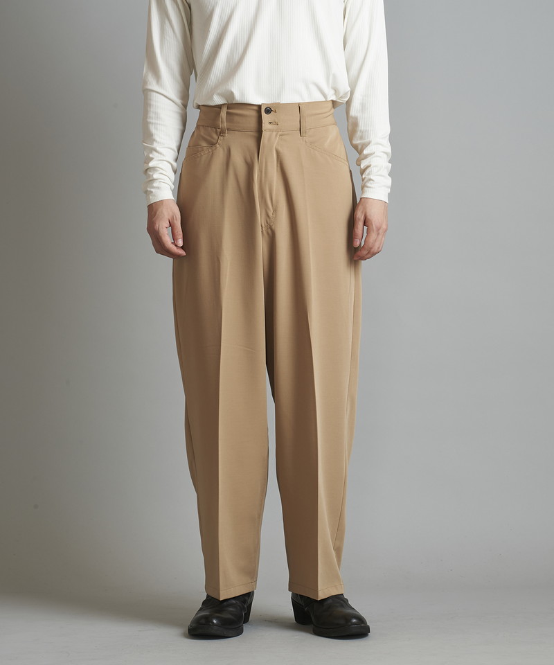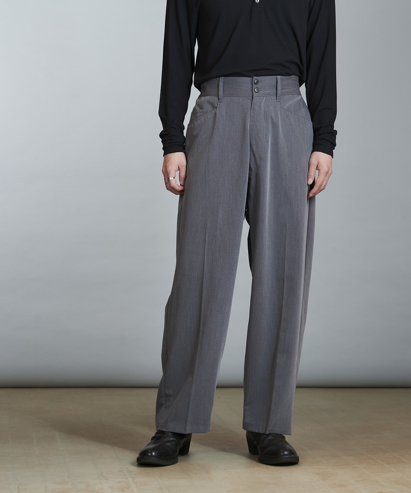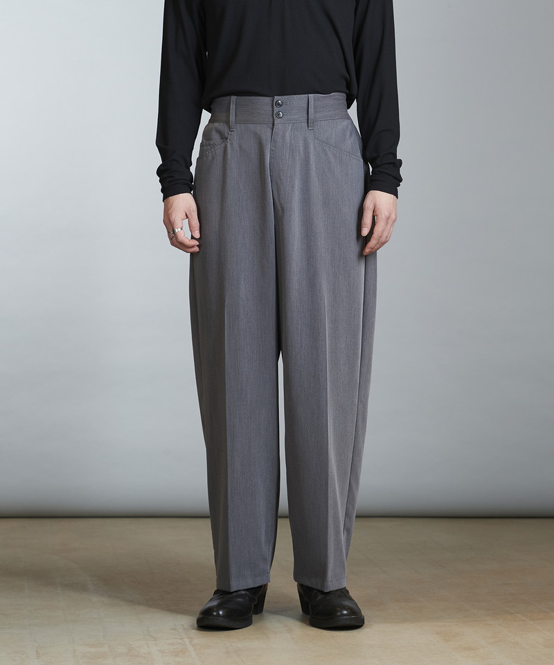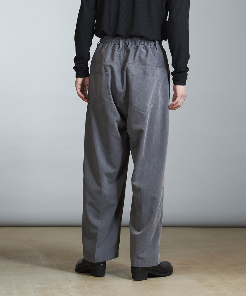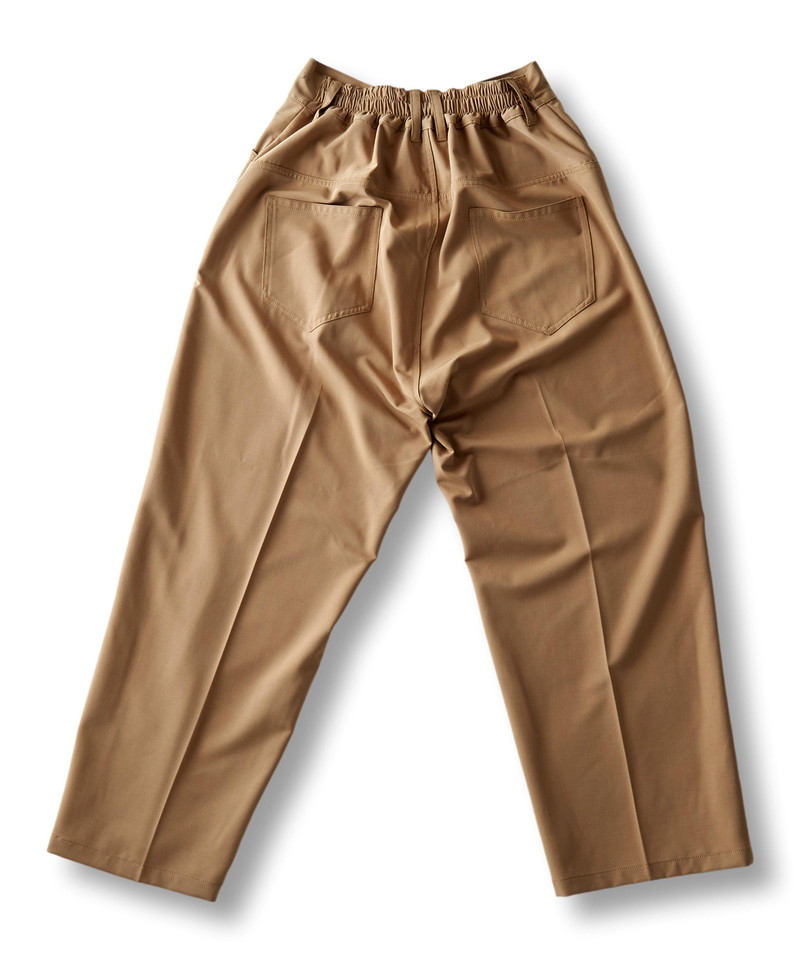 フロントウエストは通常のトラウザー仕様、バックをリブにすることで正面のヴィジュアルはそのままに快適な履き心地とタックインも可能な実用性を兼備した一本。