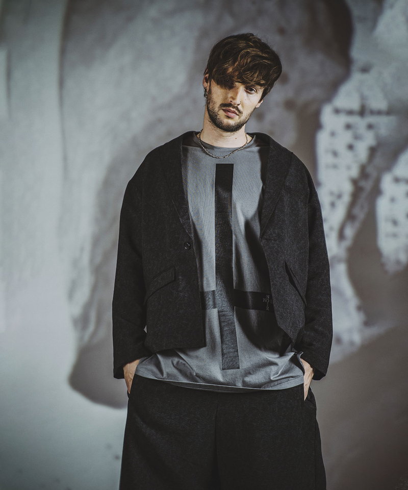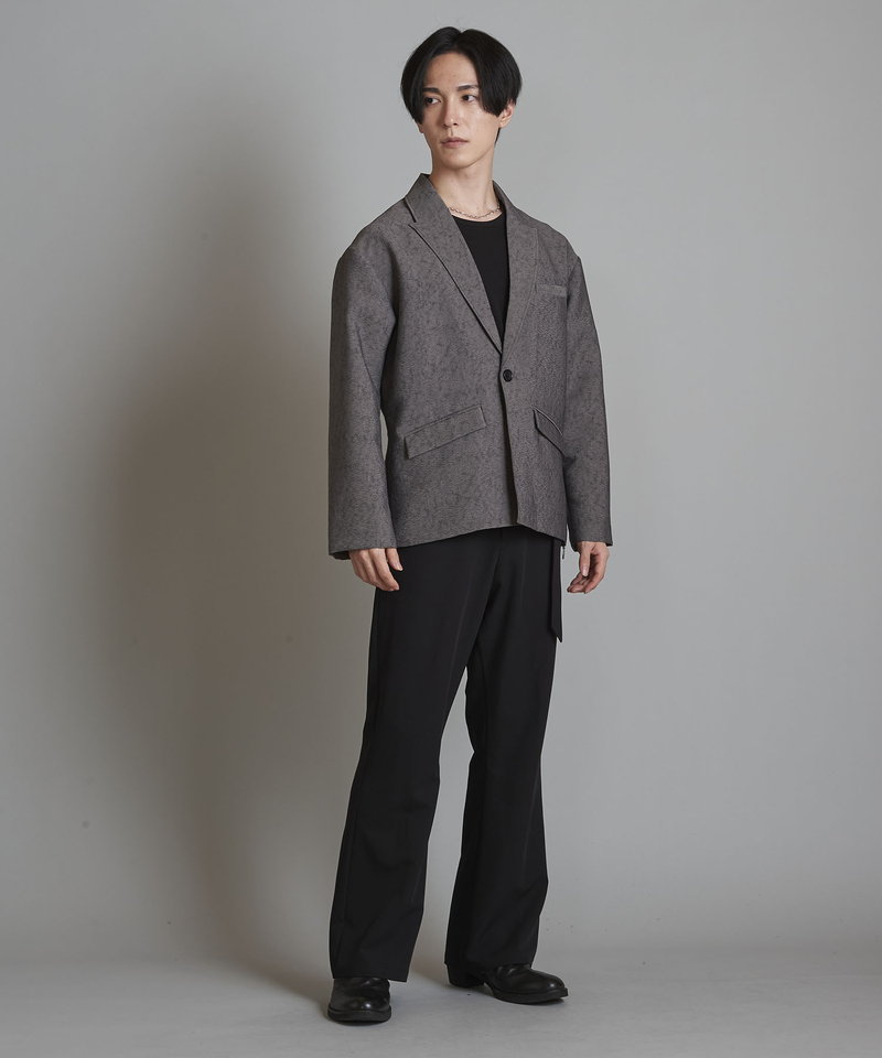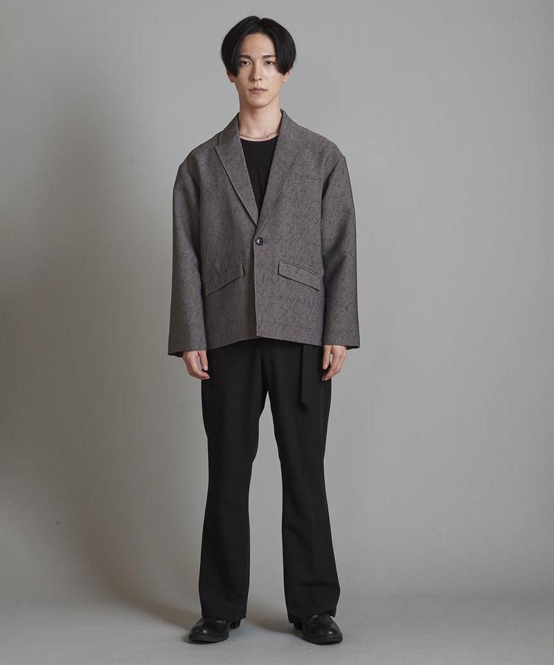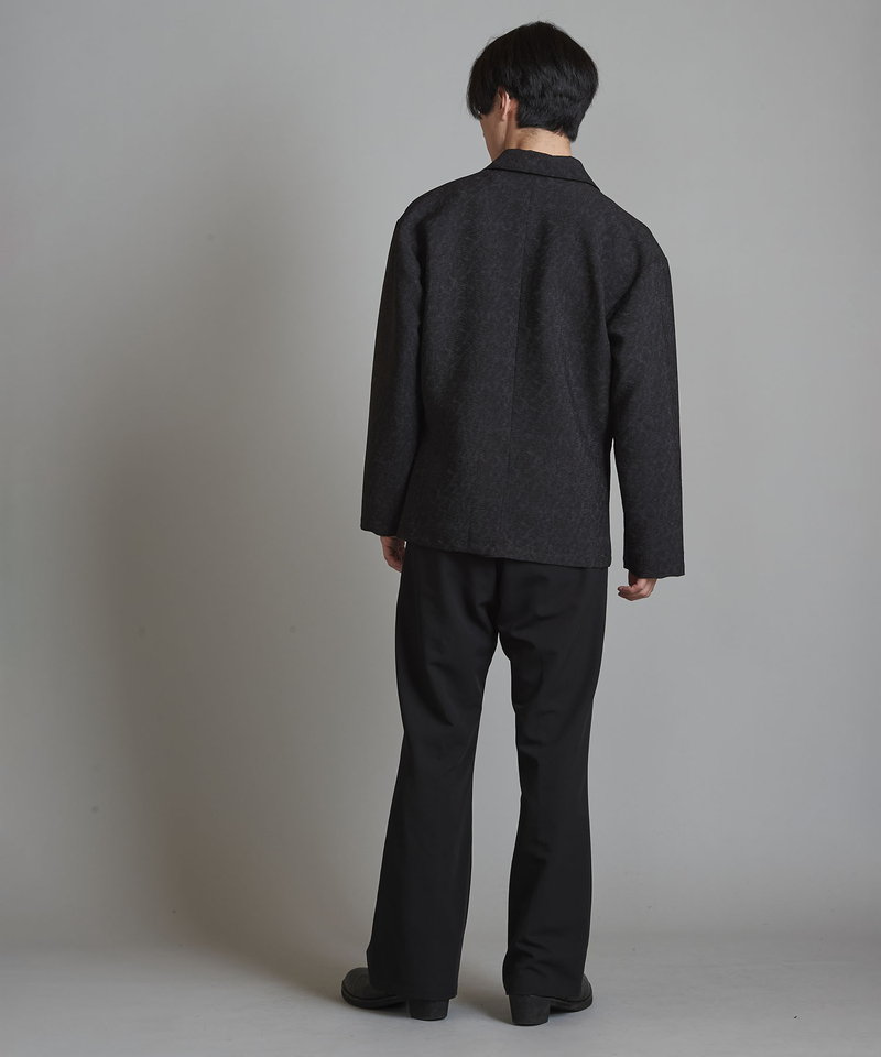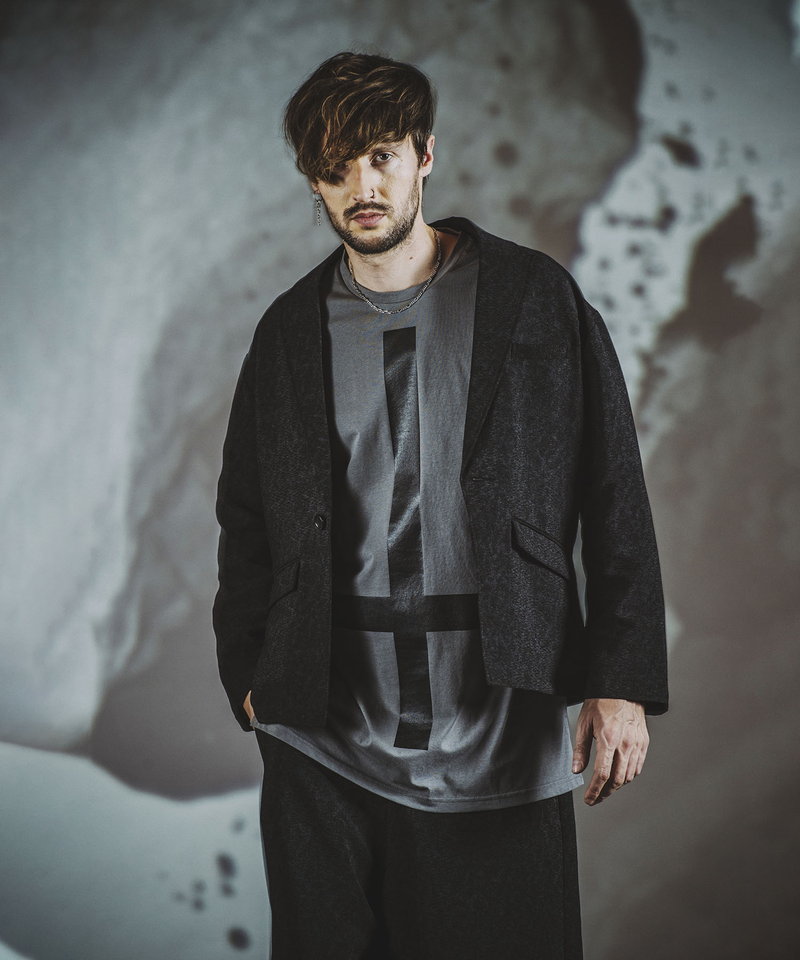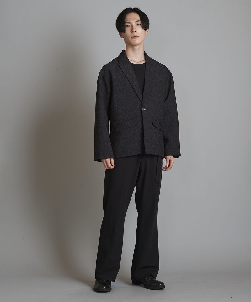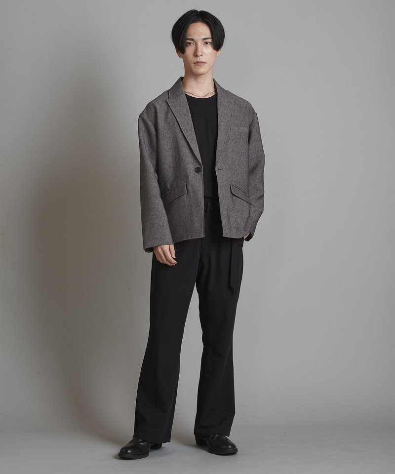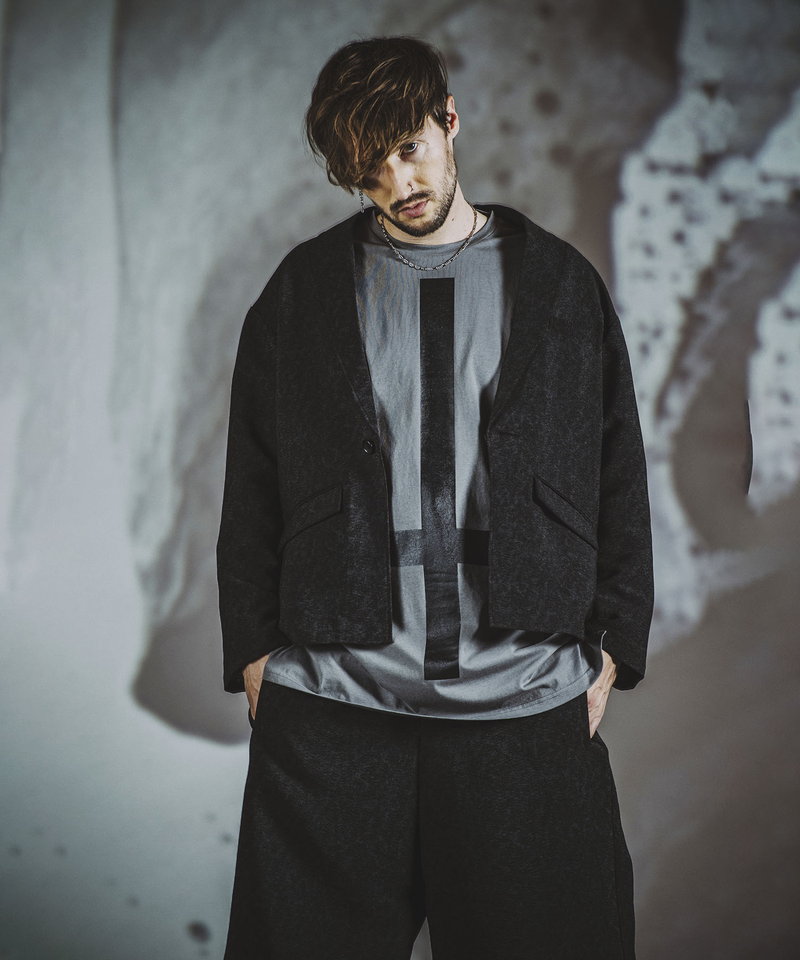 構築的で端正なフォルムの印象が強いテーラードジャケットのショルダーラインや袖幅を広く取る事で脱構築的な抜け感のある表情のジャケットが完成。