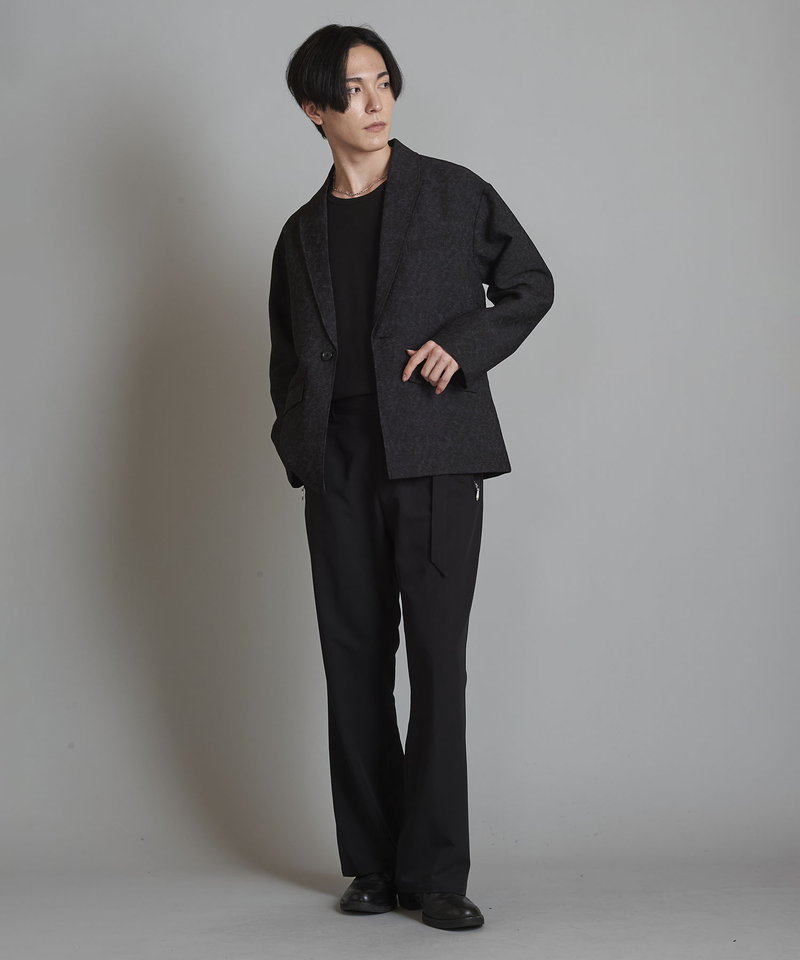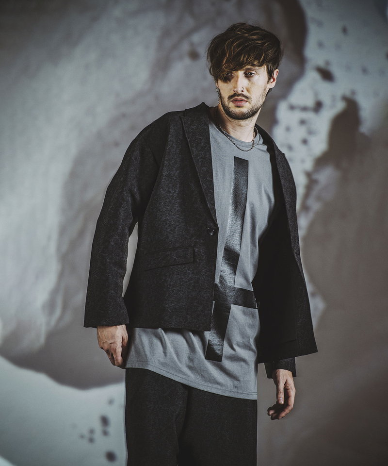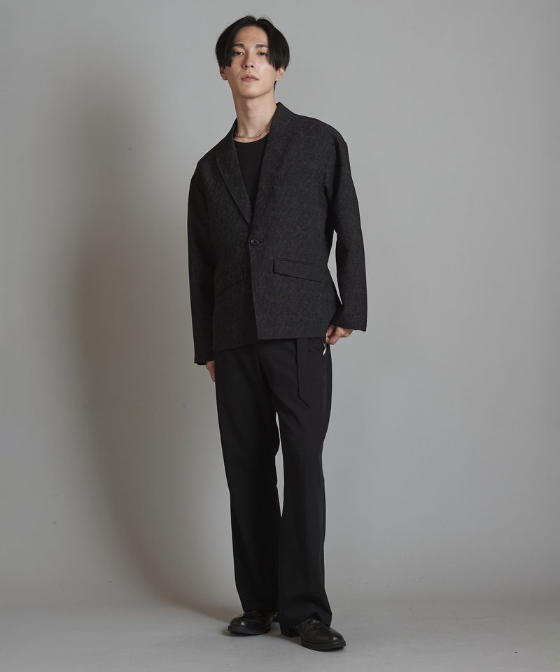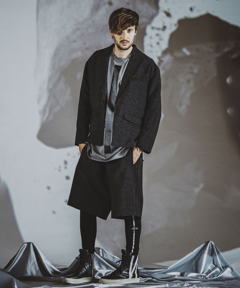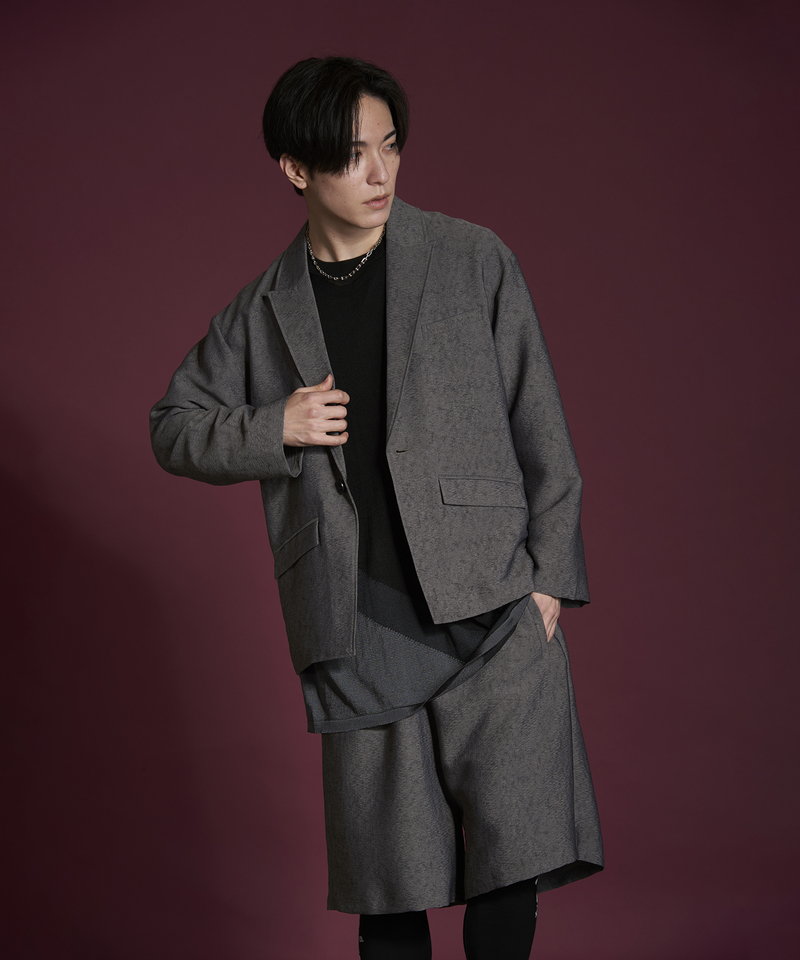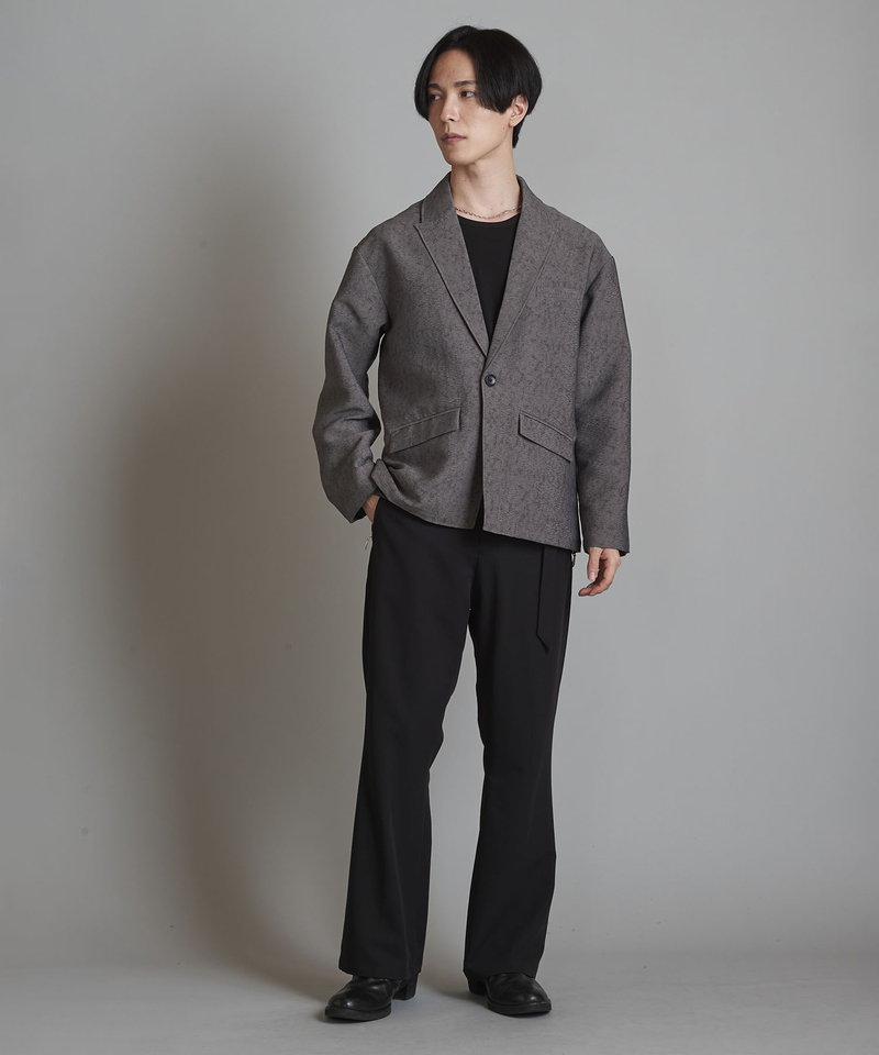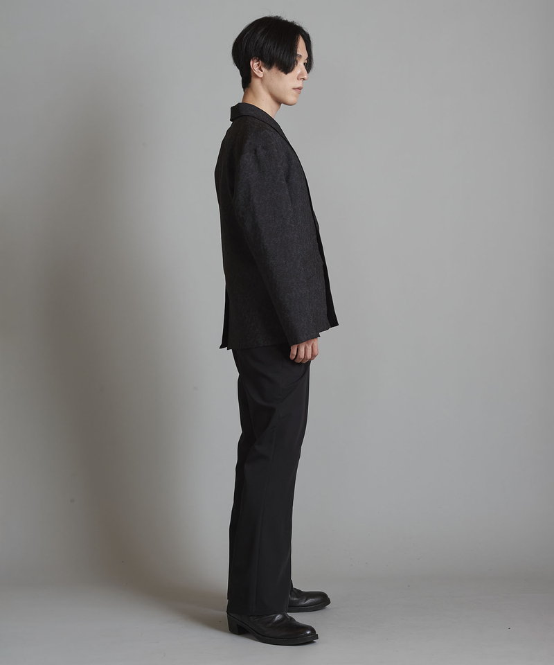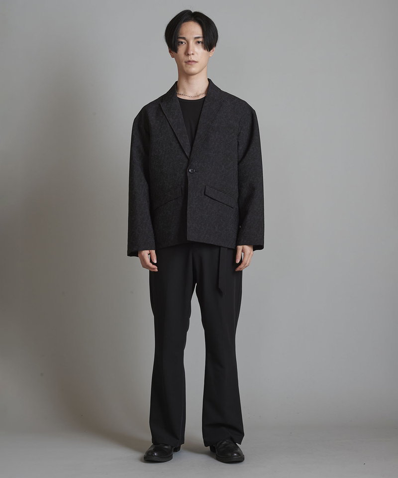 構築的で端正なフォルムの印象が強いテーラードジャケットのショルダーラインや袖幅を広く取る事で脱構築的な抜け感のある表情のジャケットが完成。