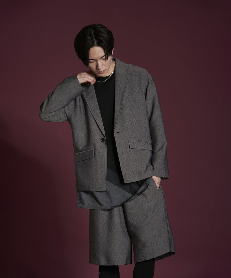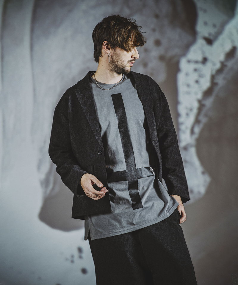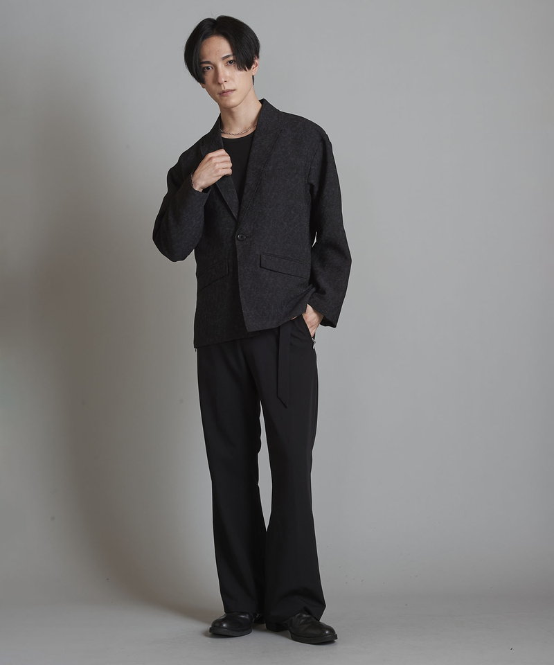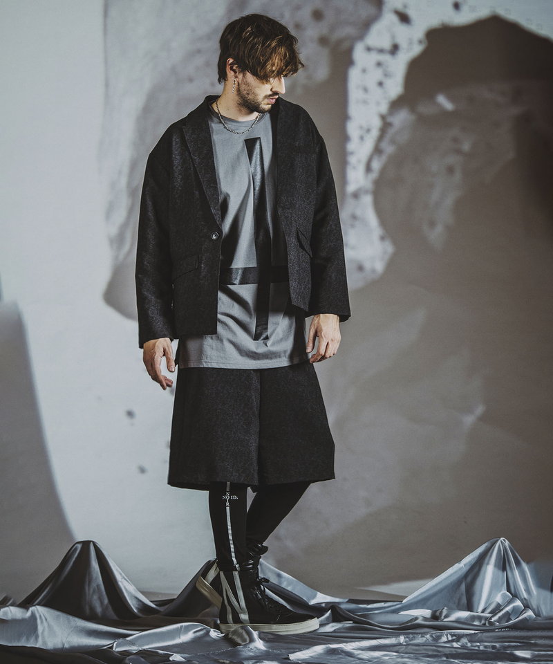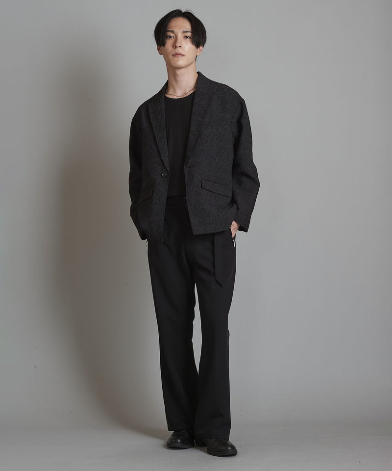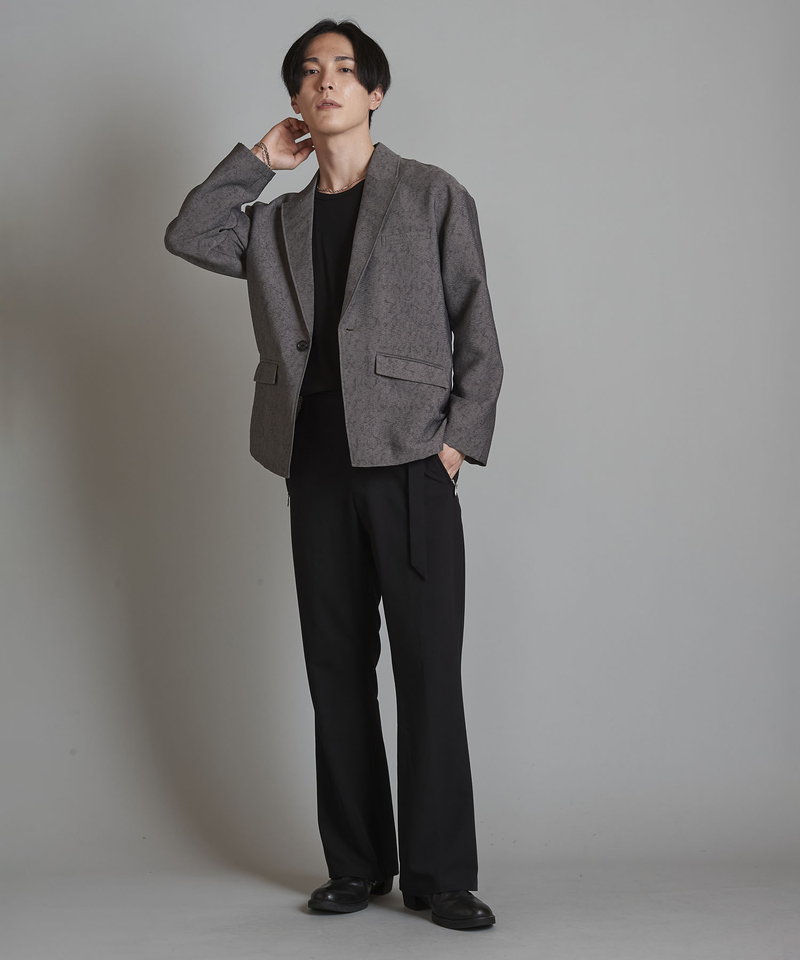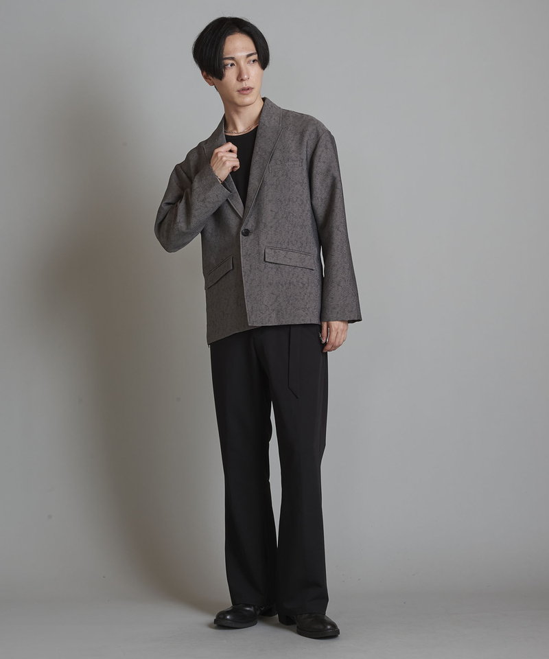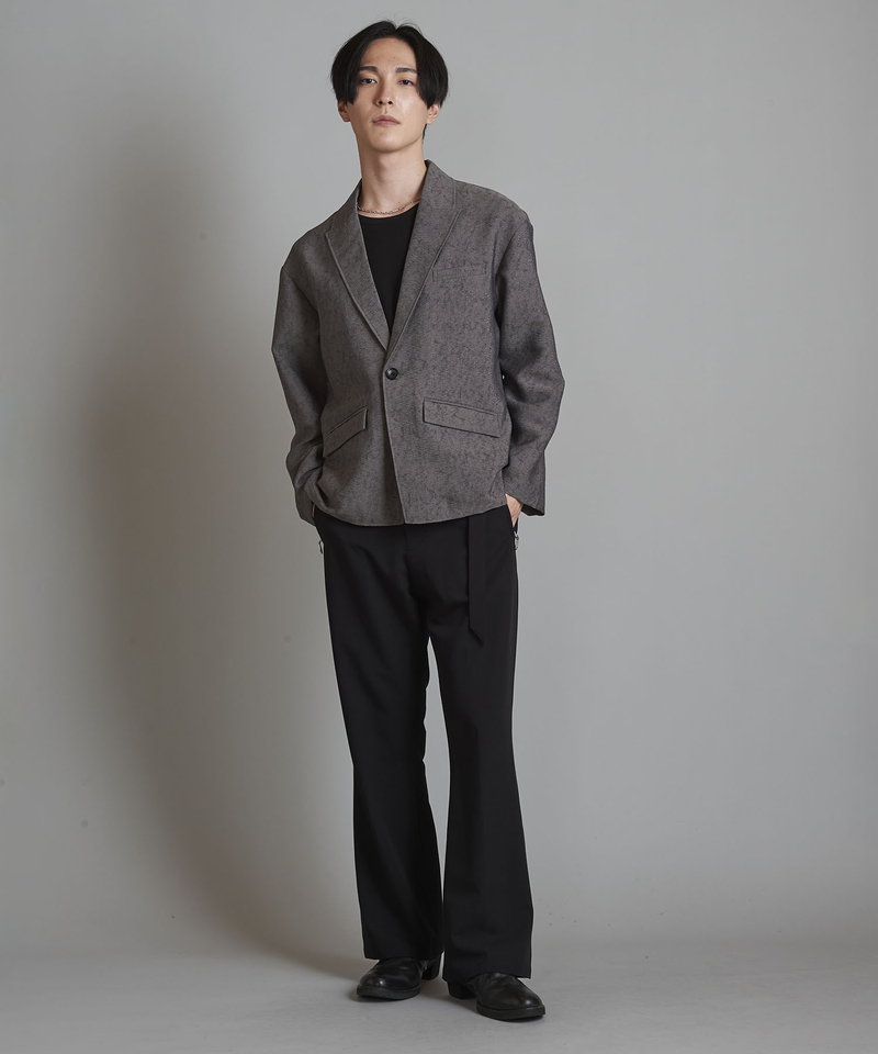 構築的で端正なフォルムの印象が強いテーラードジャケットのショルダーラインや袖幅を広く取る事で脱構築的な抜け感のある表情のジャケットが完成。