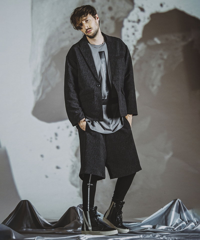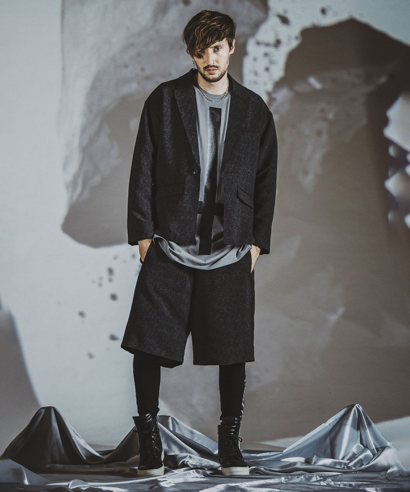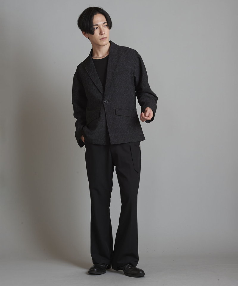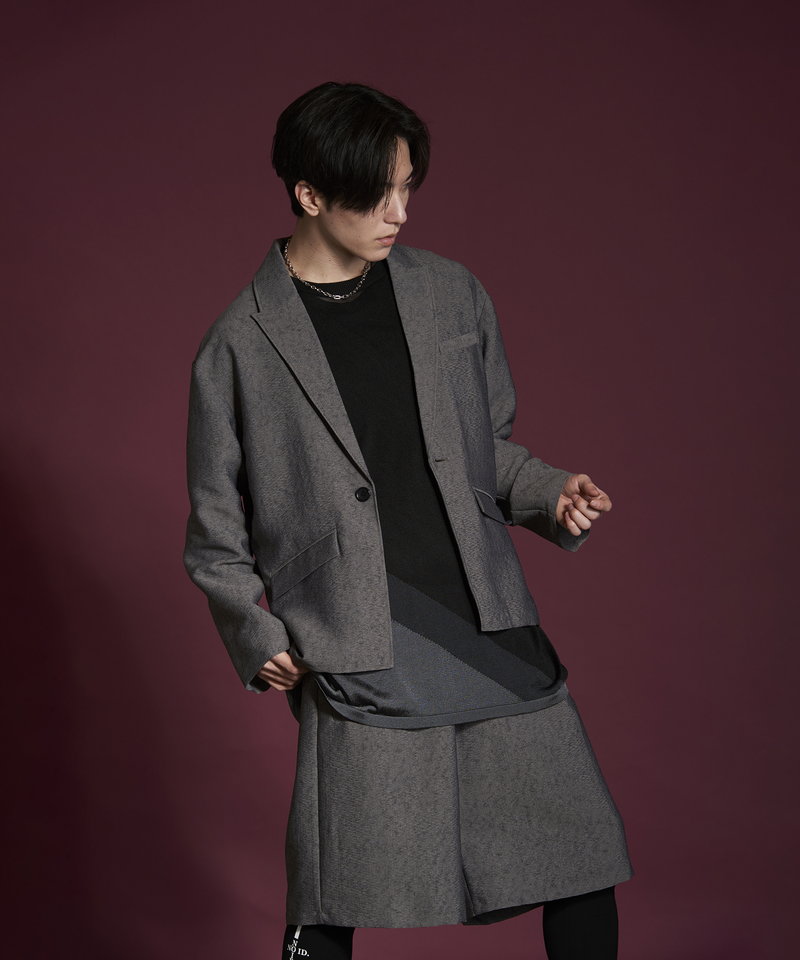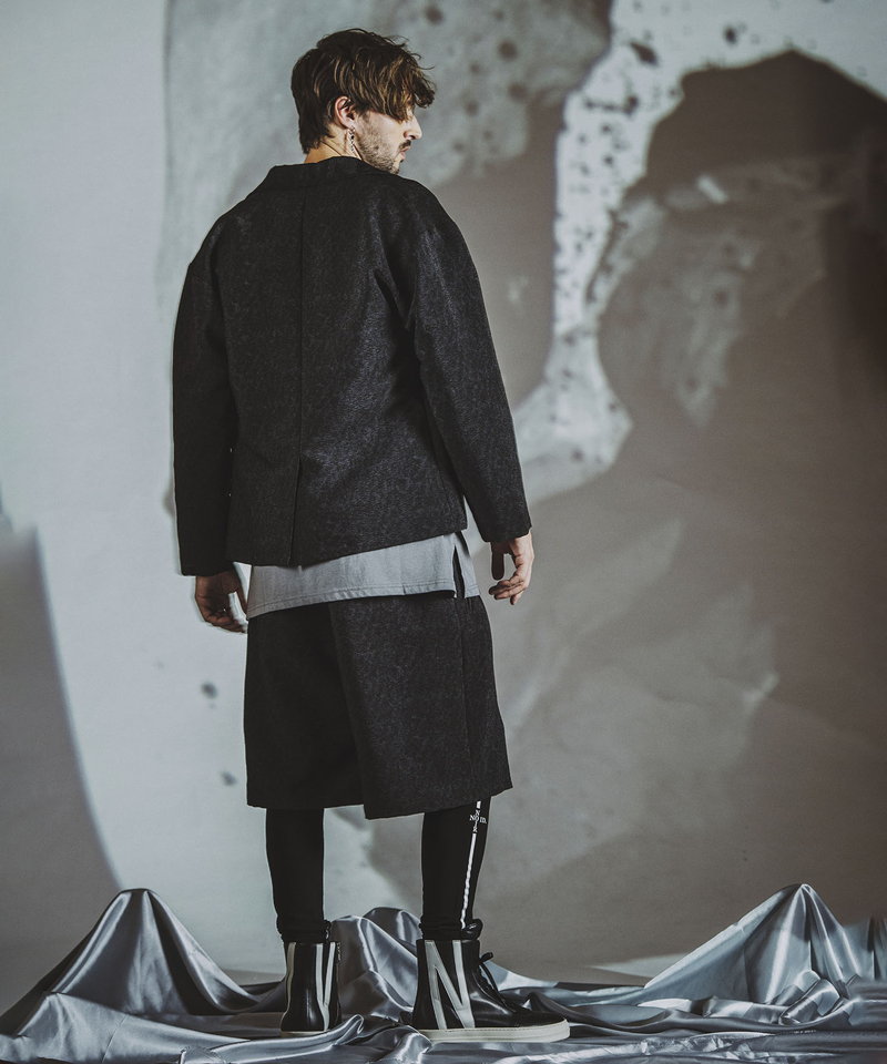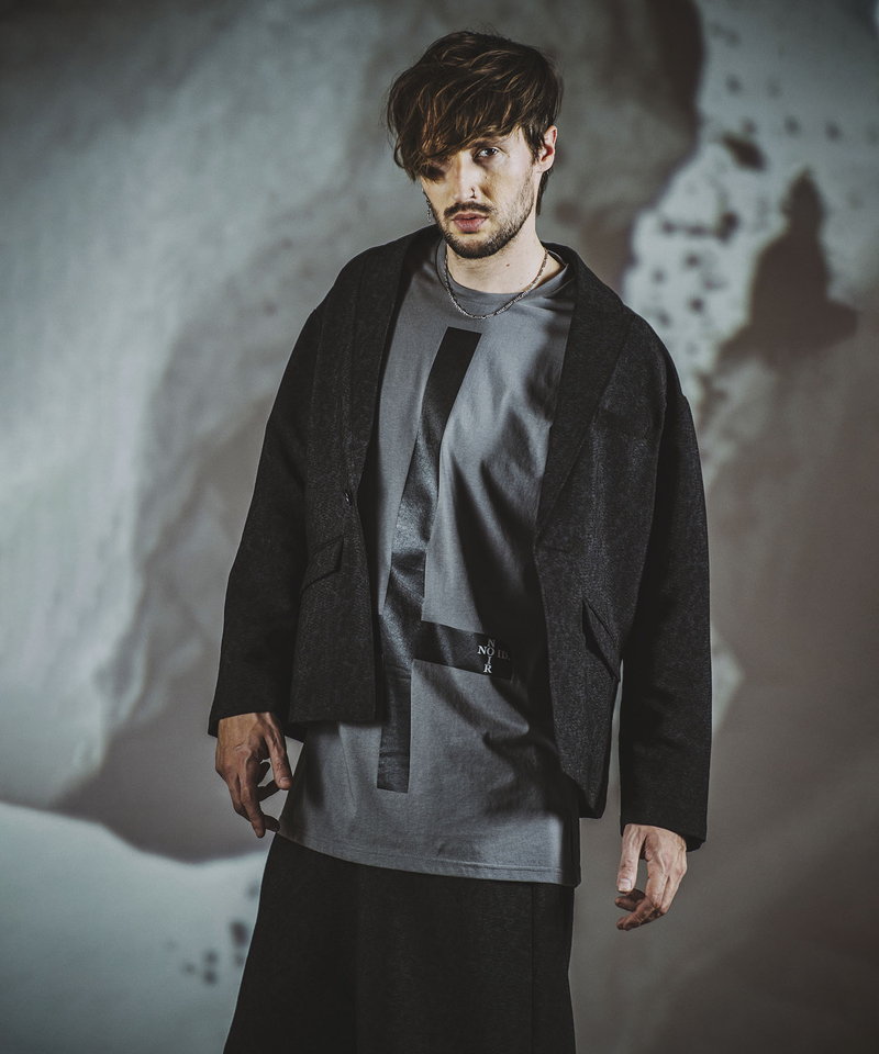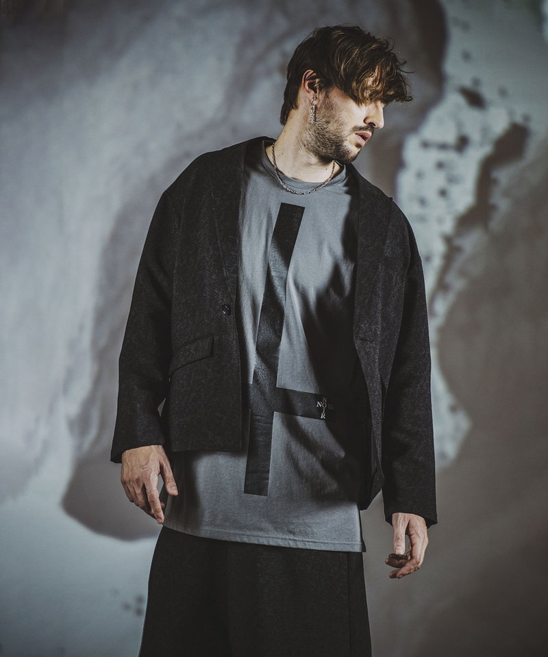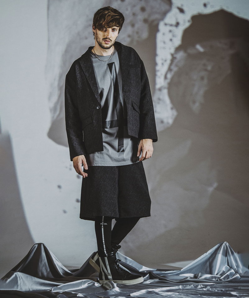 構築的で端正なフォルムの印象が強いテーラードジャケットのショルダーラインや袖幅を広く取る事で脱構築的な抜け感のある表情のジャケットが完成。