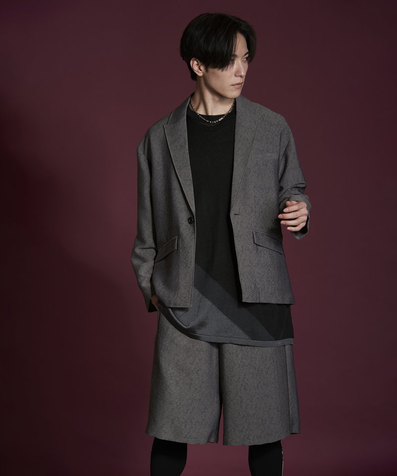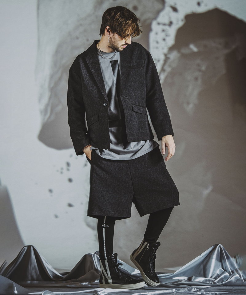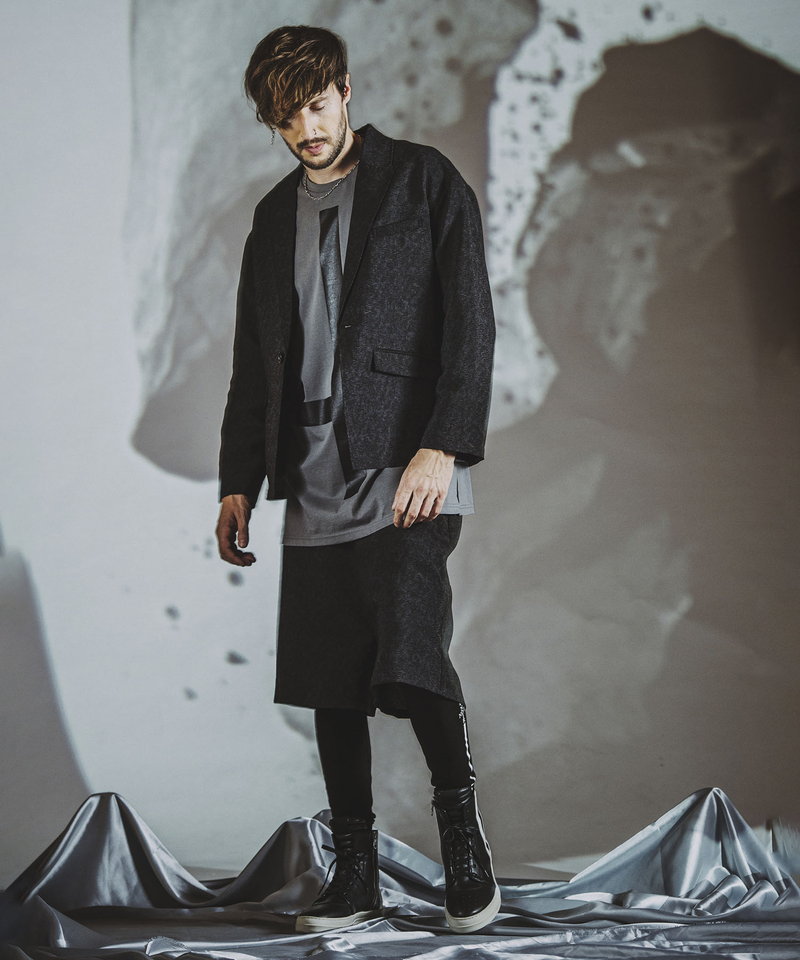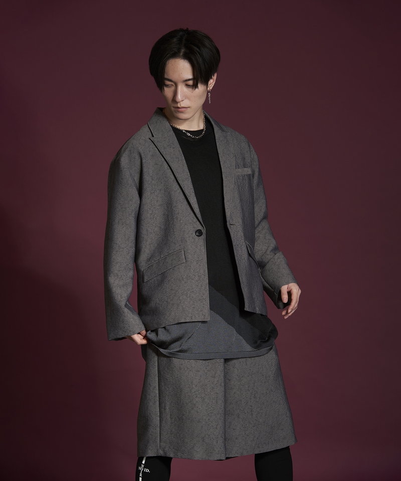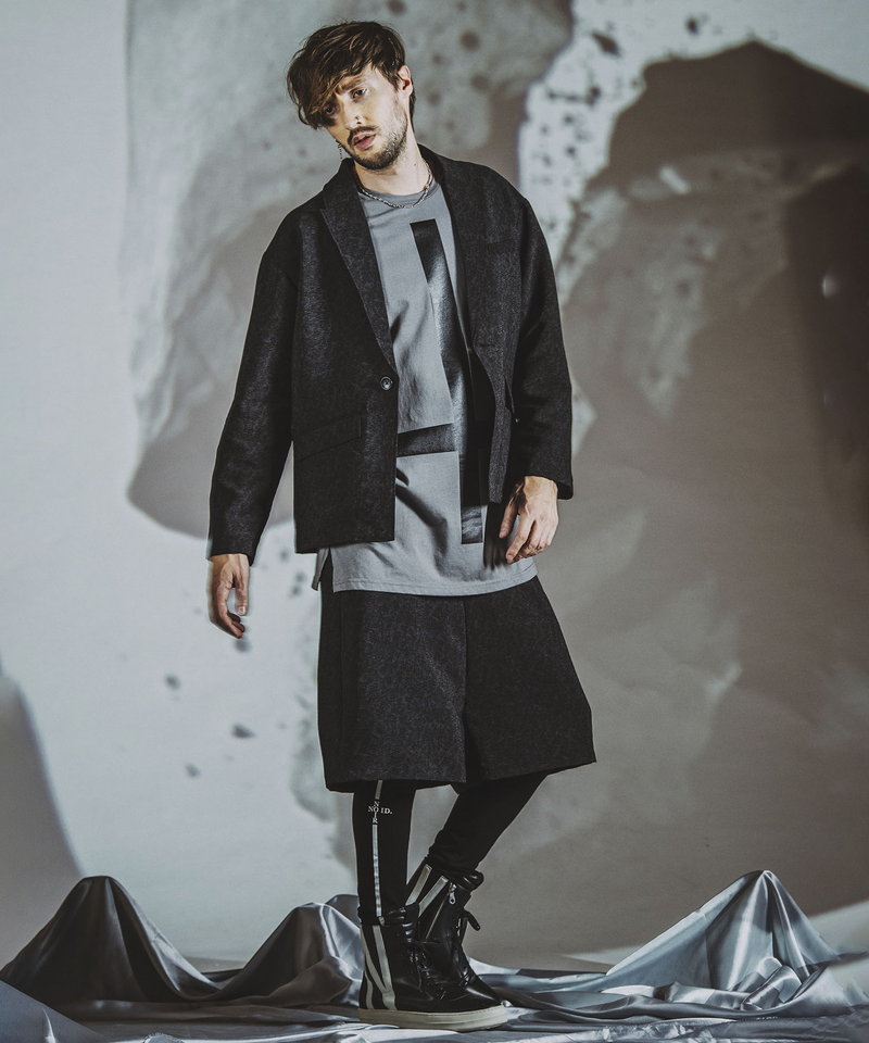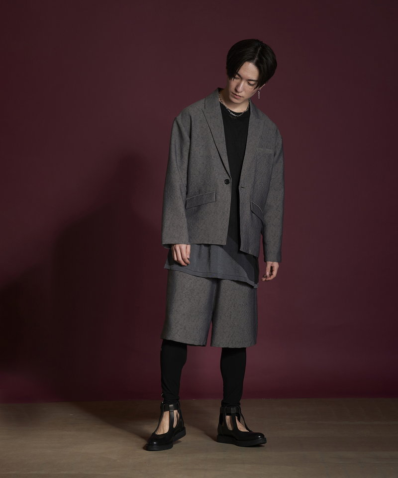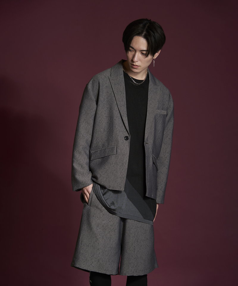 構築的で端正なフォルムの印象が強いテーラードジャケットのショルダーラインや袖幅を広く取る事で脱構築的な抜け感のある表情のジャケットが完成。