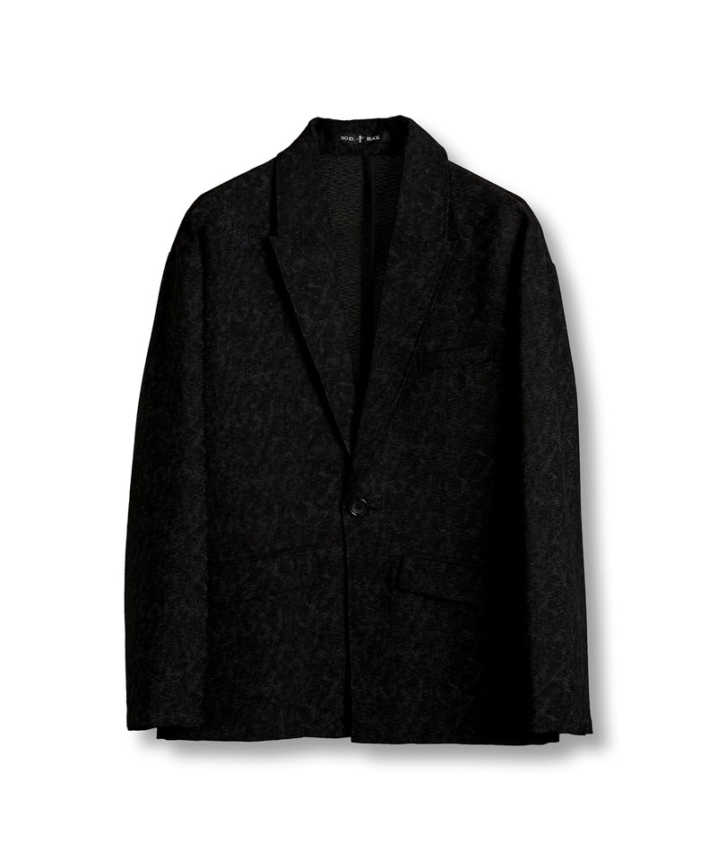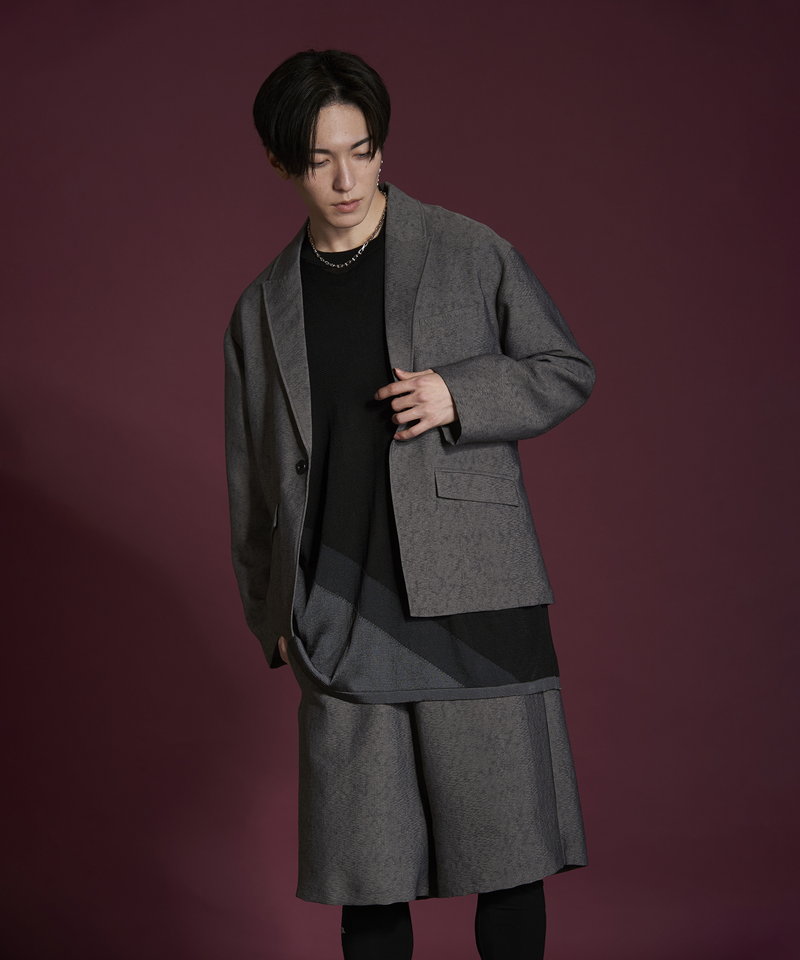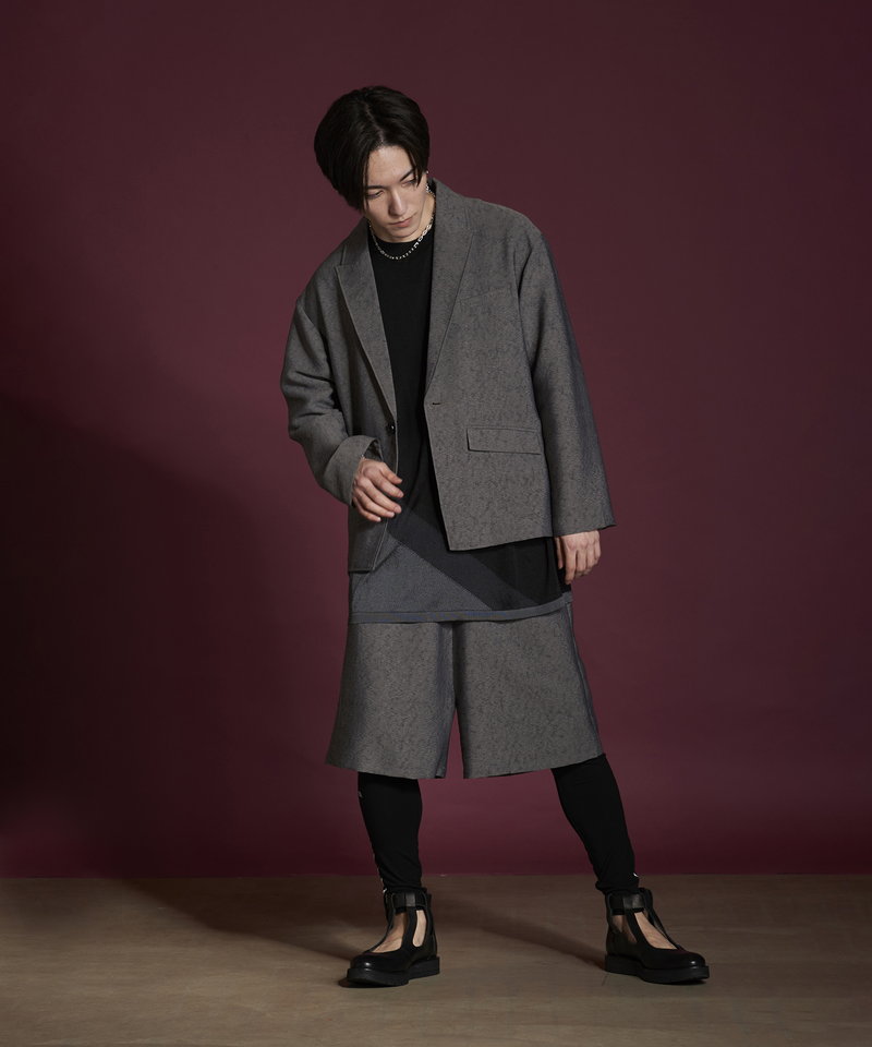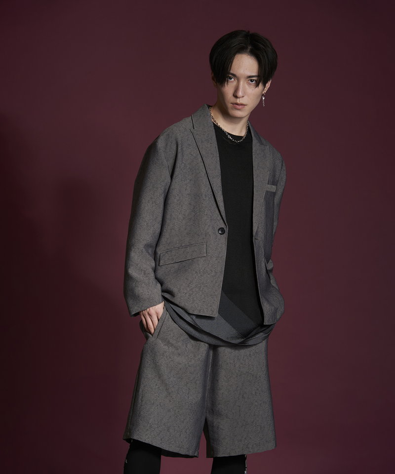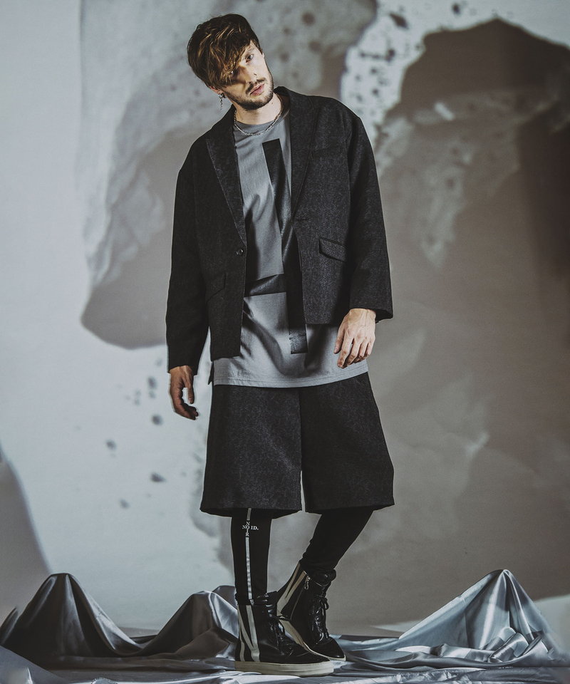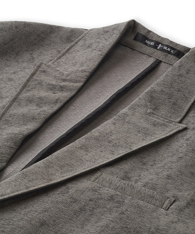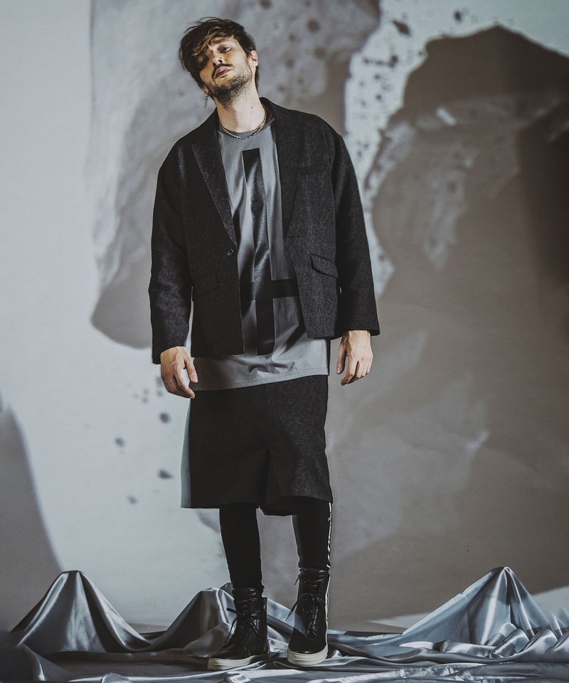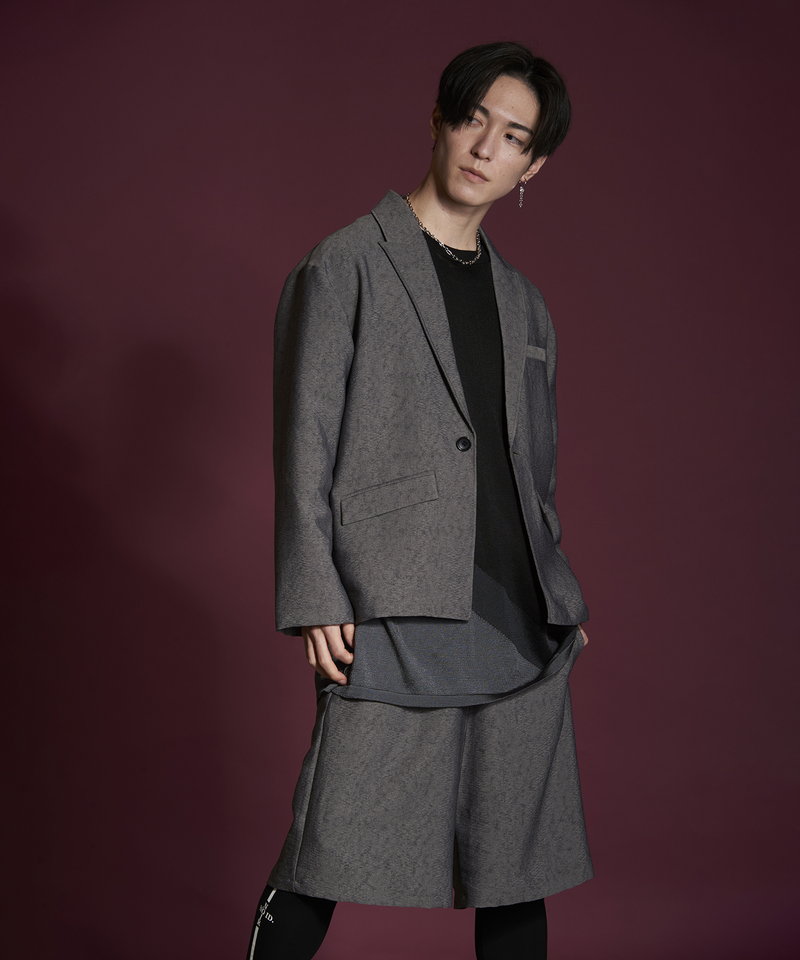 構築的で端正なフォルムの印象が強いテーラードジャケットのショルダーラインや袖幅を広く取る事で脱構築的な抜け感のある表情のジャケットが完成。