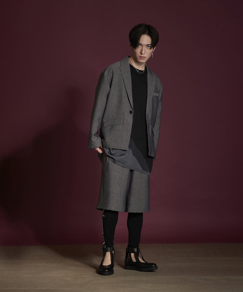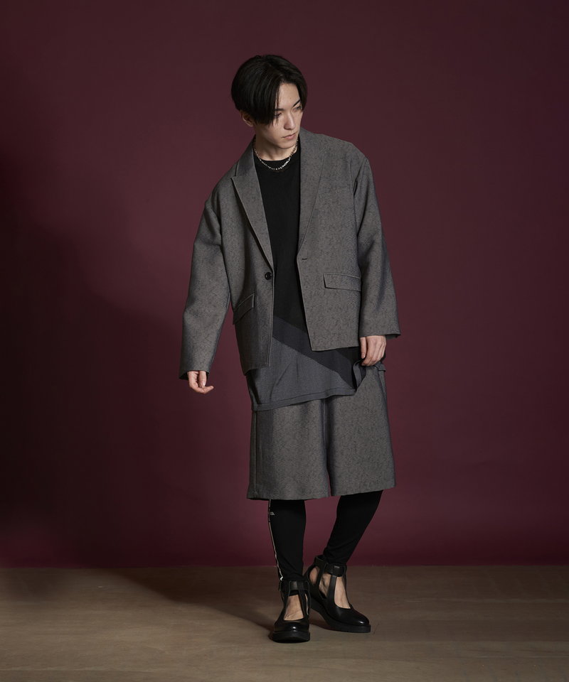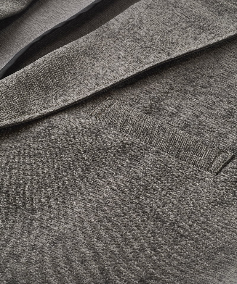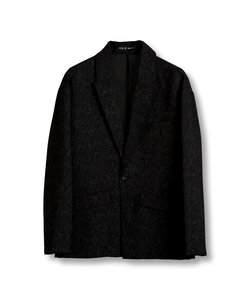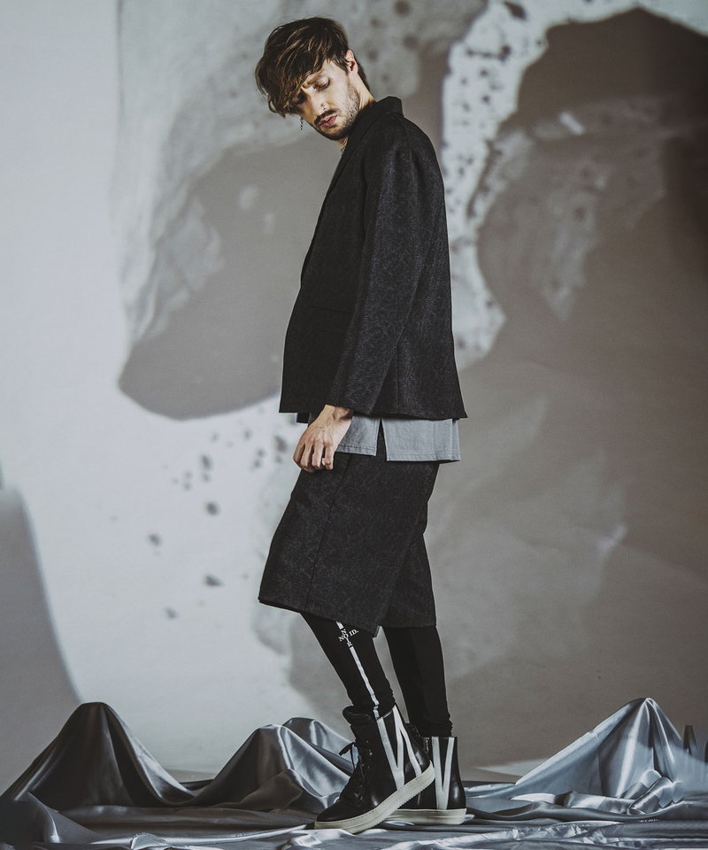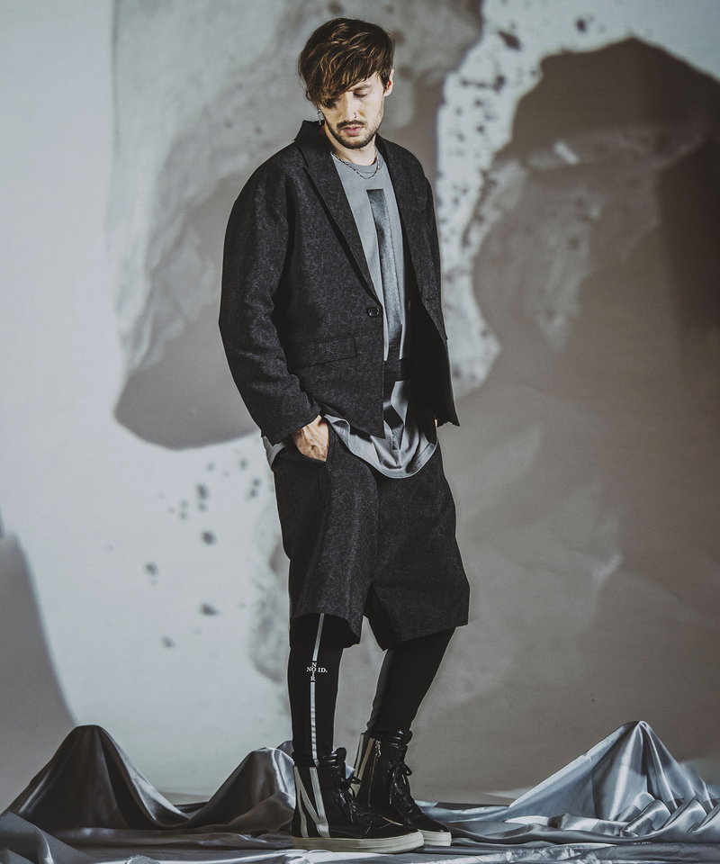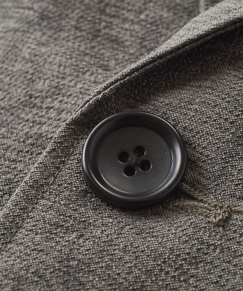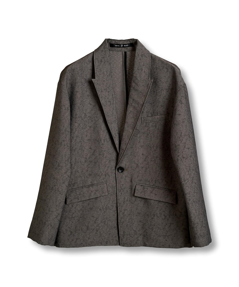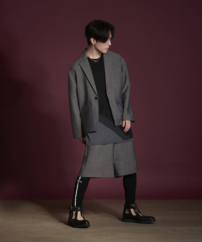 構築的で端正なフォルムの印象が強いテーラードジャケットのショルダーラインや袖幅を広く取る事で脱構築的な抜け感のある表情のジャケットが完成。