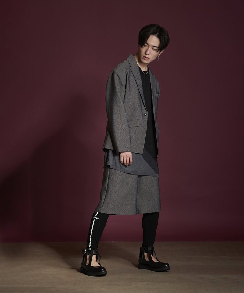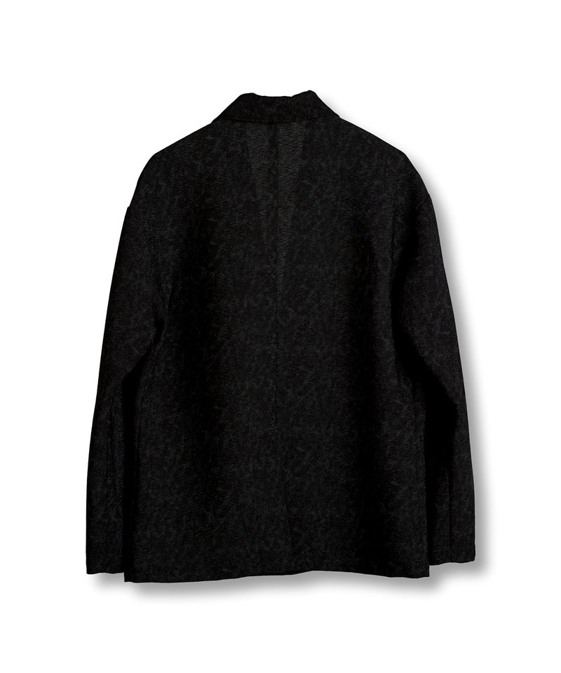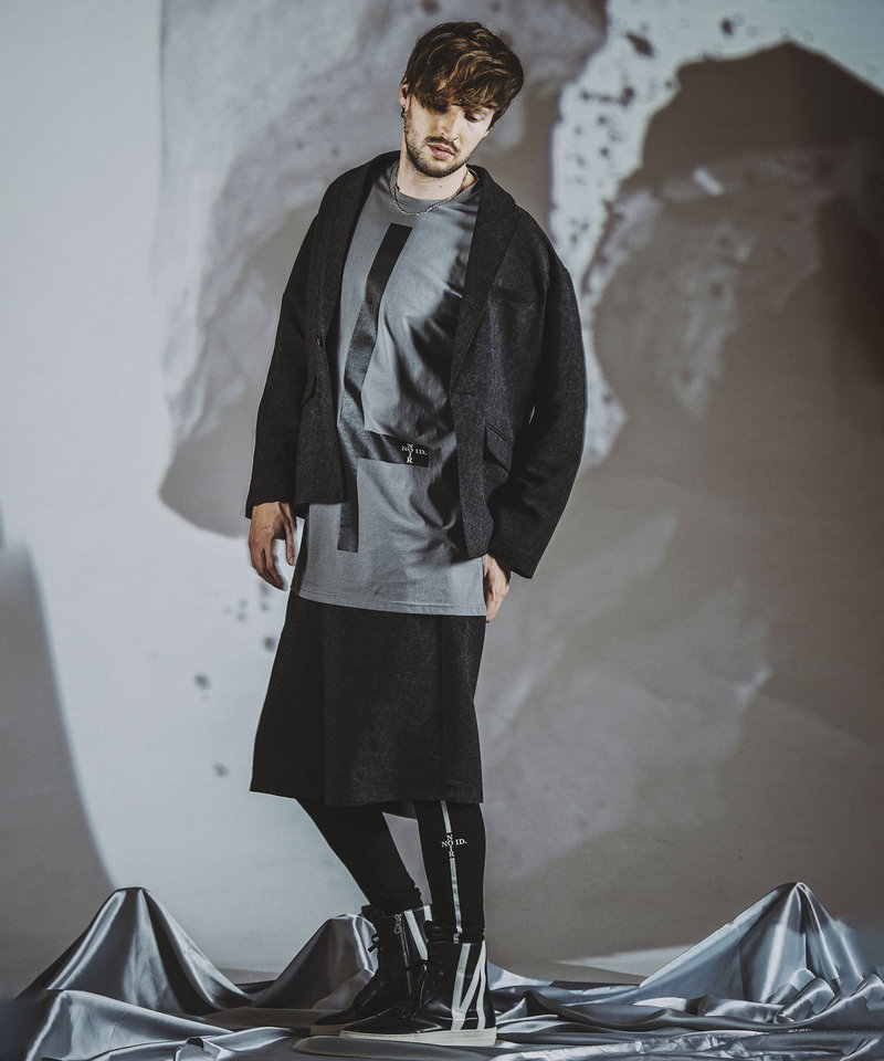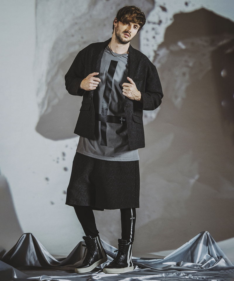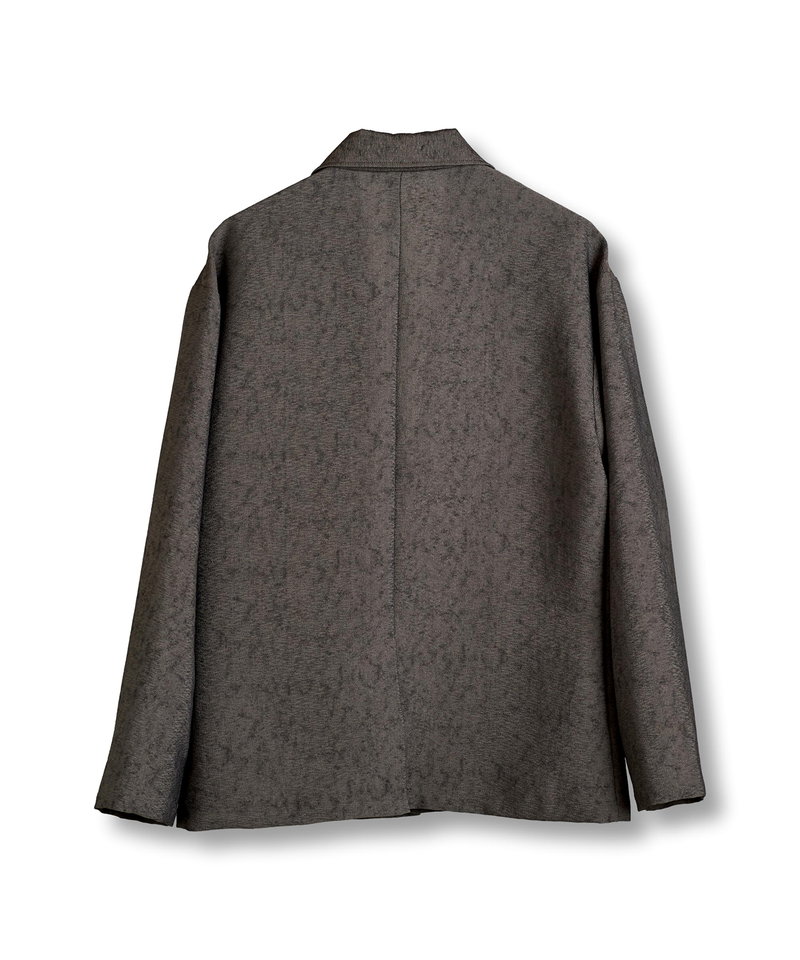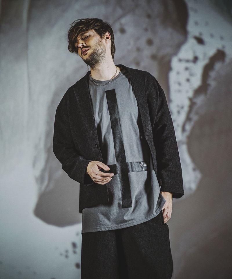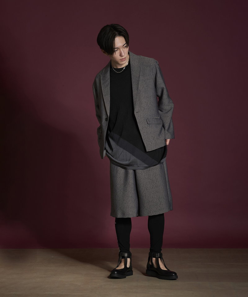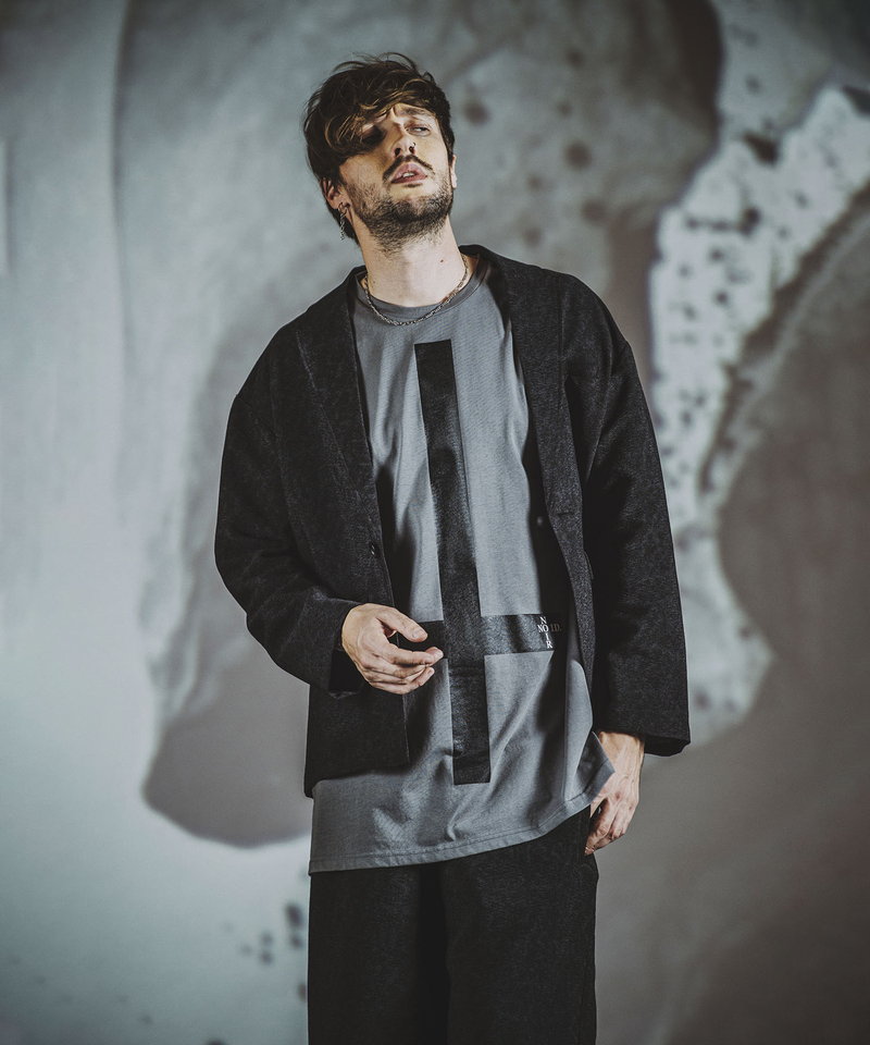 構築的で端正なフォルムの印象が強いテーラードジャケットのショルダーラインや袖幅を広く取る事で脱構築的な抜け感のある表情のジャケットが完成。