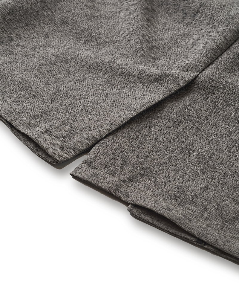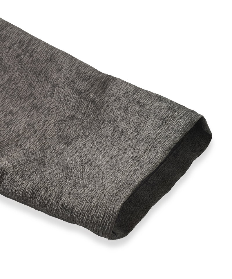 張りのある生地感はドライタッチな着心地で肌にふれてもベタ付きにくく清涼感のある風合いとなっている。