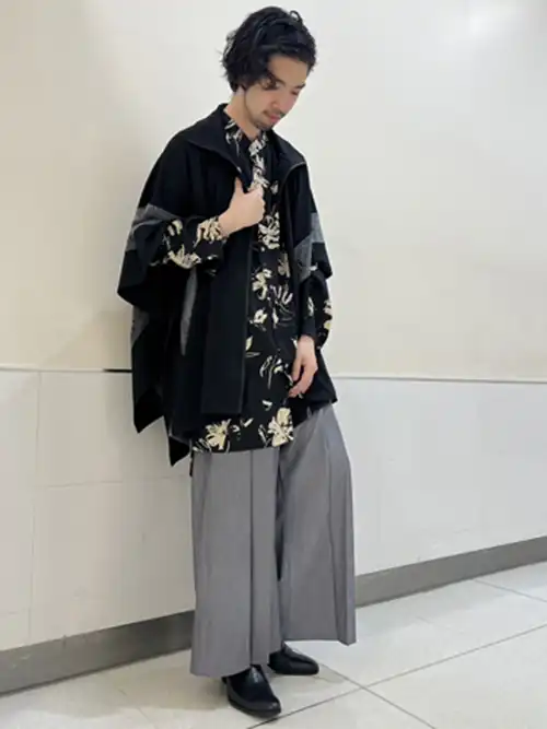 着用する向きを90度ずらすとファスナーが肩の位置になるのでファスナーを広げる事で袖代わりになり表情の変化も楽しめる1枚。