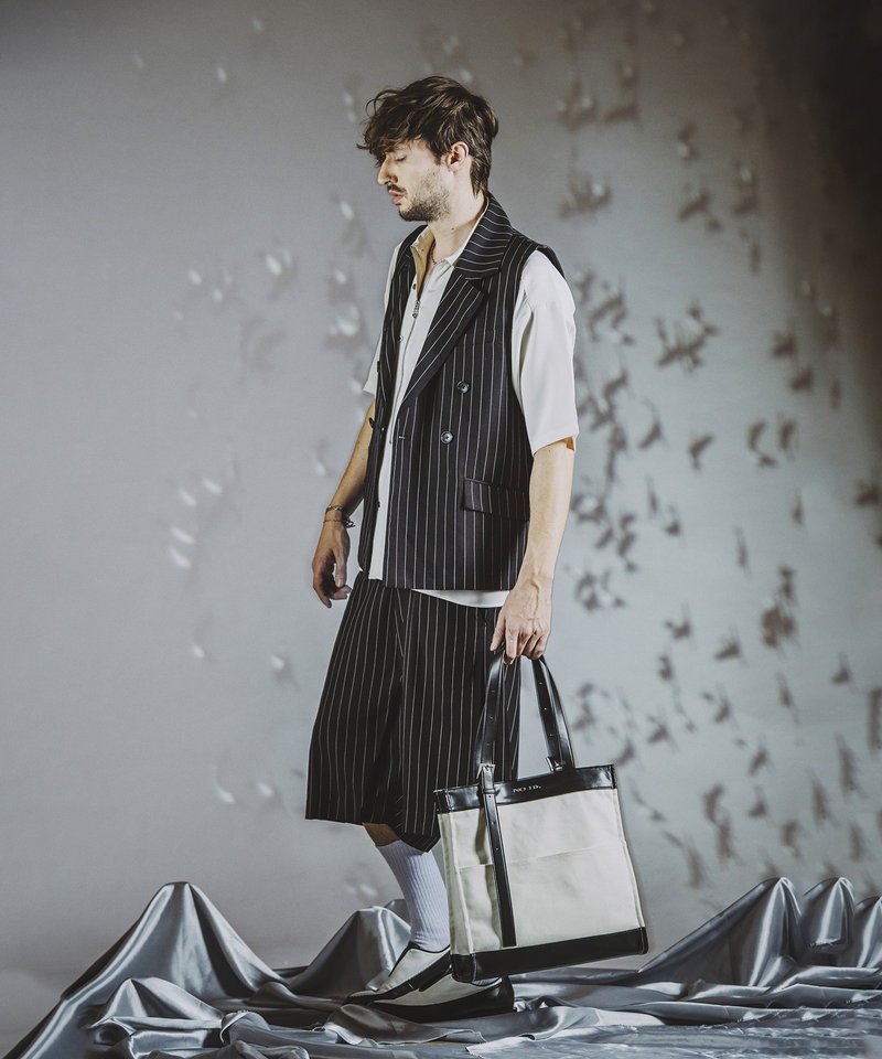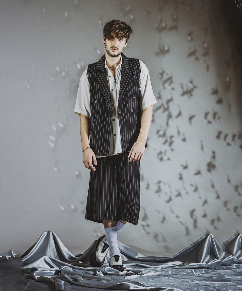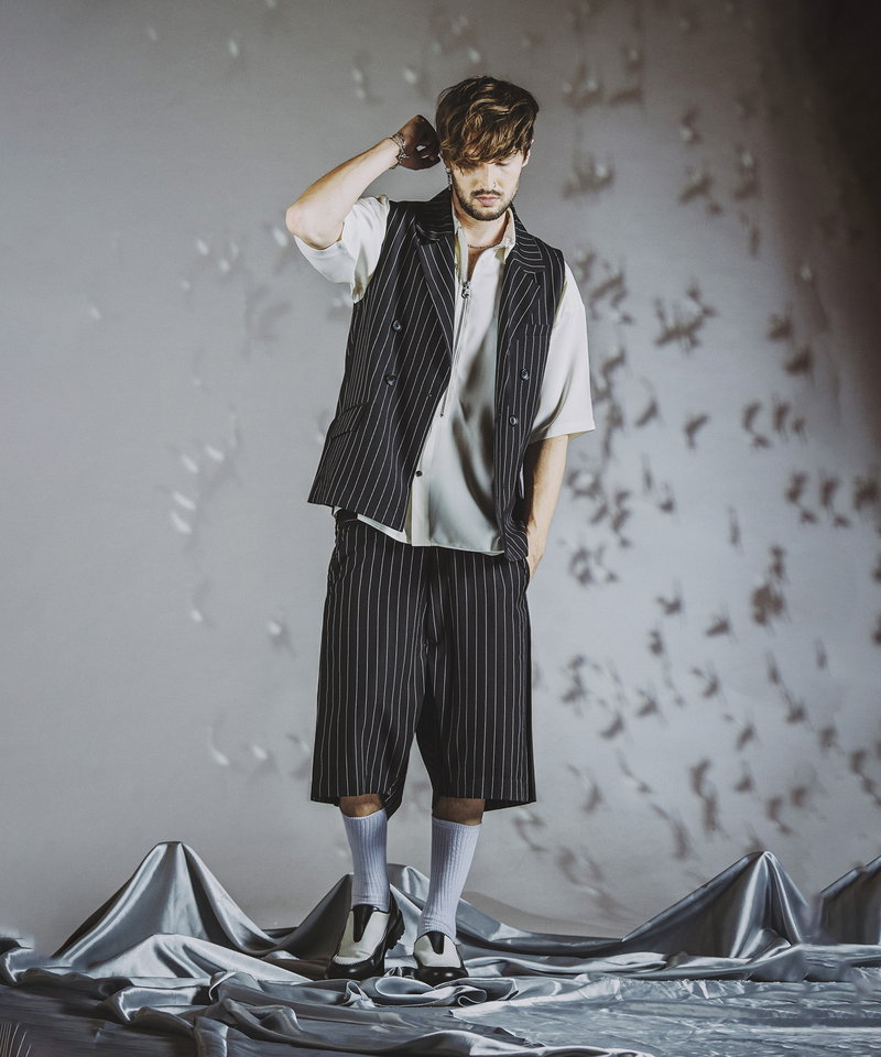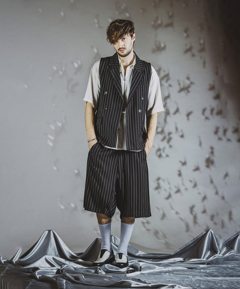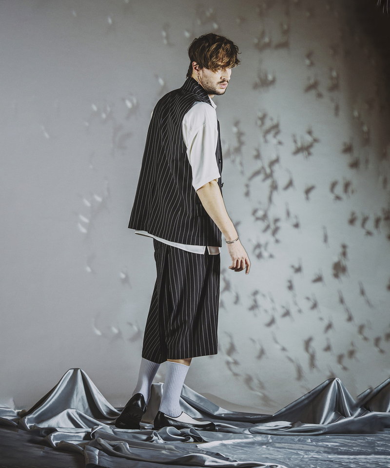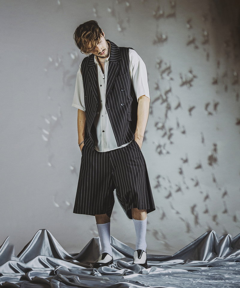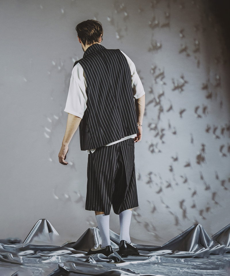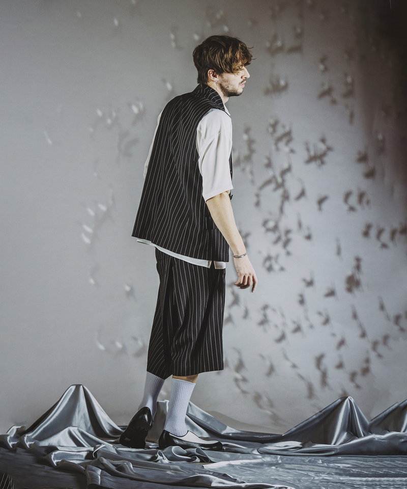 同生地を使用した【454006-786P(インバーテッドプリーツハーフトラウザーズ)】とのセットアップスタイルもお勧め。