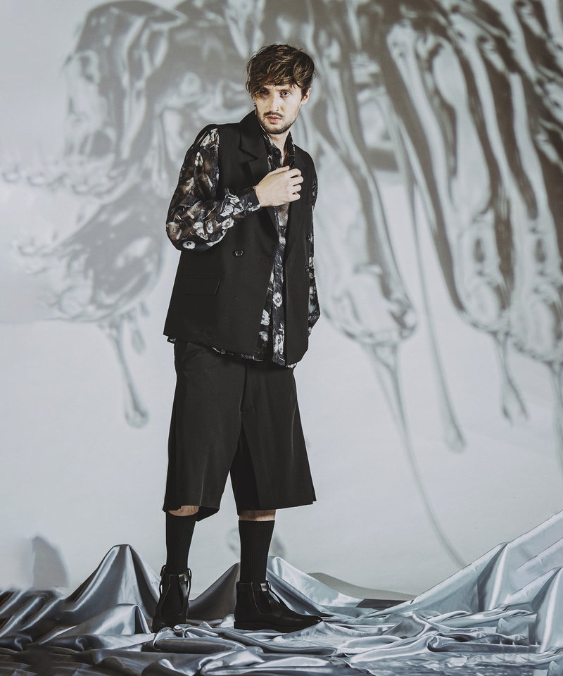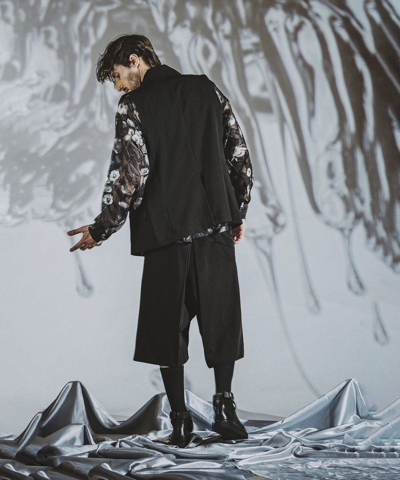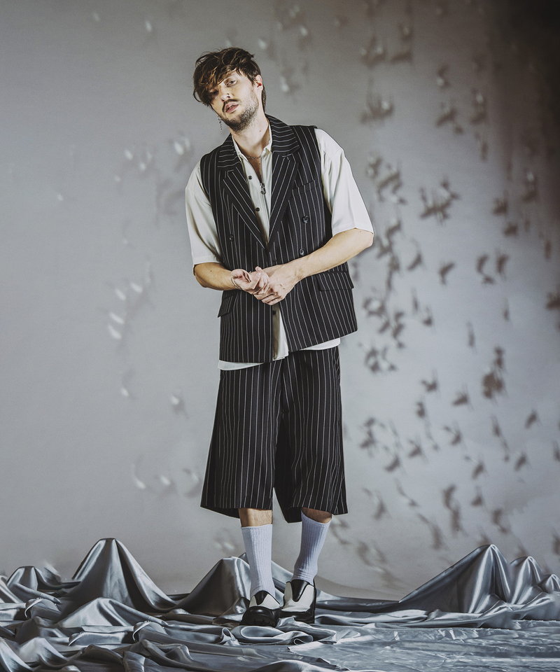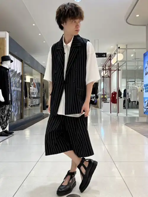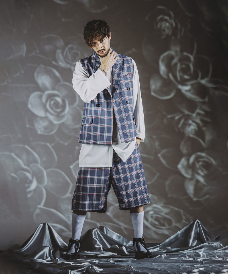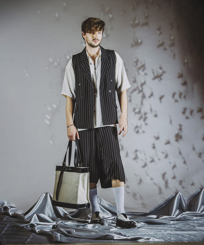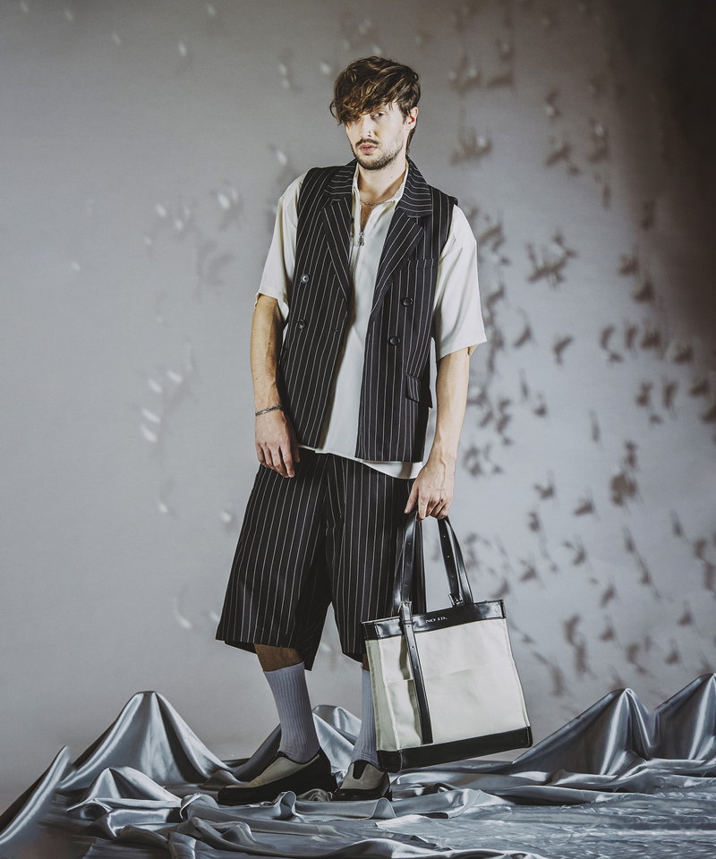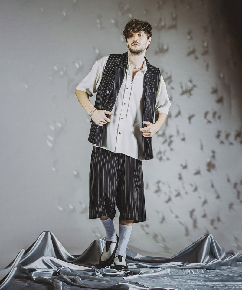 同生地を使用した【454006-786P(インバーテッドプリーツハーフトラウザーズ)】とのセットアップスタイルもお勧め。