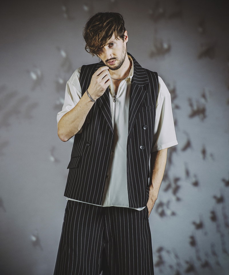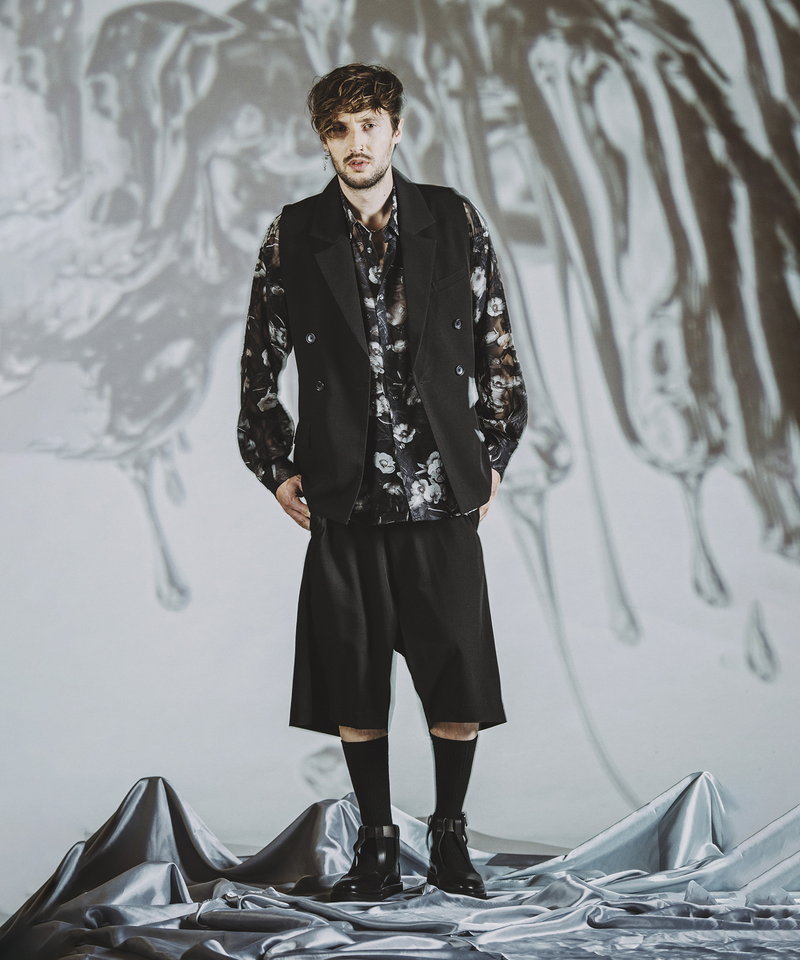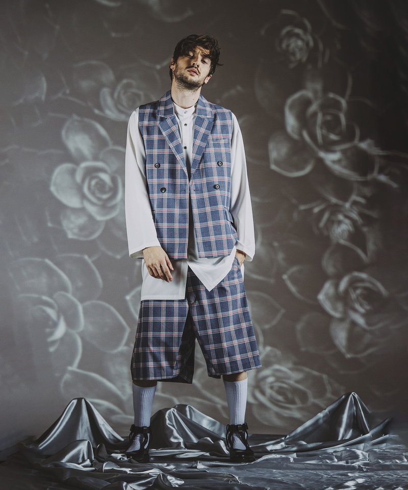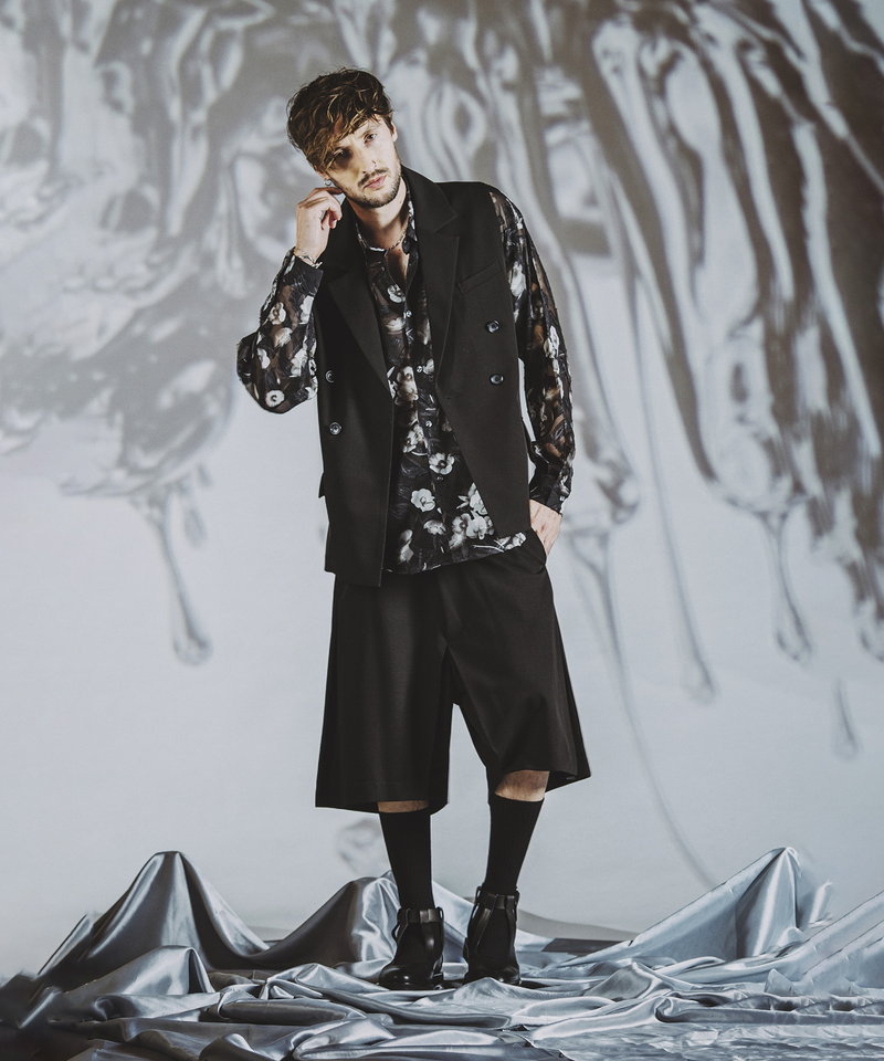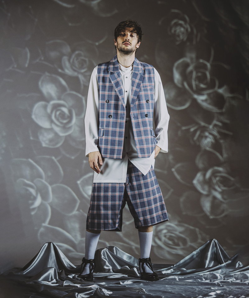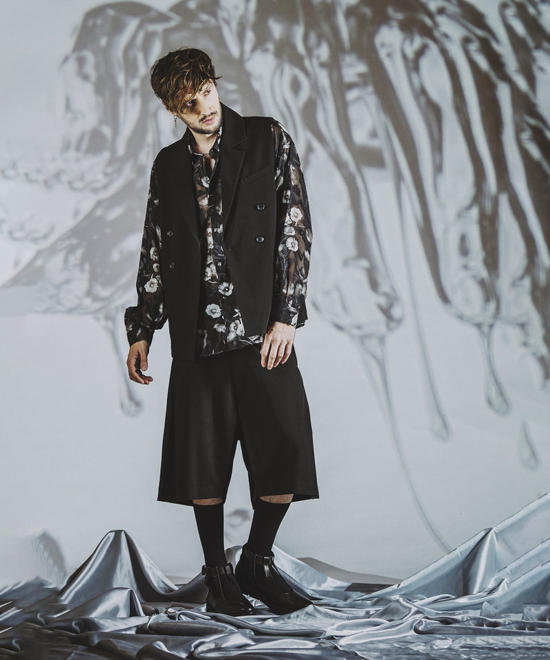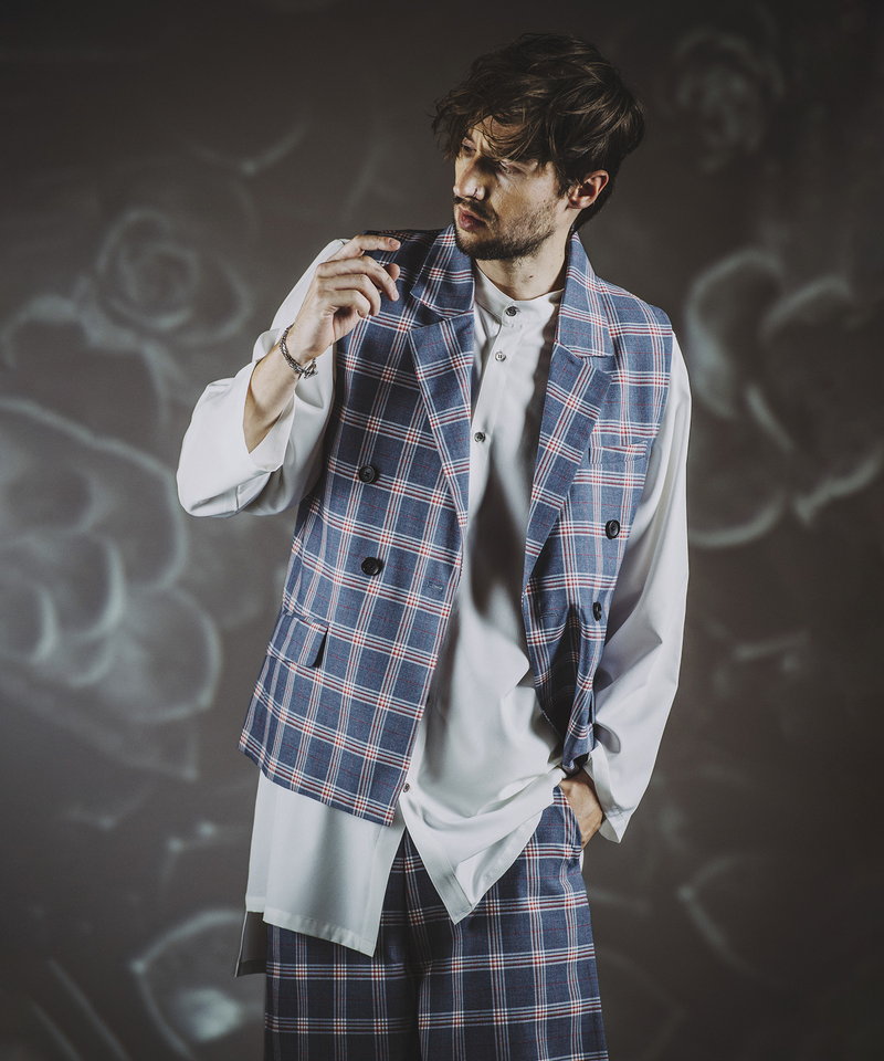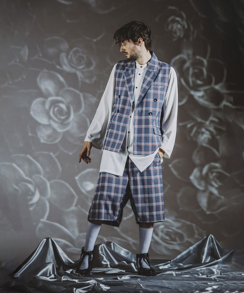 同生地を使用した【454006-786P(インバーテッドプリーツハーフトラウザーズ)】とのセットアップスタイルもお勧め。