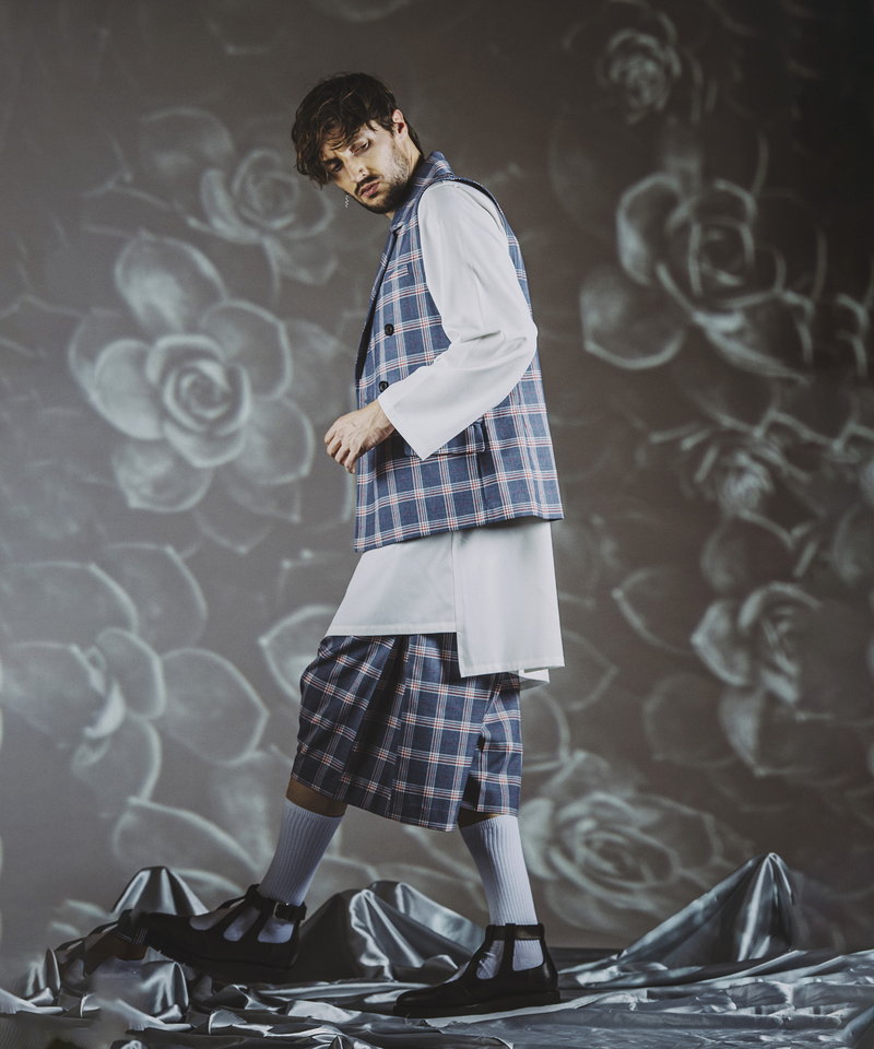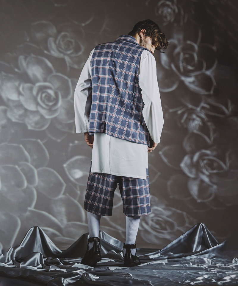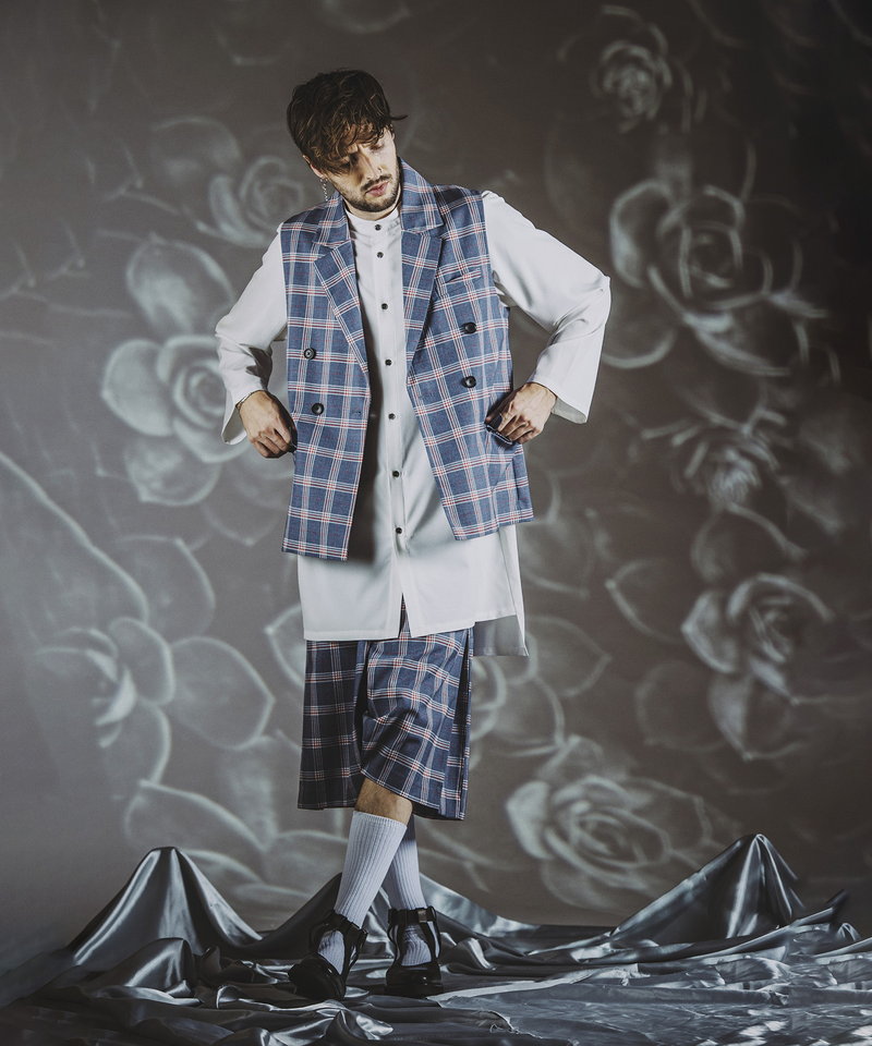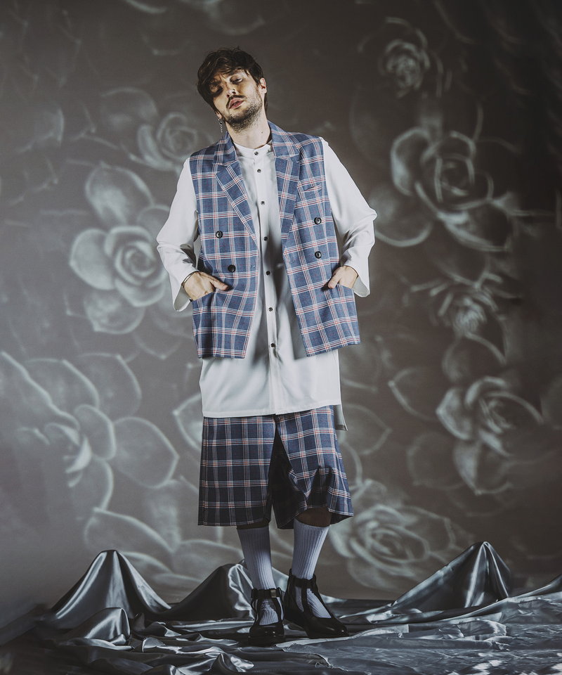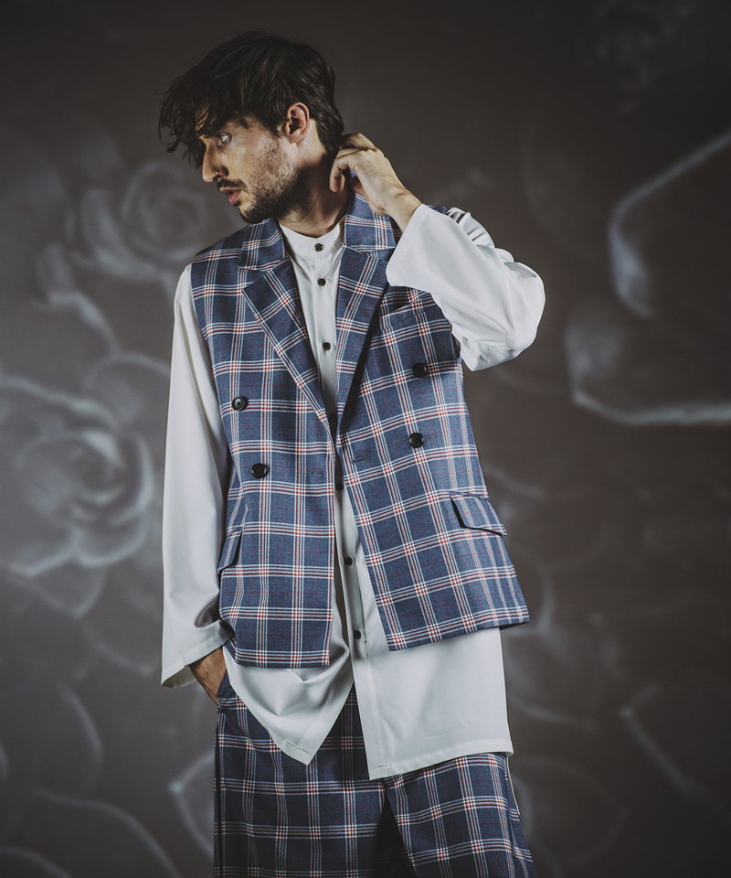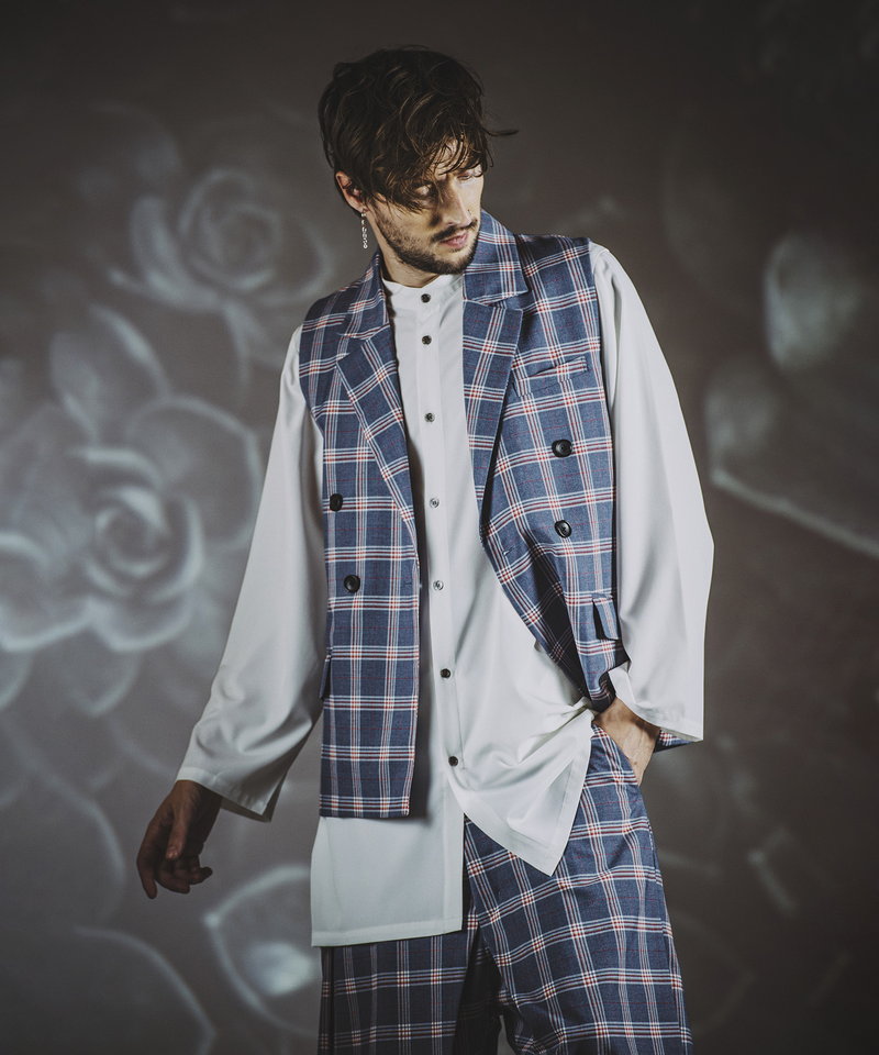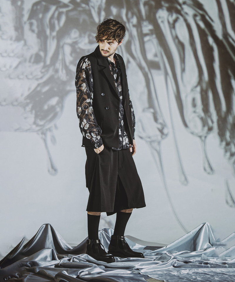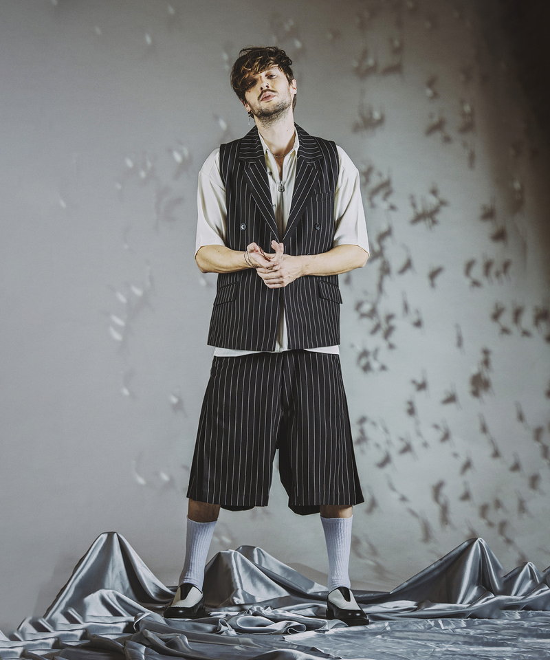 同生地を使用した【454006-786P(インバーテッドプリーツハーフトラウザーズ)】とのセットアップスタイルもお勧め。