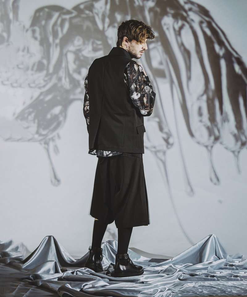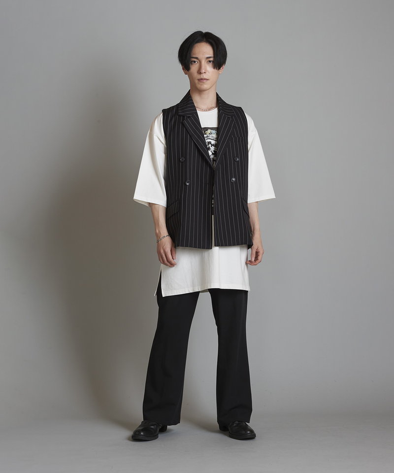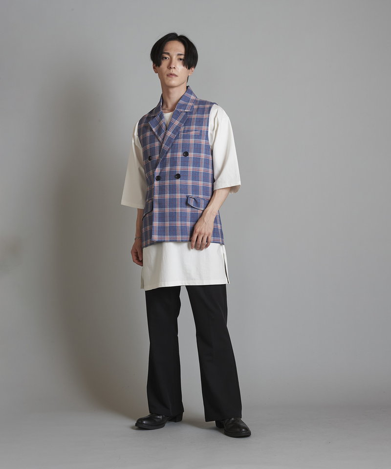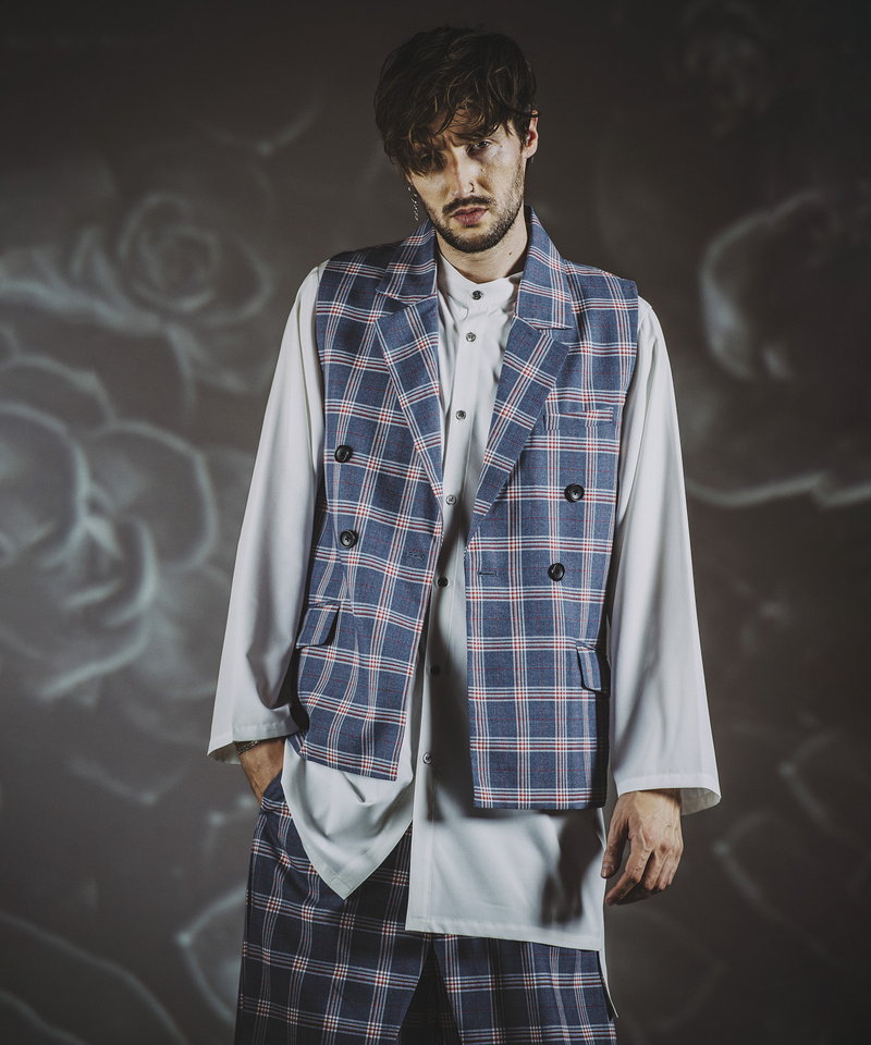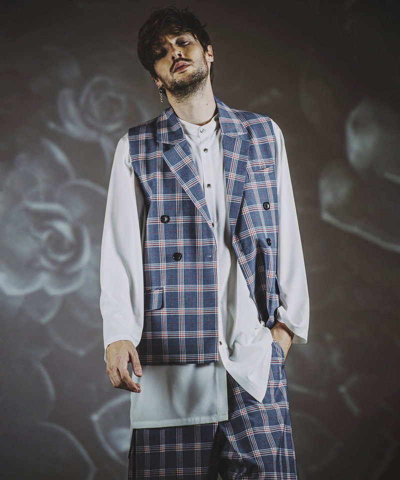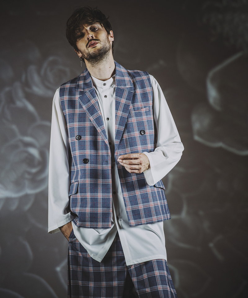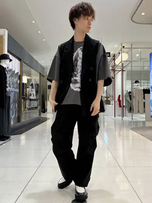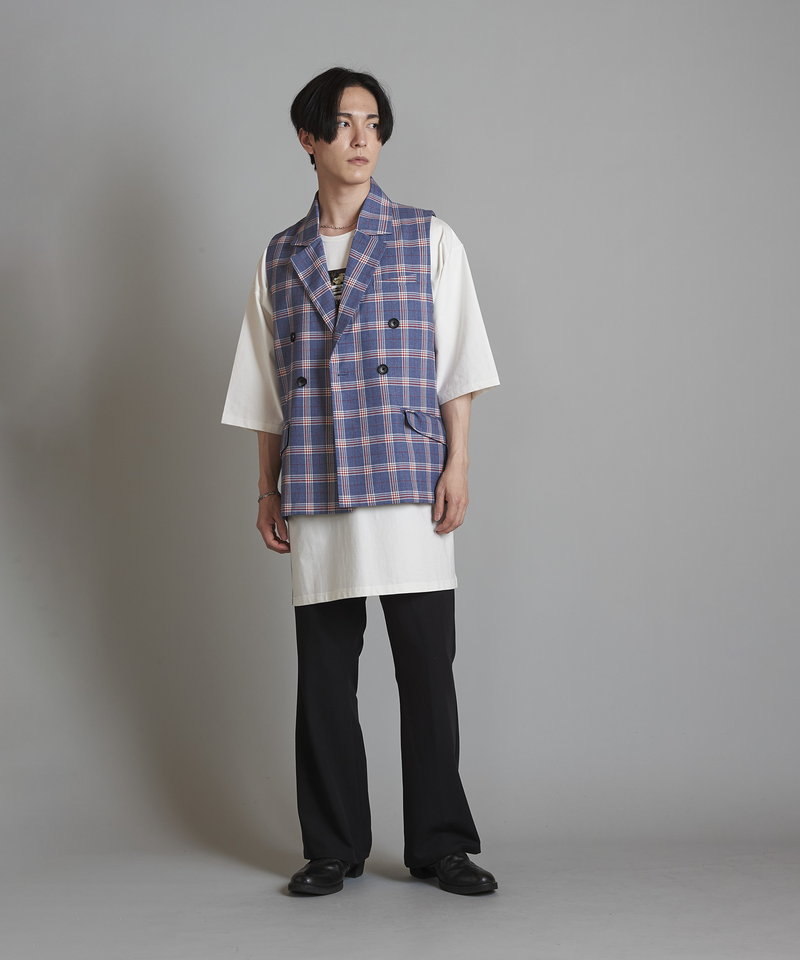同生地を使用した【454006-786P(インバーテッドプリーツハーフトラウザーズ)】とのセットアップスタイルもお勧め。