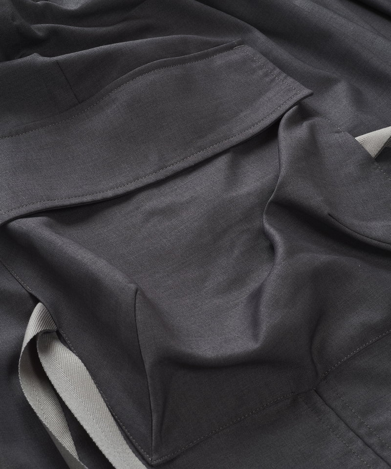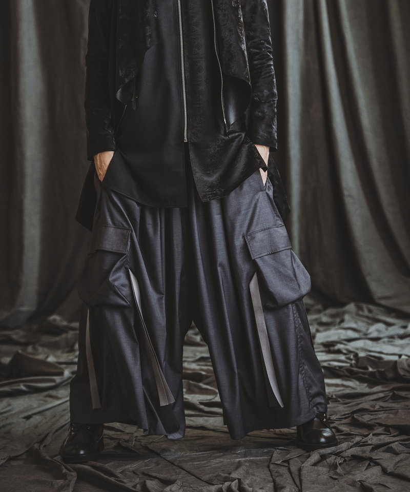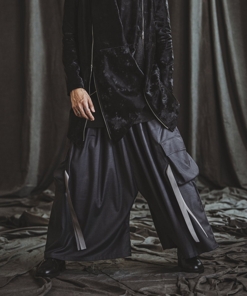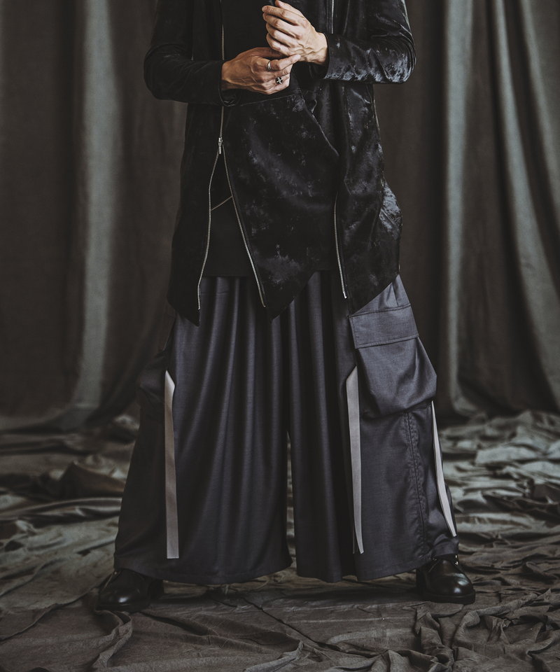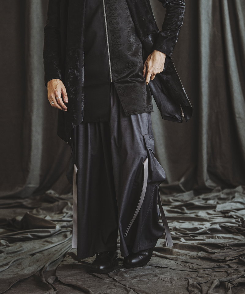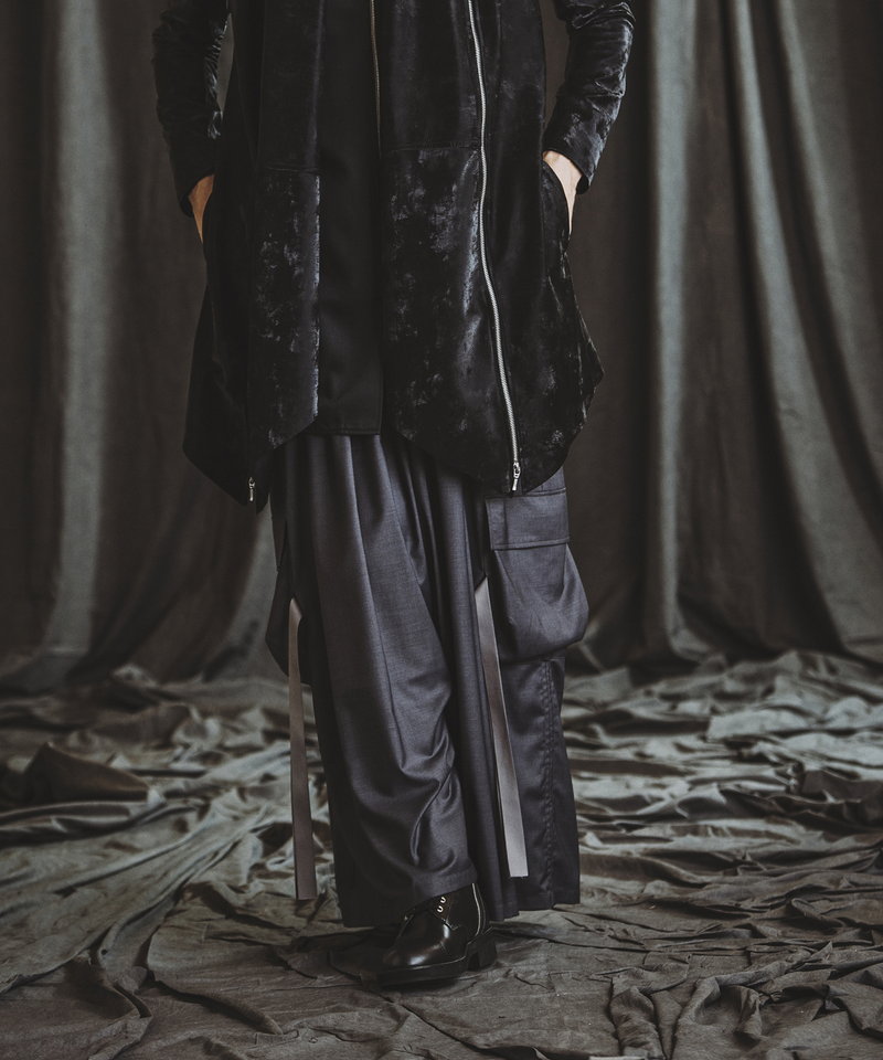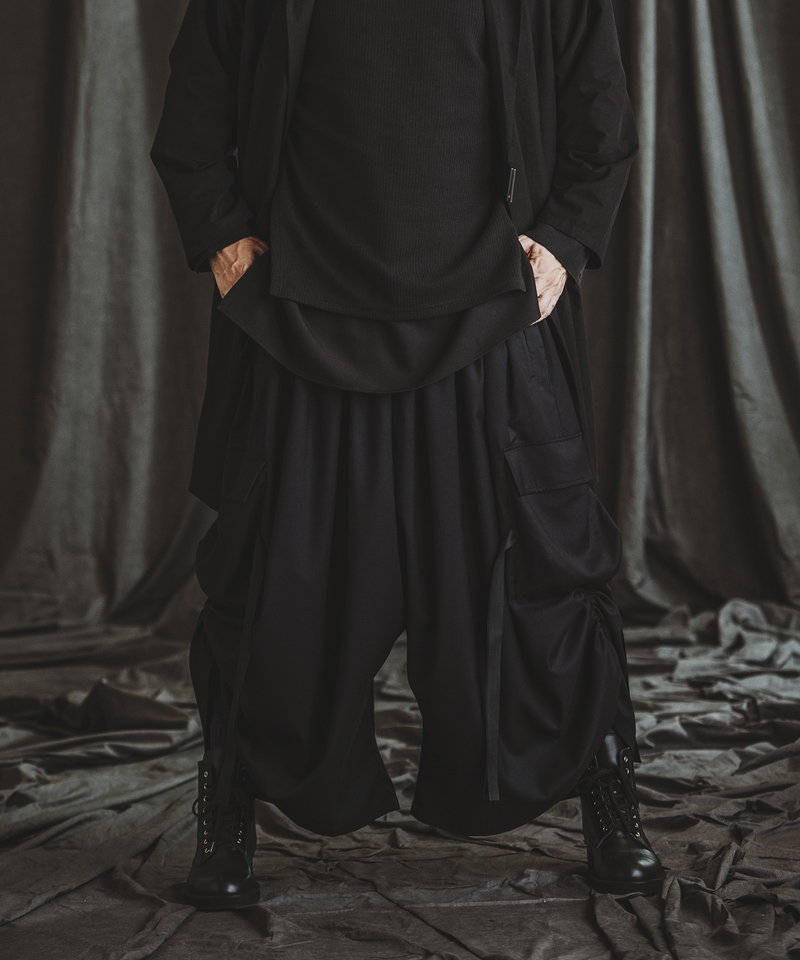前作同様カーゴパンツベースのデザインとなっているが本作は膝から裾にかけてドローコードを配しておりカーゴポケットの中に隠れているコードストッパーを使う事で裾のラインを変形させる事が可能なフレキシブルなデザインとなっている。