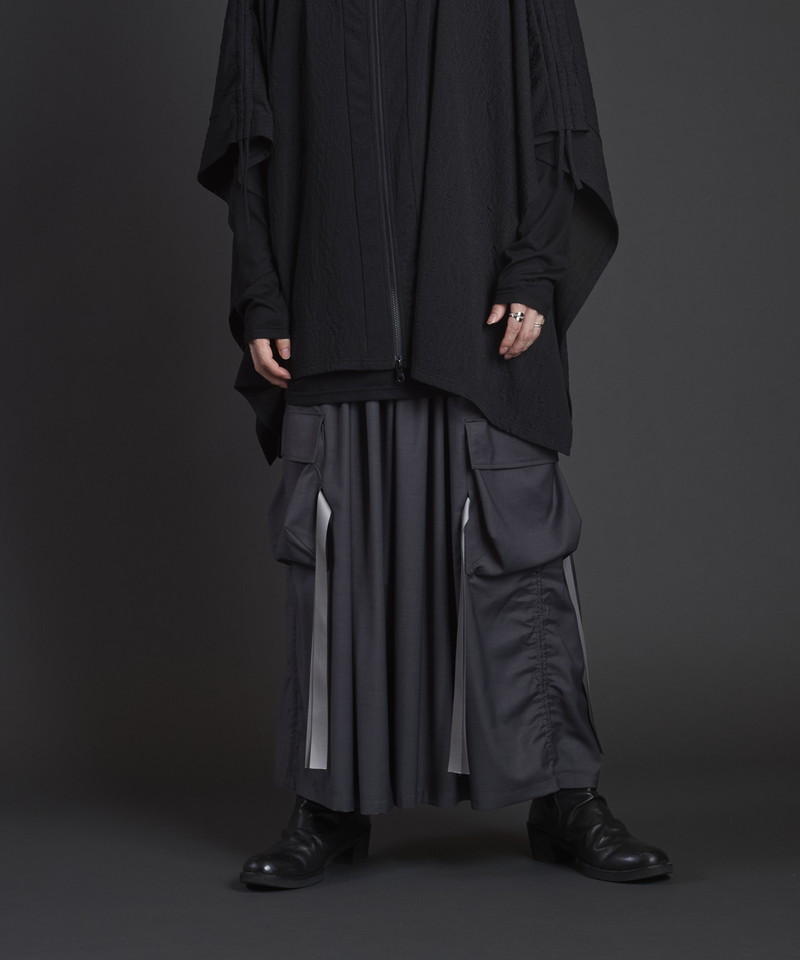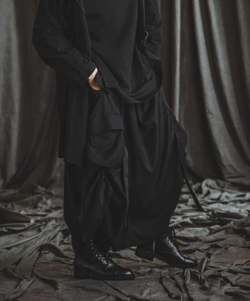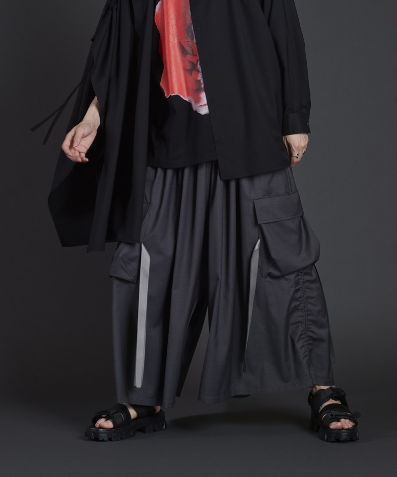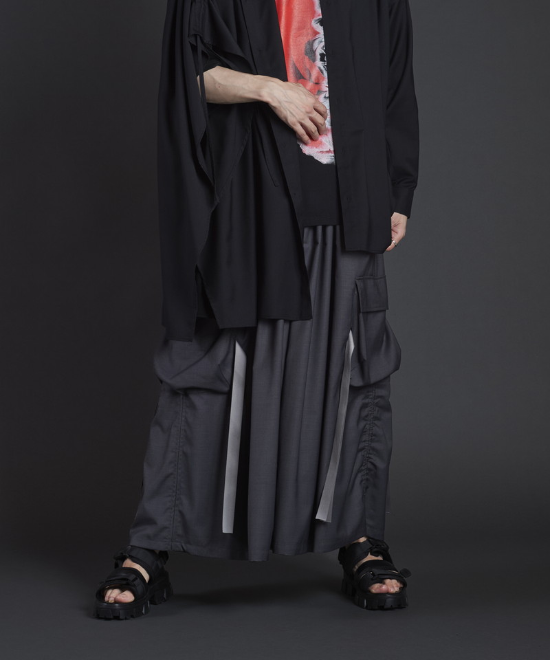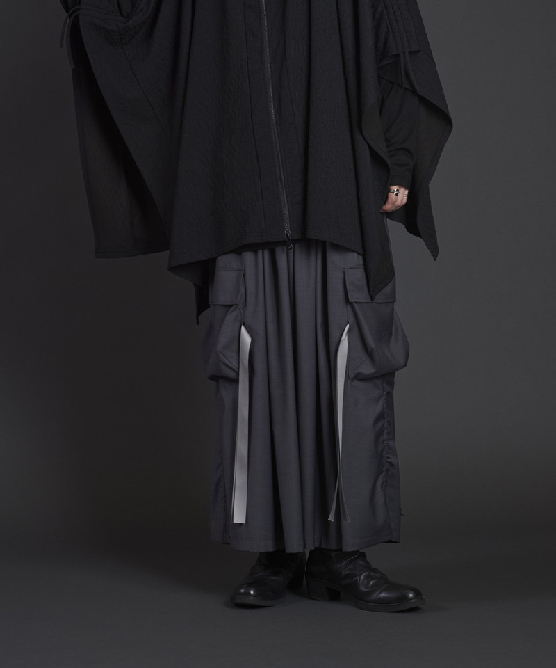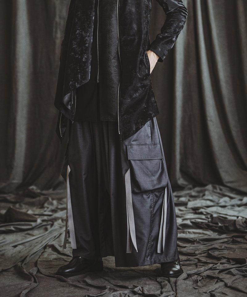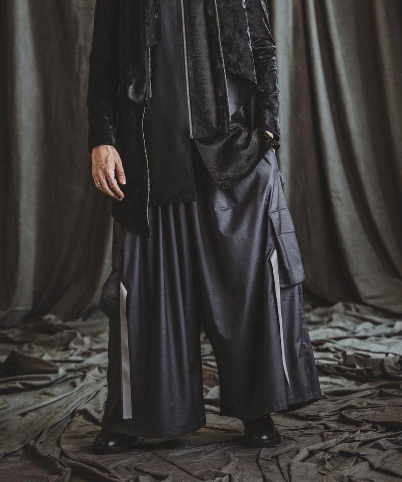 前作同様カーゴパンツベースのデザインとなっているが本作は膝から裾にかけてドローコードを配しておりカーゴポケットの中に隠れているコードストッパーを使う事で裾のラインを変形させる事が可能なフレキシブルなデザインとなっている。