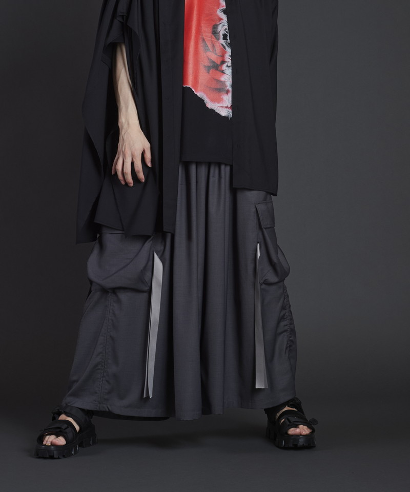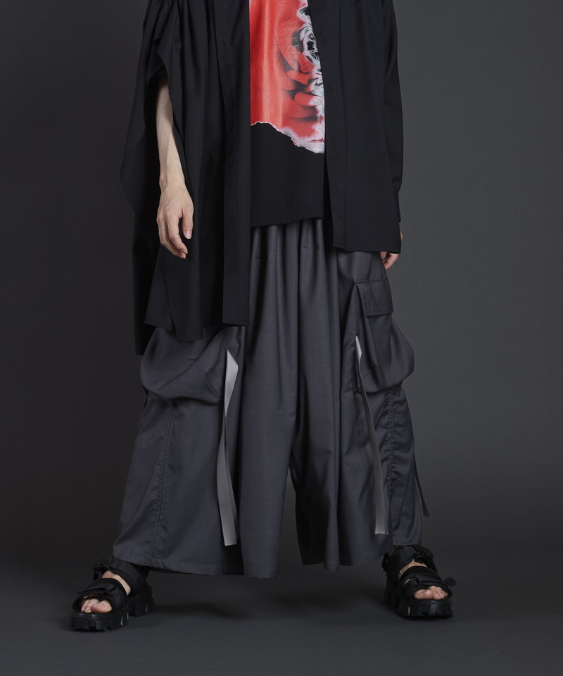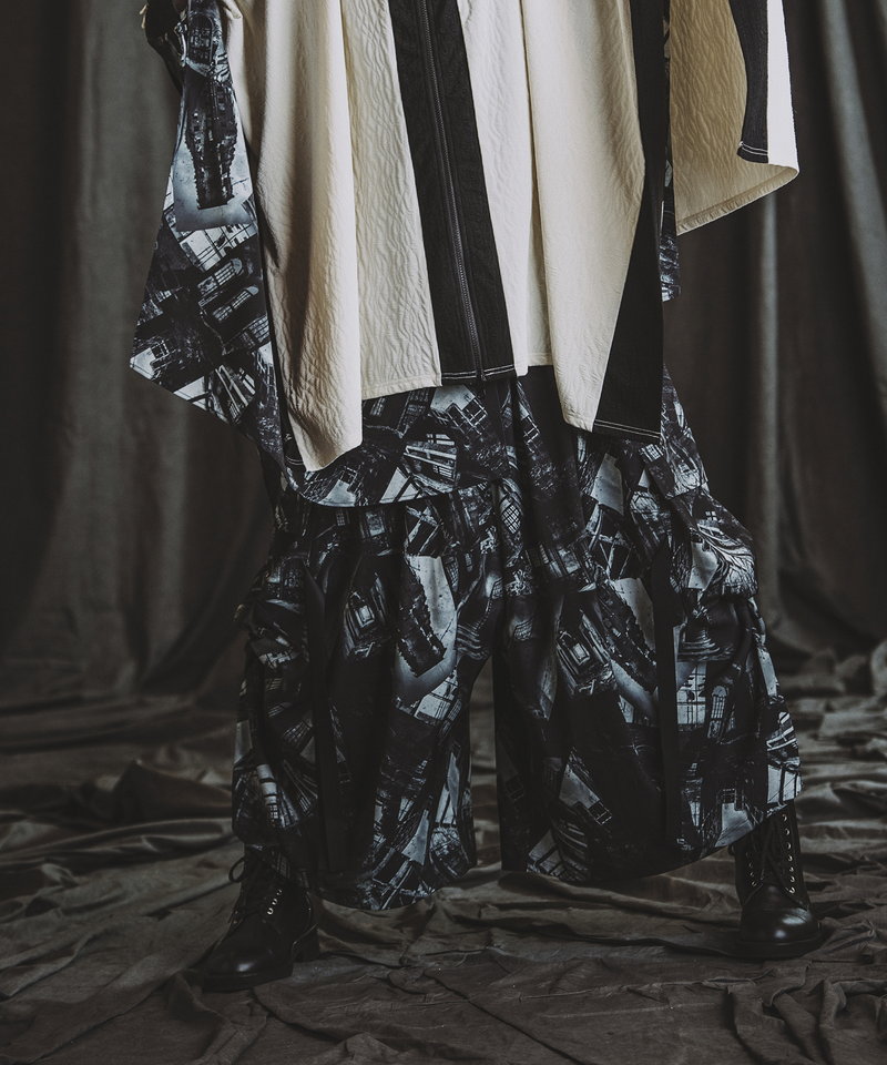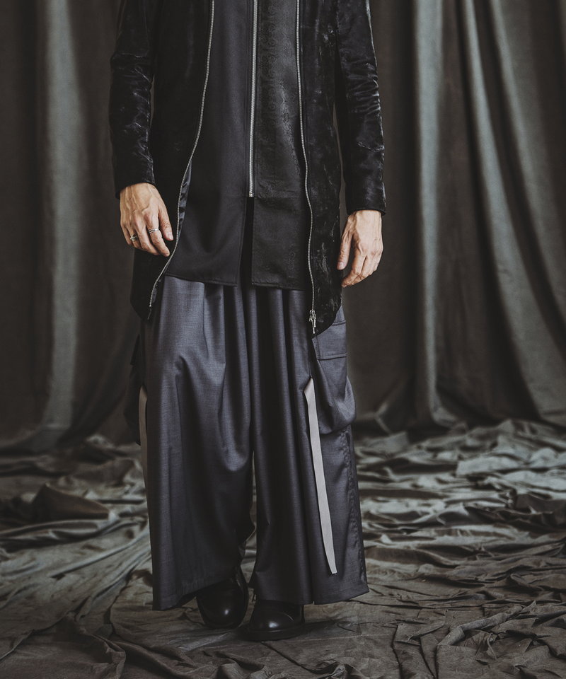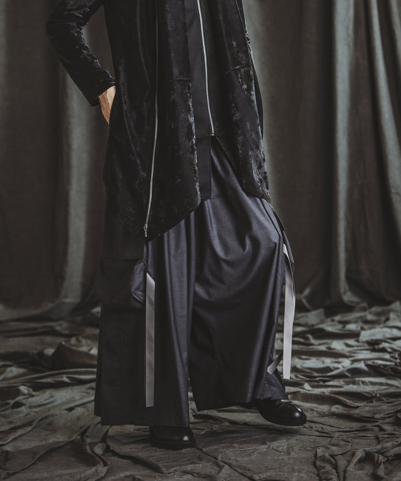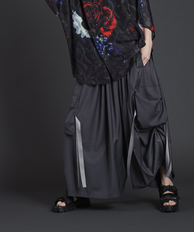 一般的なパンツで使用する生地の3倍近い量を贅沢に使いギャザーで生地を寄せる事でランダムなドレープを描いた躍動感のあるトラウザーズ。