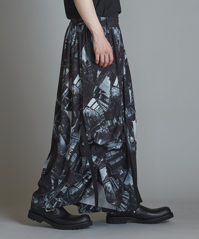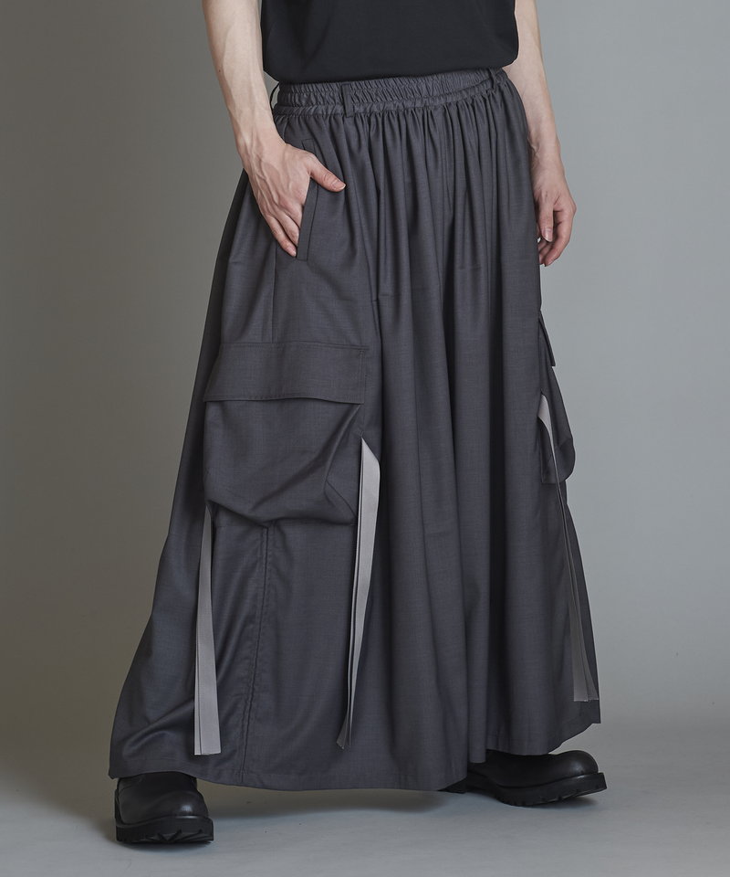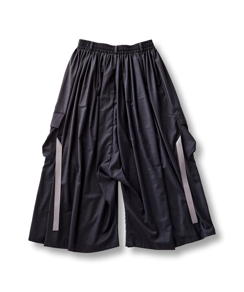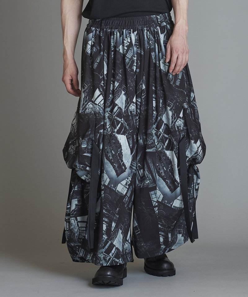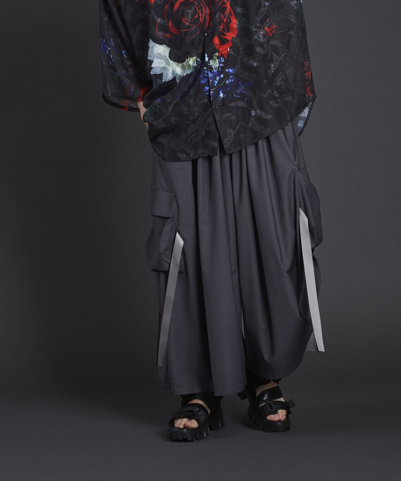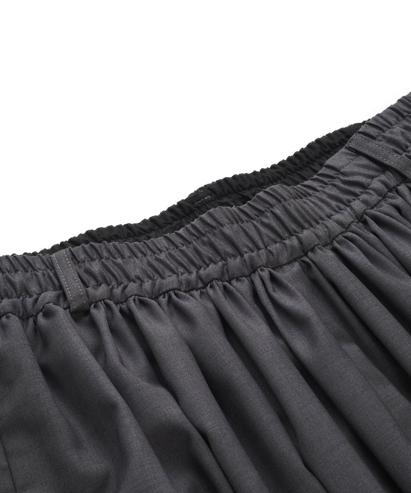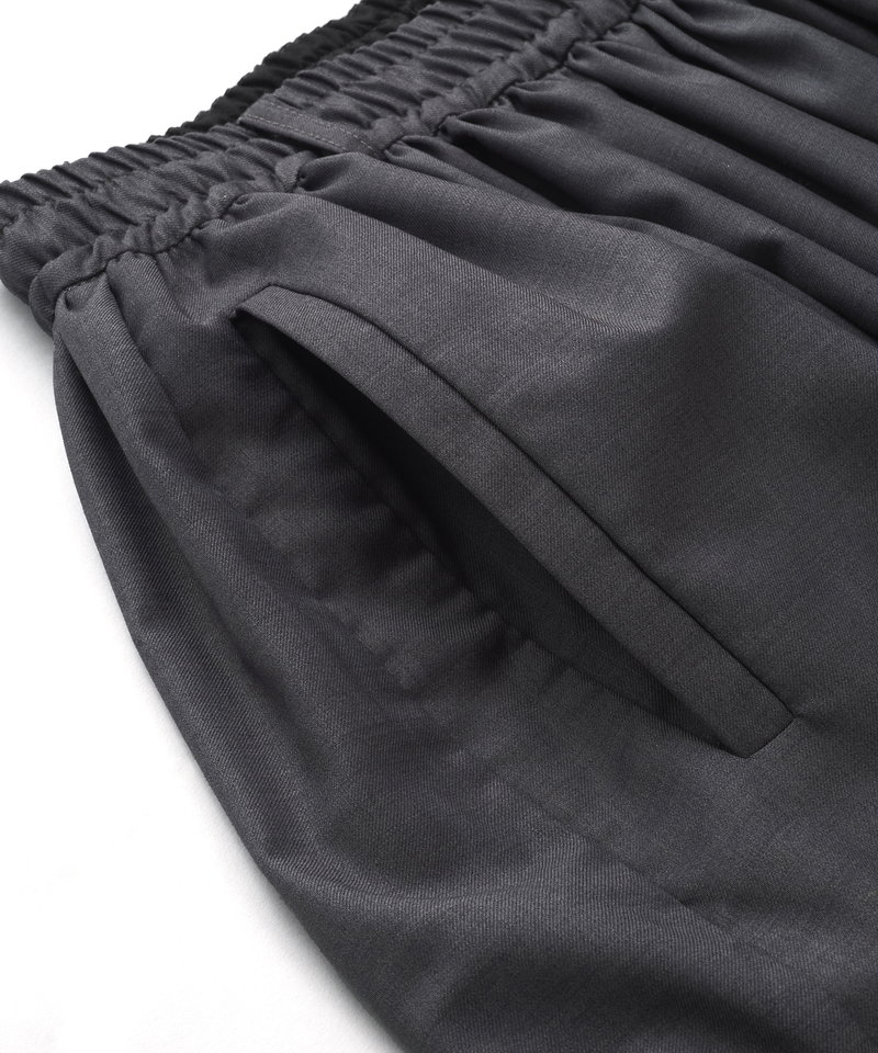一般的なパンツで使用する生地の3倍近い量を贅沢に使いギャザーで生地を寄せる事でランダムなドレープを描いた躍動感のあるトラウザーズ。