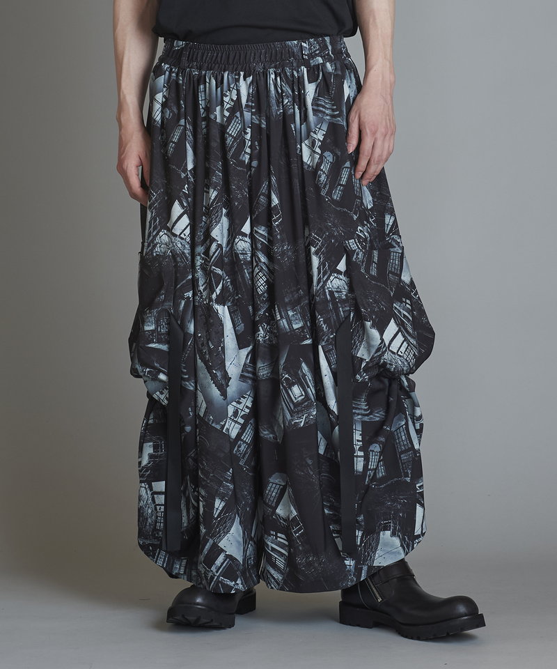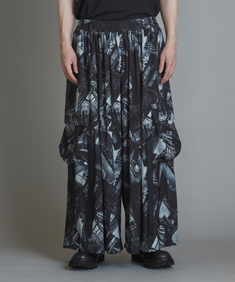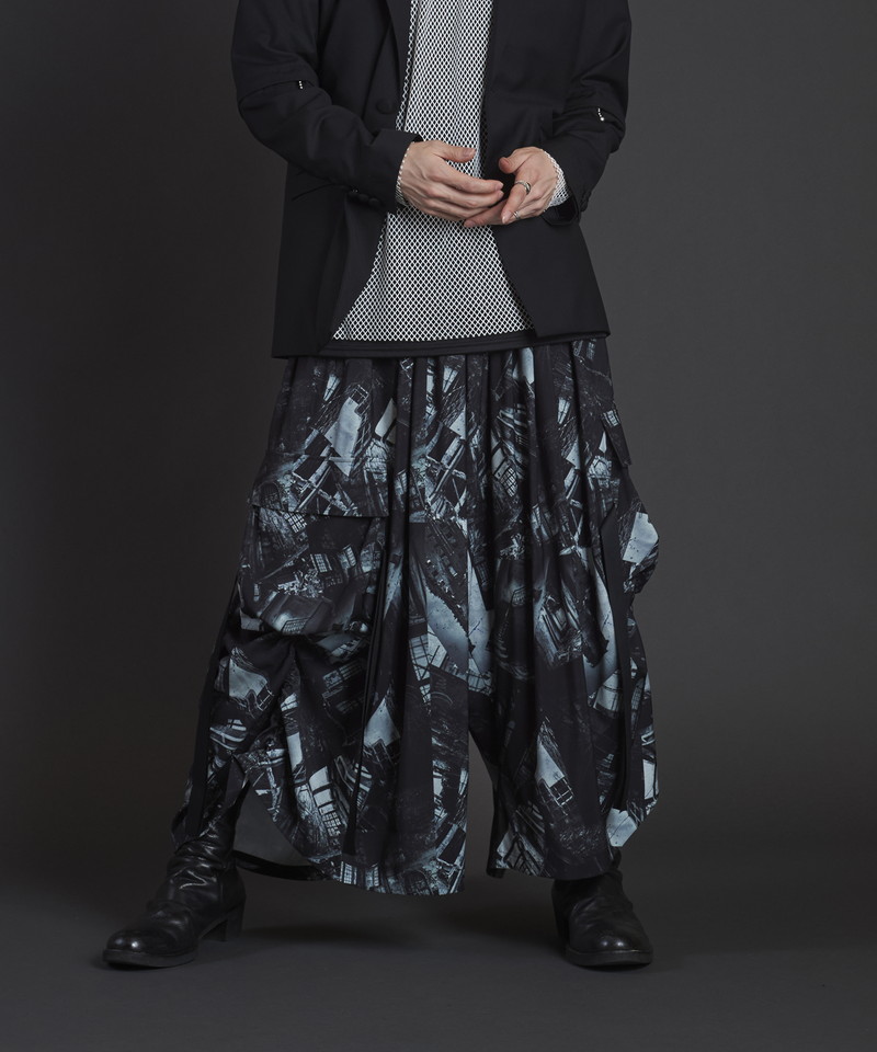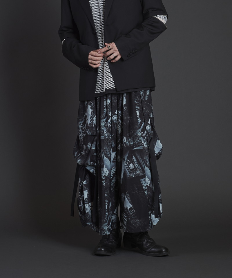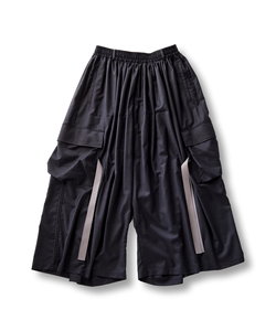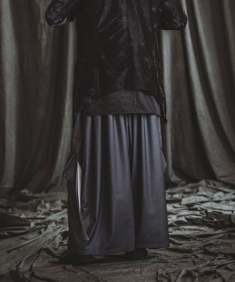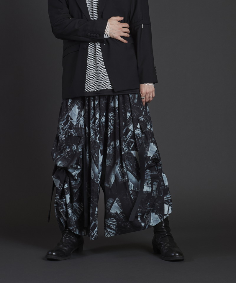 一般的なパンツで使用する生地の3倍近い量を贅沢に使いギャザーで生地を寄せる事でランダムなドレープを描いた躍動感のあるトラウザーズ。