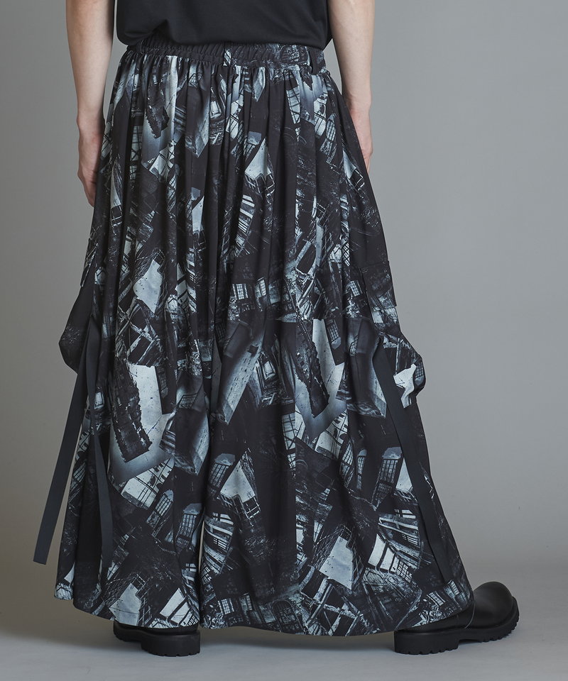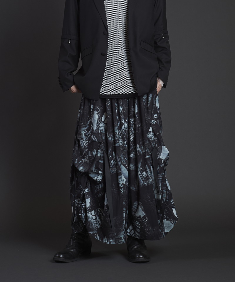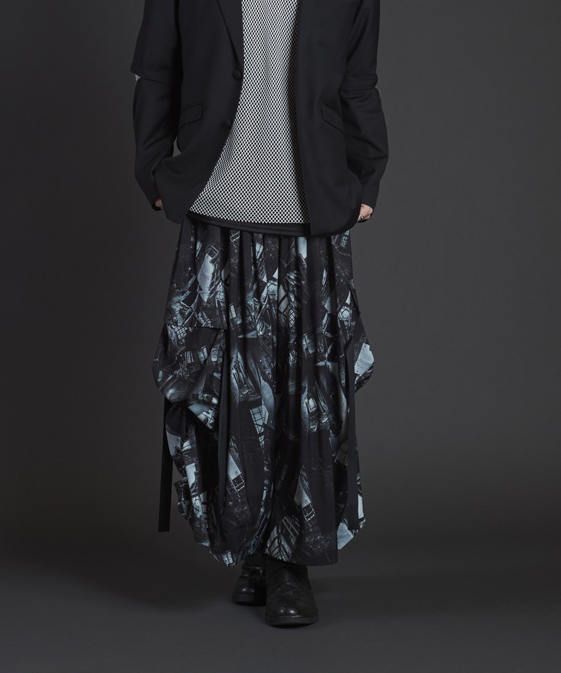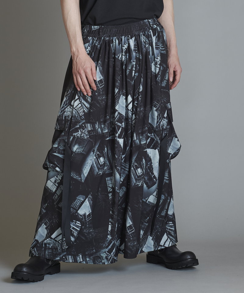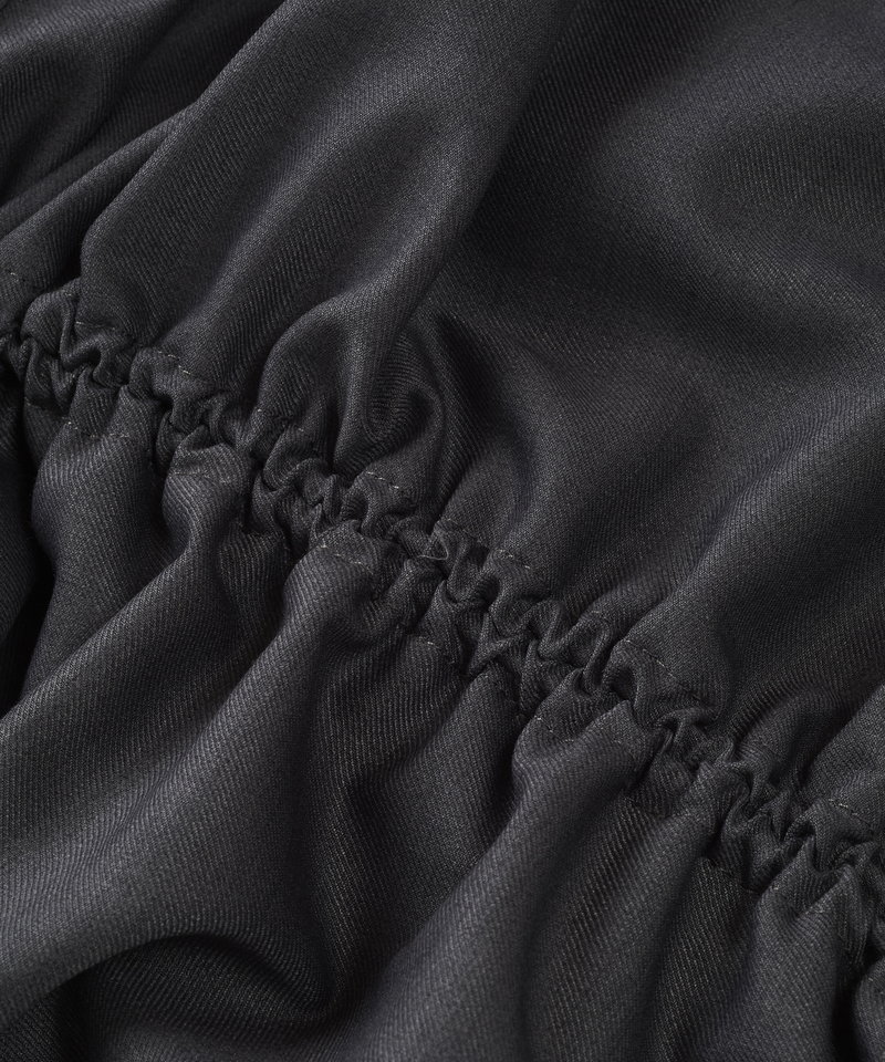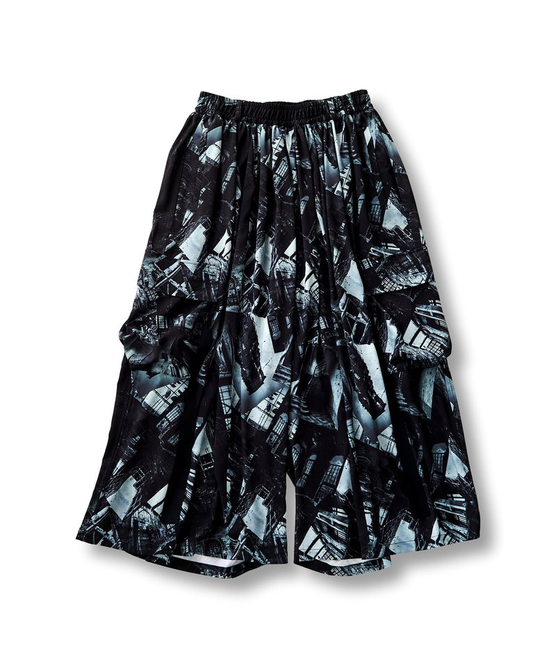 一般的なパンツで使用する生地の3倍近い量を贅沢に使いギャザーで生地を寄せる事でランダムなドレープを描いた躍動感のあるトラウザーズ。
