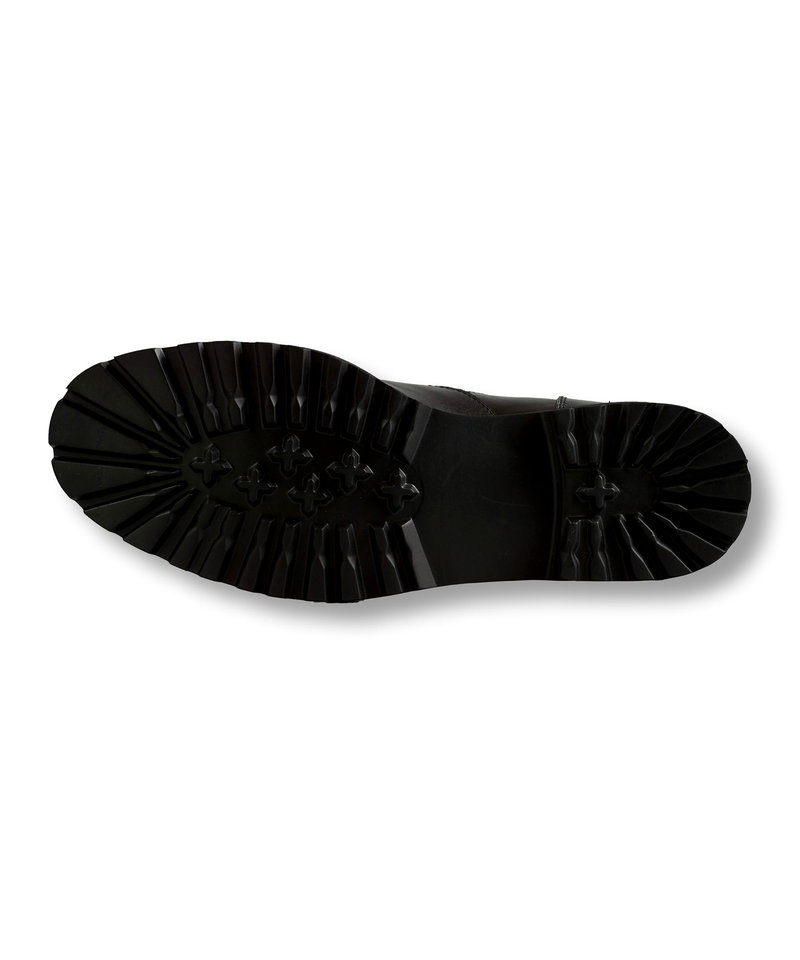 存在感のあるコバの張り出しと、えぐりを入れない直線的なヒールなど、シンプルでありながらボリューム感のあるソールのデザインが秀逸な本作。