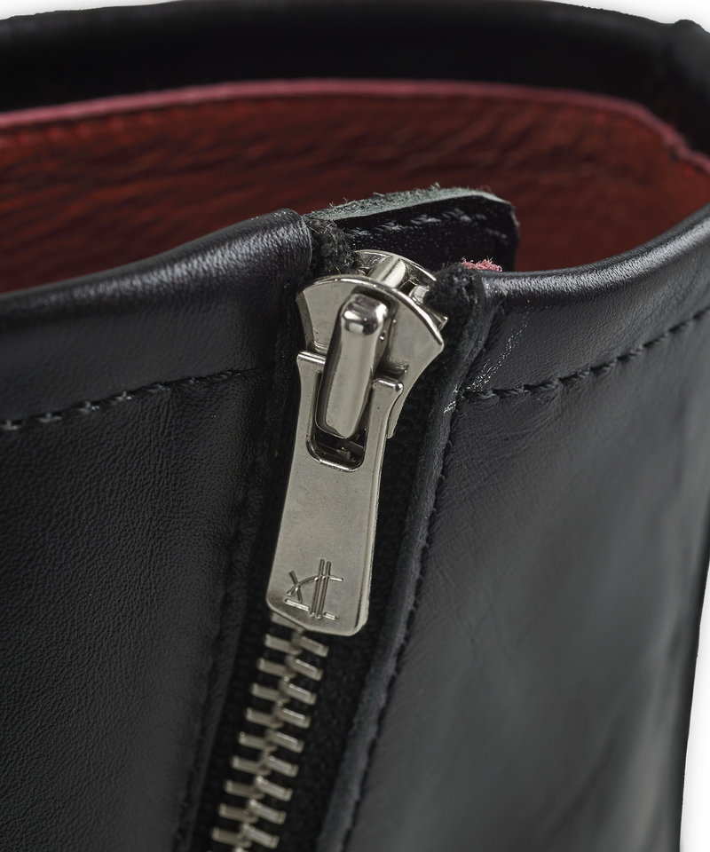 斜めにカーブするように配した内側のファスナーにはYKKのハイエンドモデル【EXCELLA】を採用し、アクセントとして使用する付属への拘りも抜かりない。