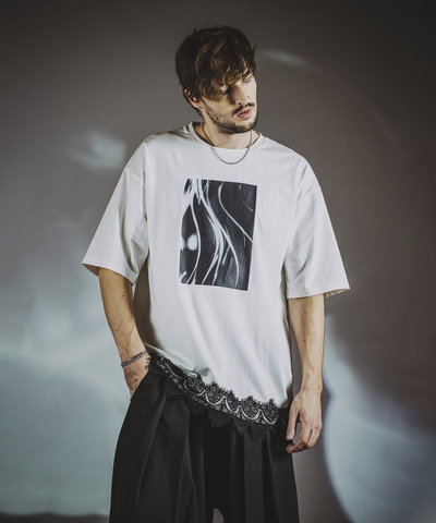 NO ID.のコレクションカタログ作成時に撮影した抽象的なフォトグラフィックをプリントに落とし込みオーバーサイズに仕上げたモードなシャツ。