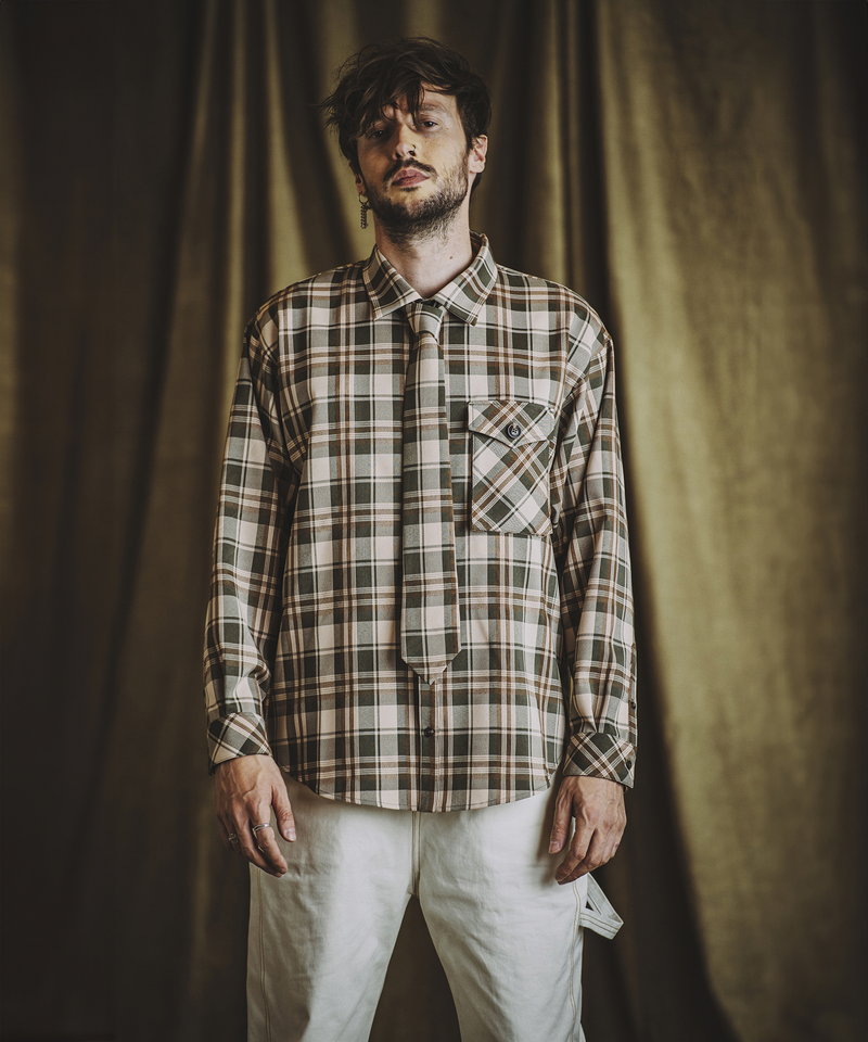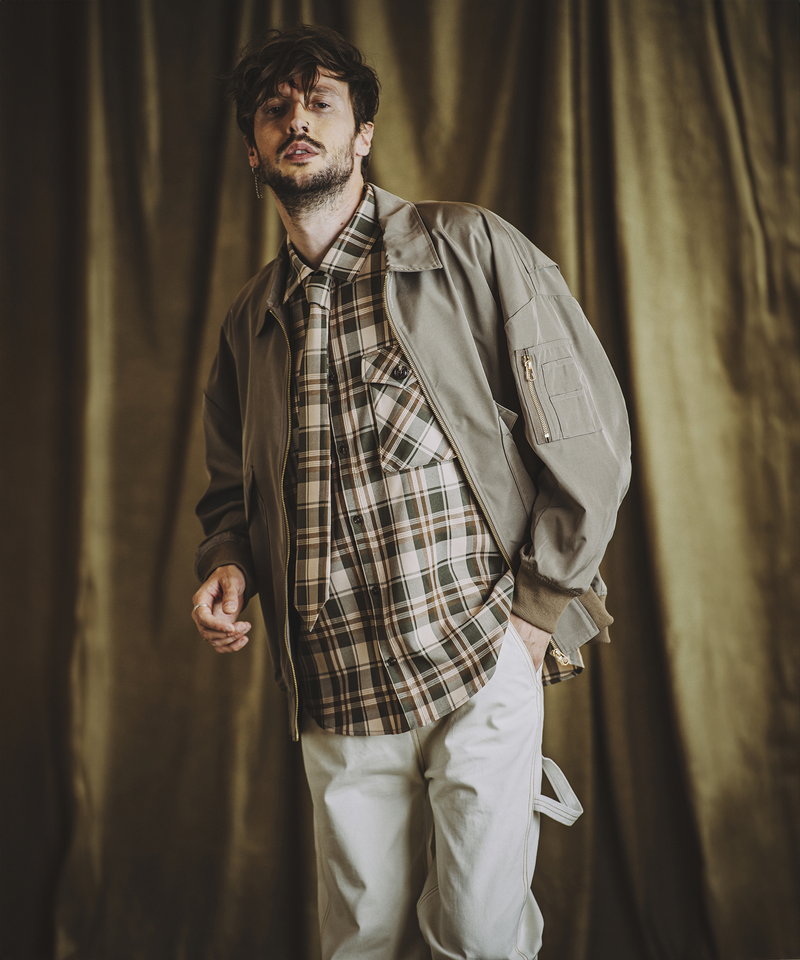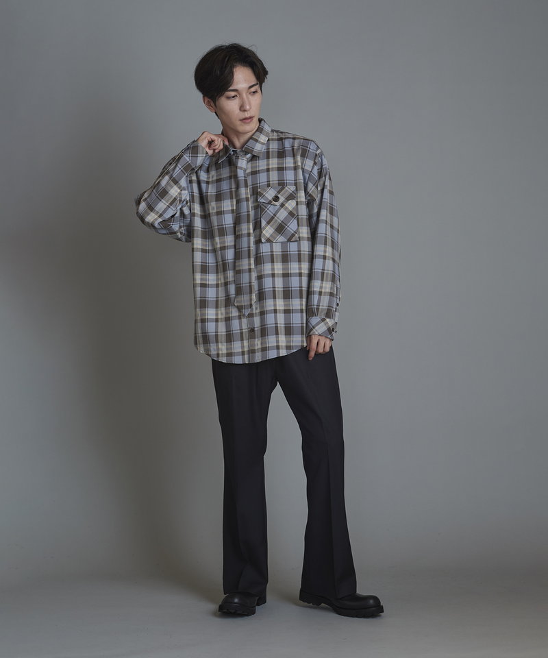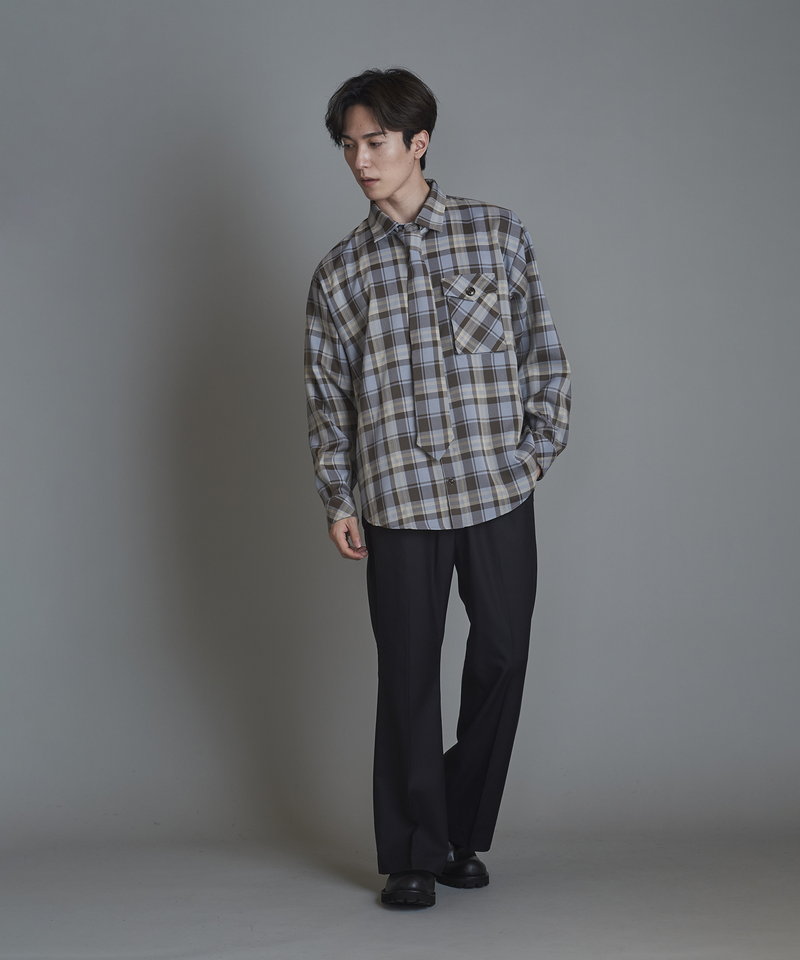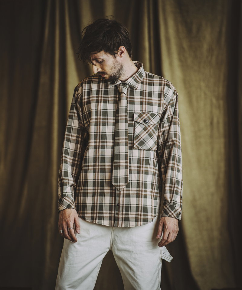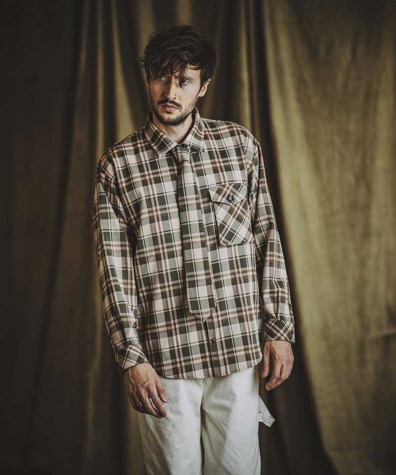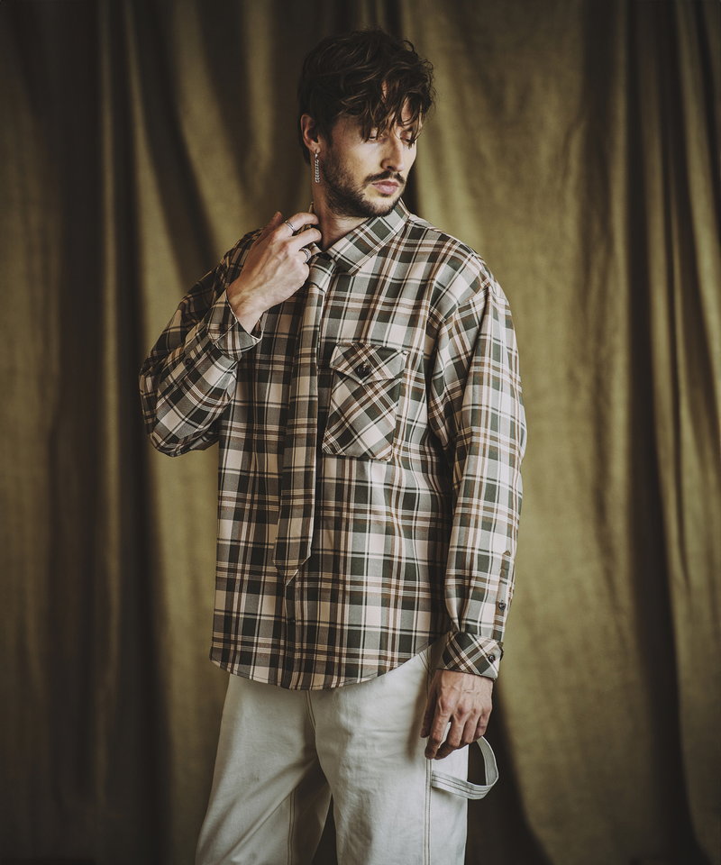 毎シーズン人気を博すネクタイ付きシャツにワークなエッセンスを取り入れたアレンジアイテム。
