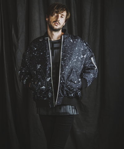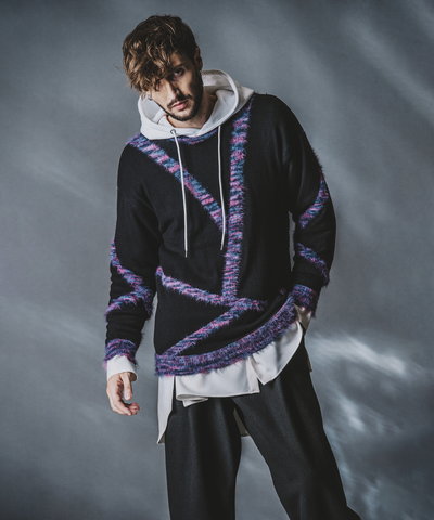 ショルダーラインには薄くパッドを詰める事で構築的な型のシルエットを描きウエストラインは適度に絞る事で逆三角形の男らしいフォルムを生み出している。