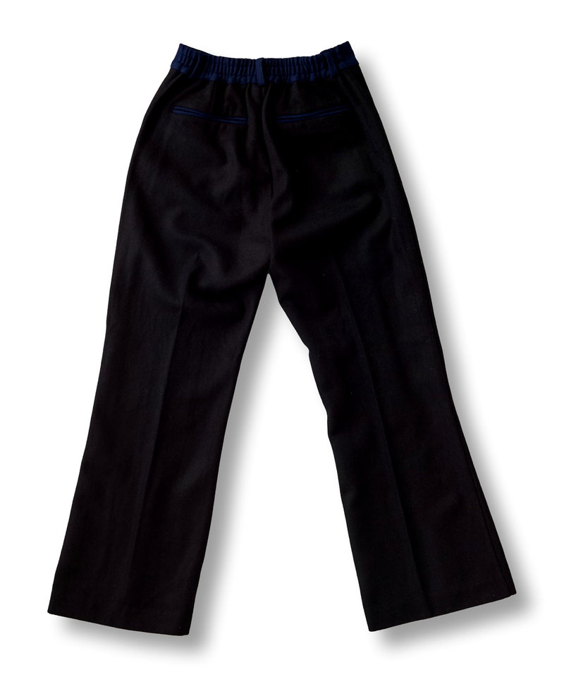 ウエスト後部にはゴムを内蔵しておりベルトレスでも快適な着心地を堪能できるスマートなディテールもポイント。