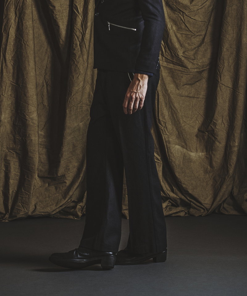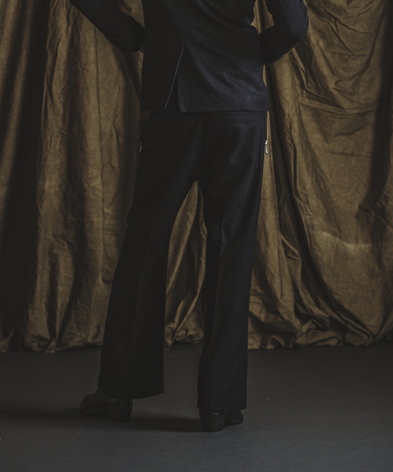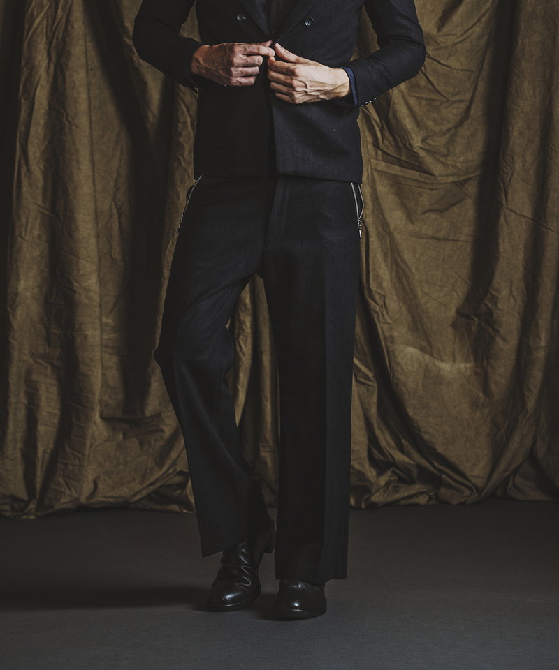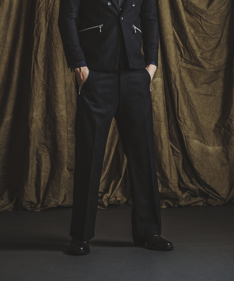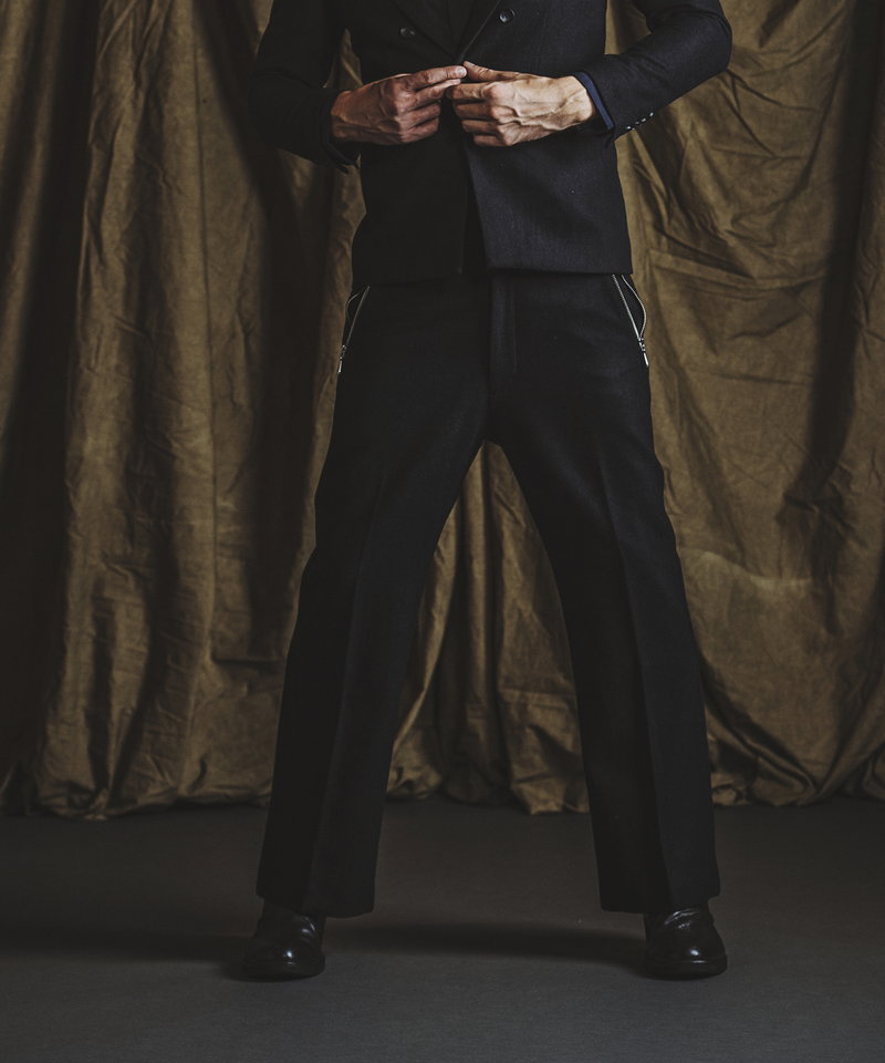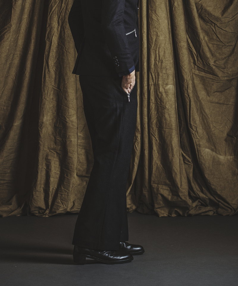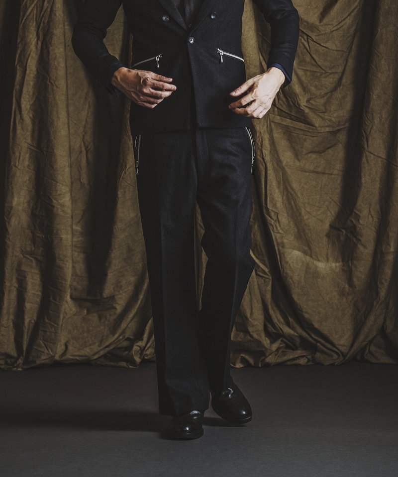 ジャケット同様にフロントポケットをファスナー仕様に変更し存在感のあるアクセントをプラスしたトラウザーズ。