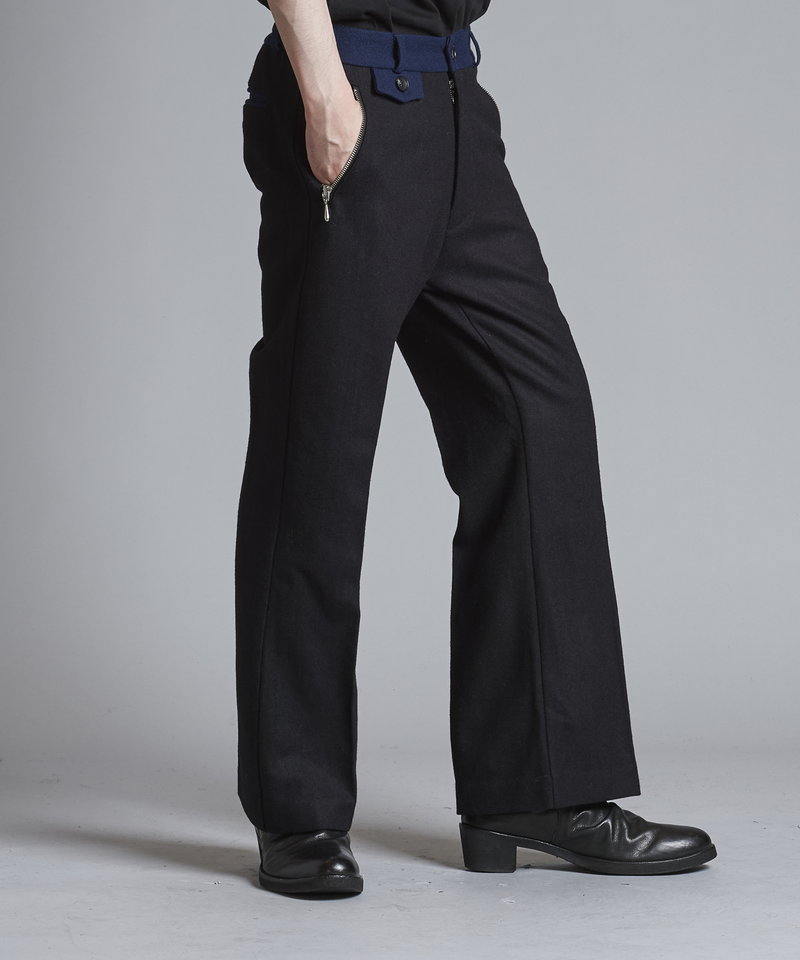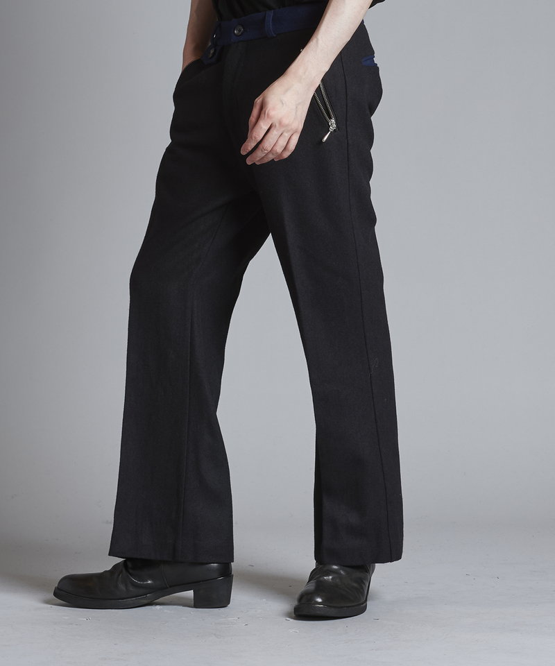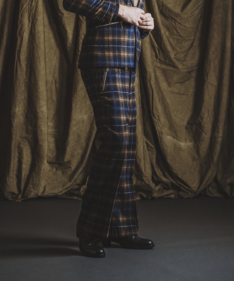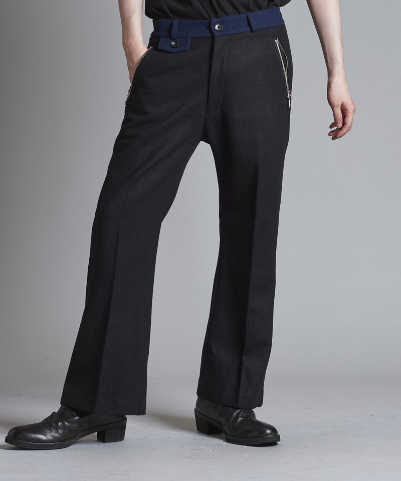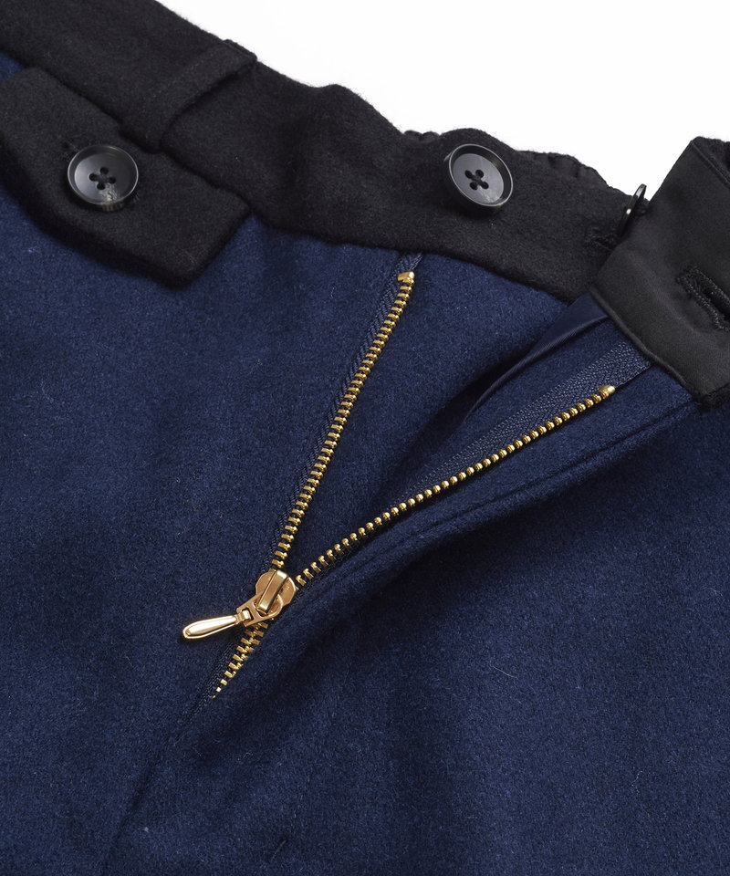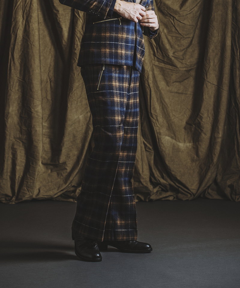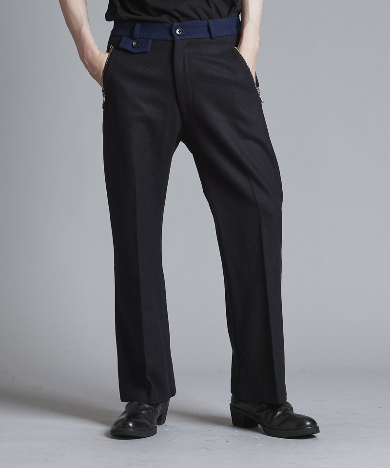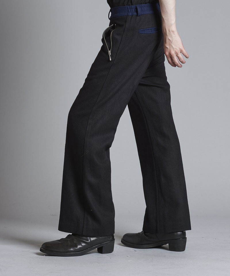 ジャケット同様にフロントポケットをファスナー仕様に変更し存在感のあるアクセントをプラスしたトラウザーズ。