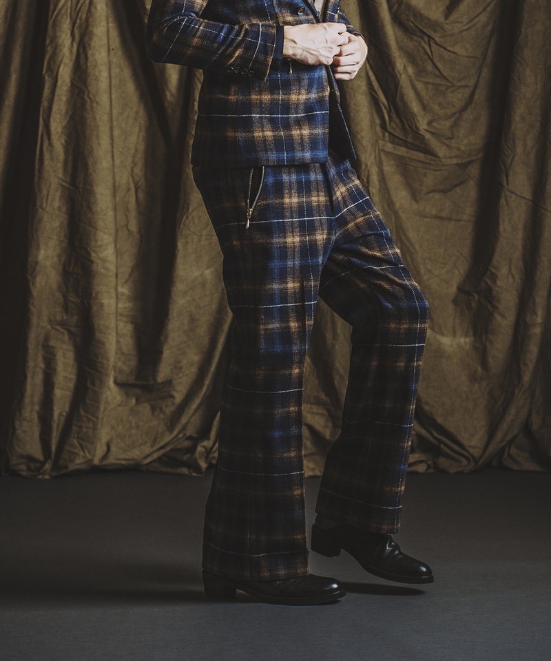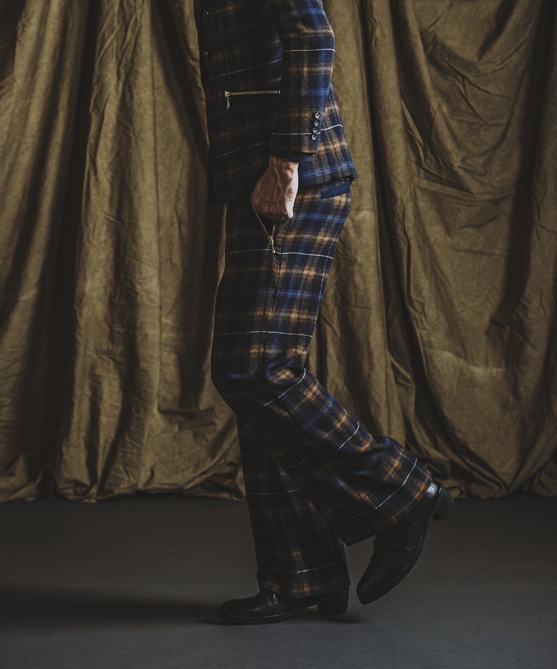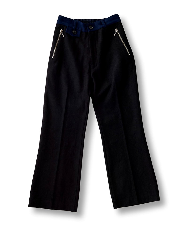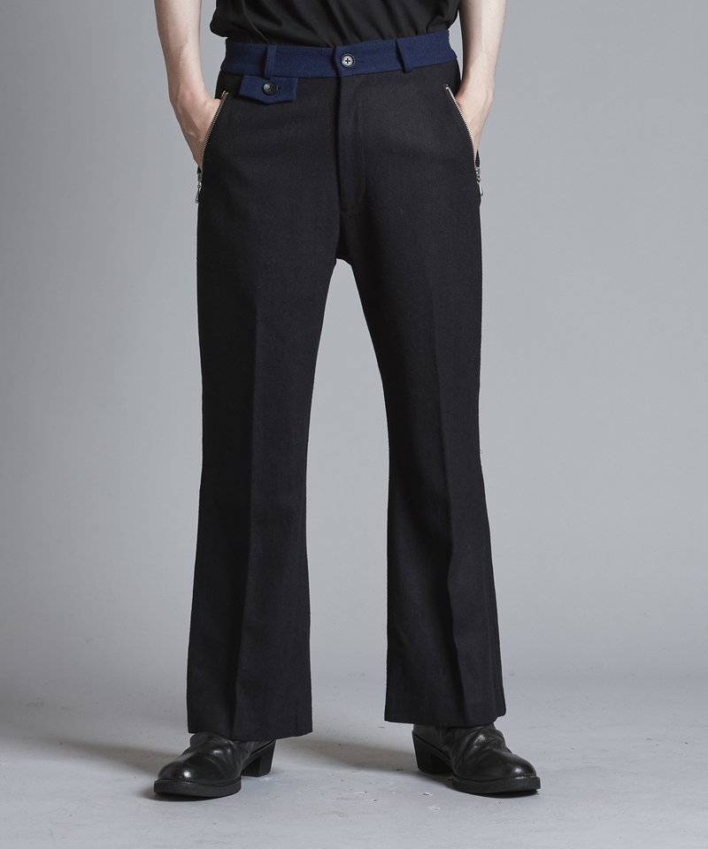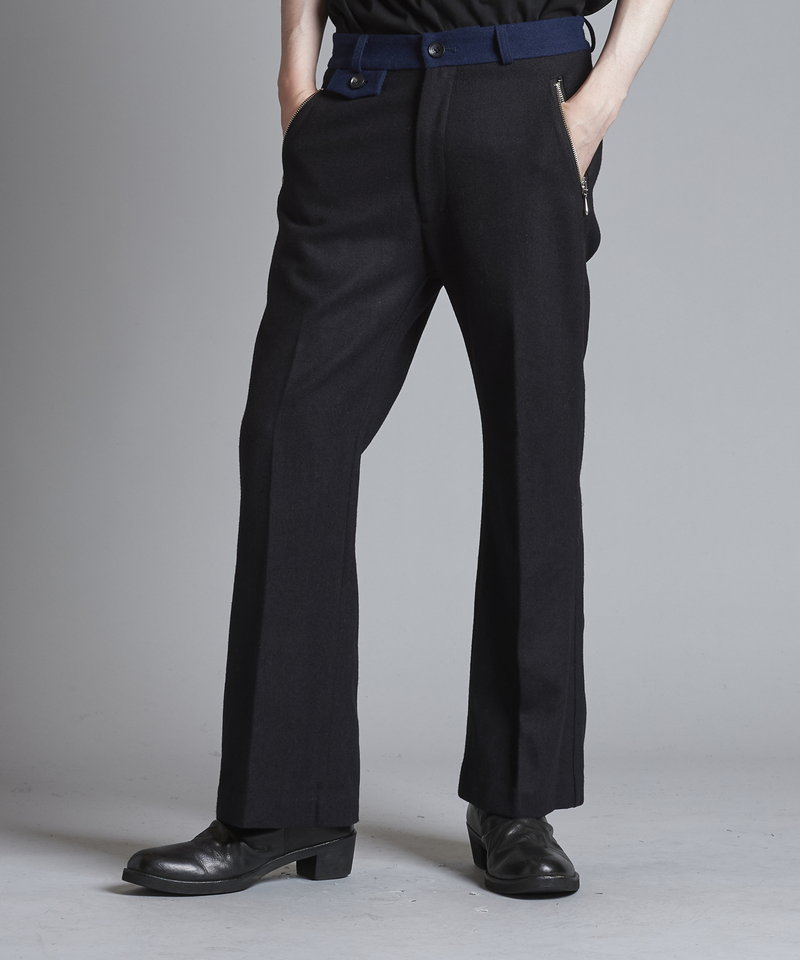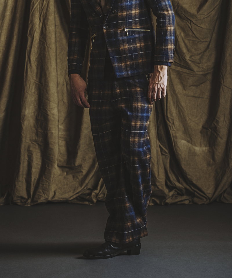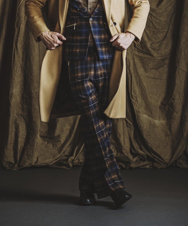 ジャケット同様にフロントポケットをファスナー仕様に変更し存在感のあるアクセントをプラスしたトラウザーズ。
