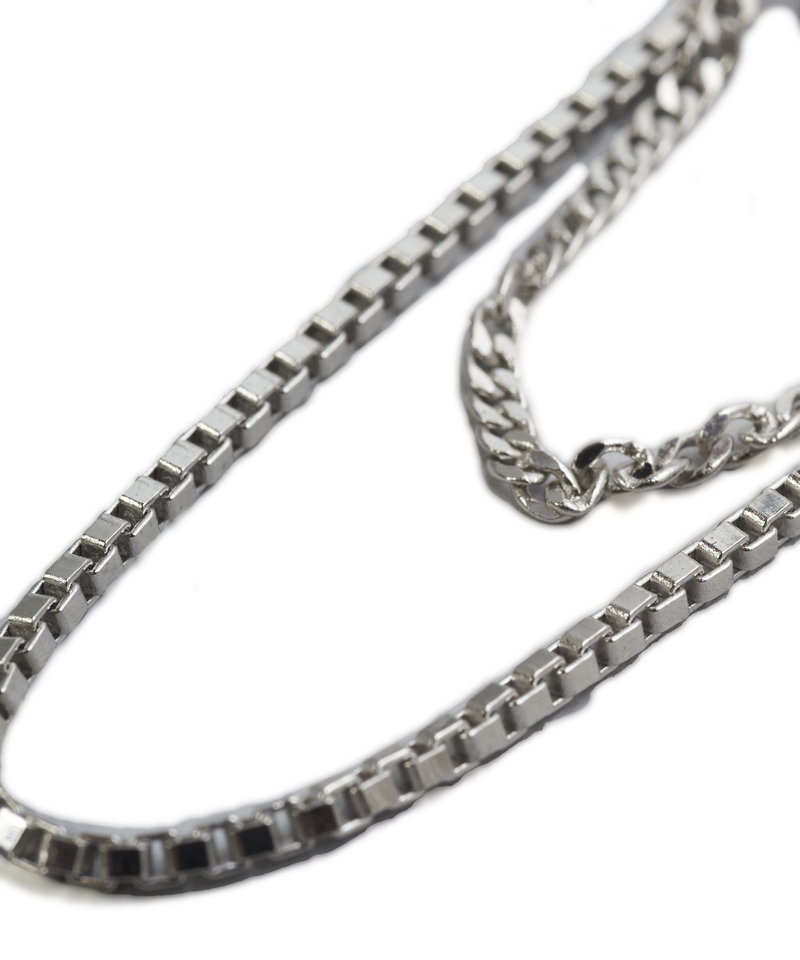 チェーンにはツイストしたフラットリンクチェーンとベネチアンチェーンを組み合わせ、それぞれ異なるデザインと長さのチェーンがスタイリングに程良い変化をプラス。