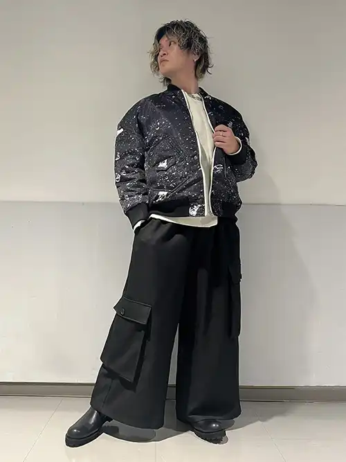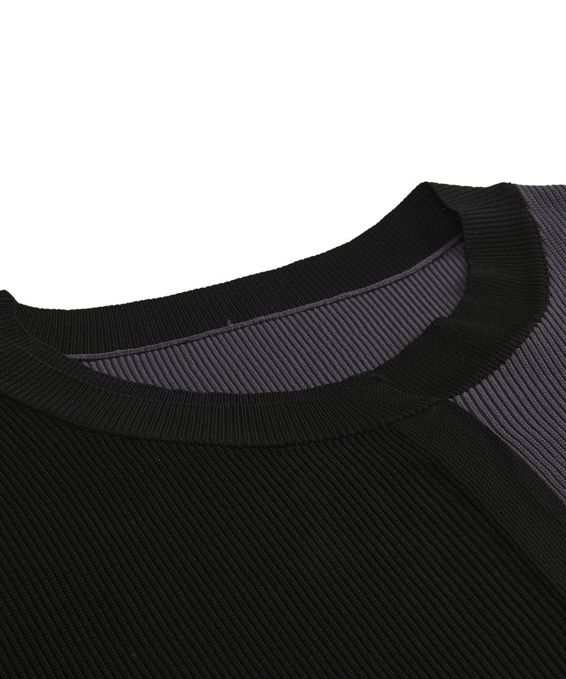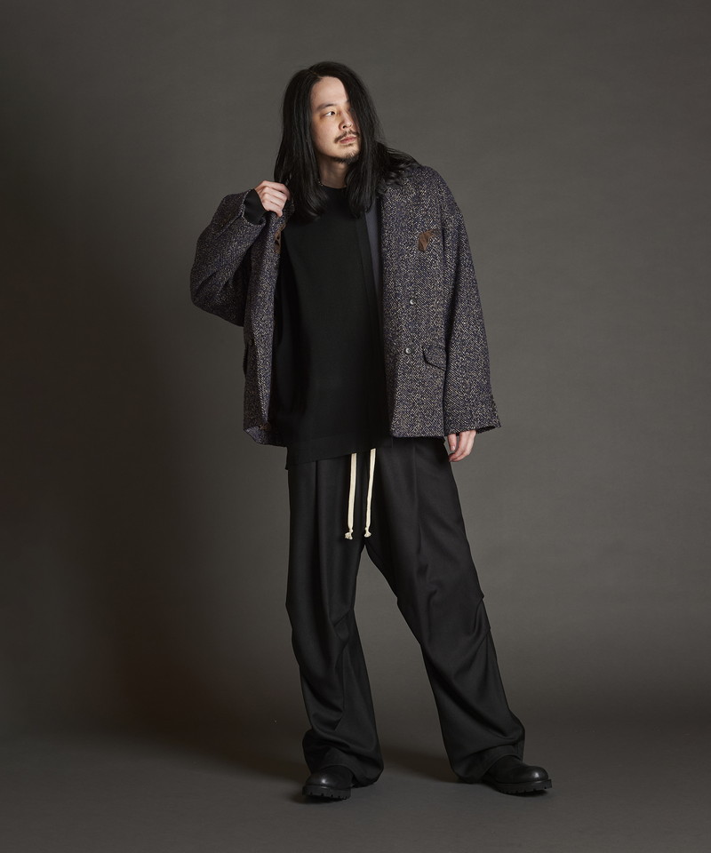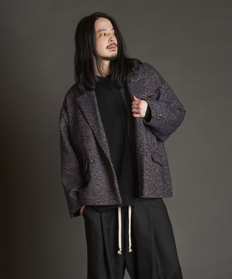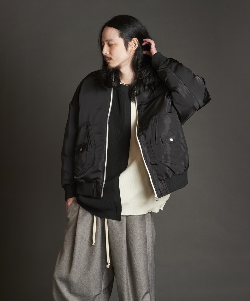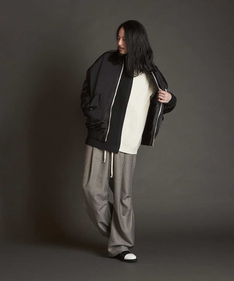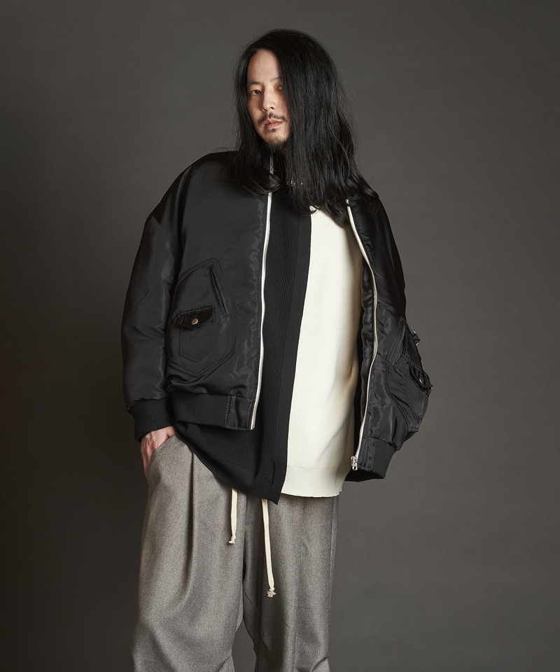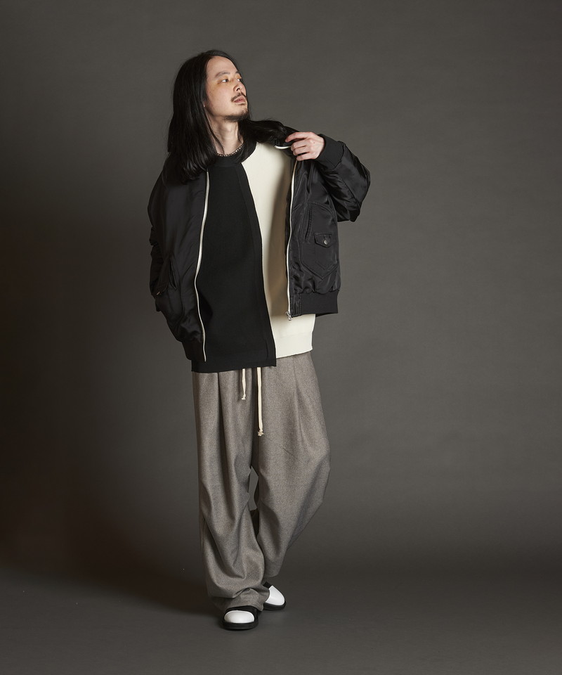 身頃だけでなく、袖口にもバイカラー切替を施し、アウターを羽織った際、両袖から覗く色にも左右で変化を付けた。