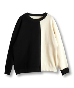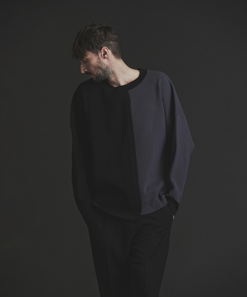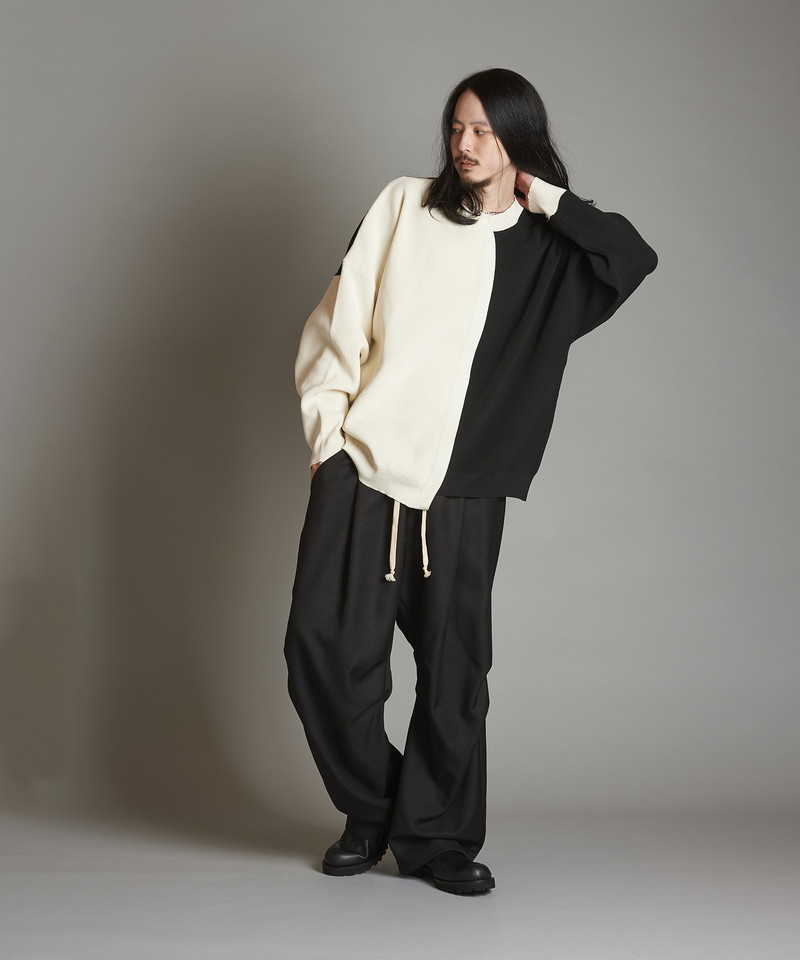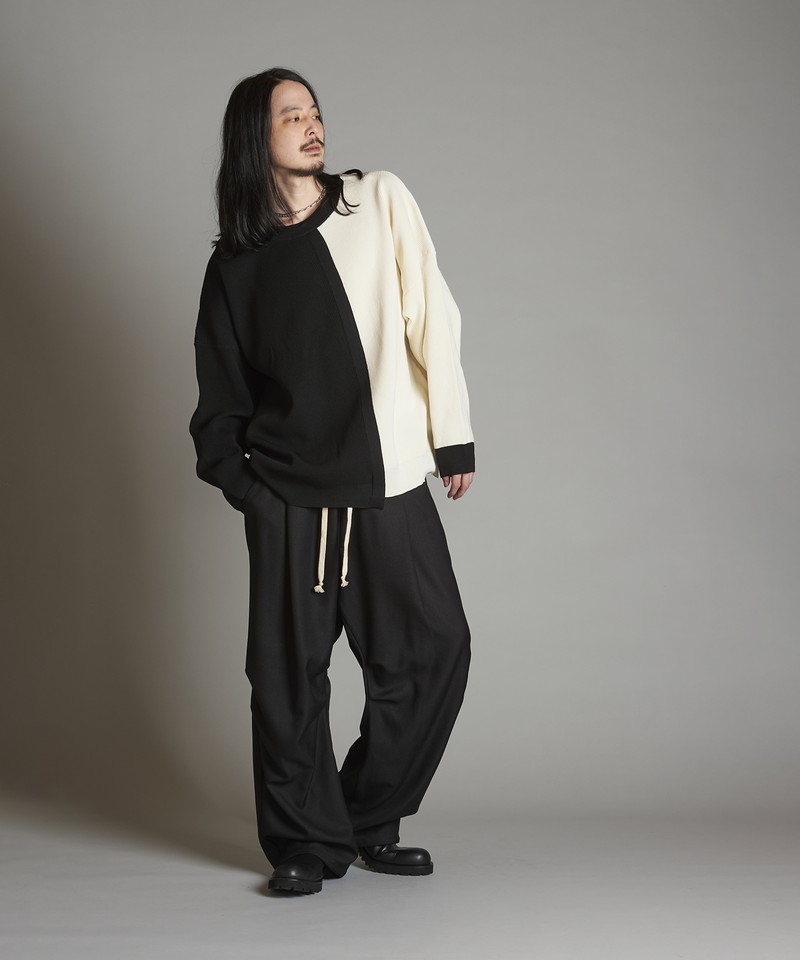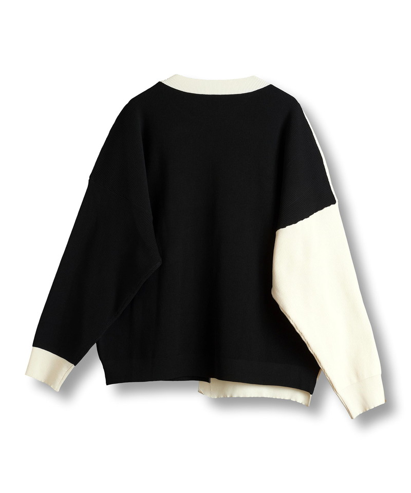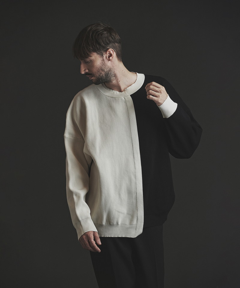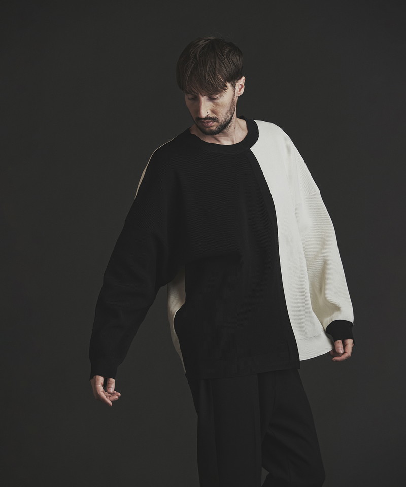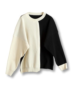 アシンメトリーなレイヤードデザインとバイカラーの切替が目を引くBIGニットプルオーバー。